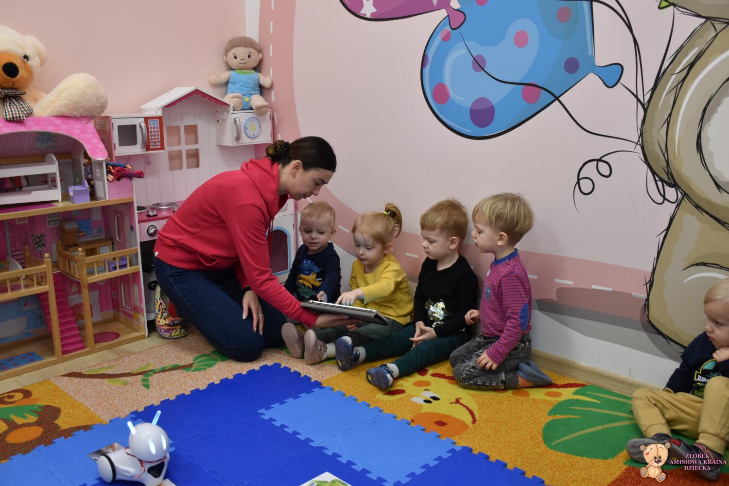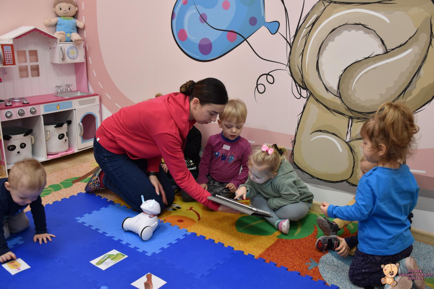 Dzieci wspólnie z robotem i panią Magdą oglądały