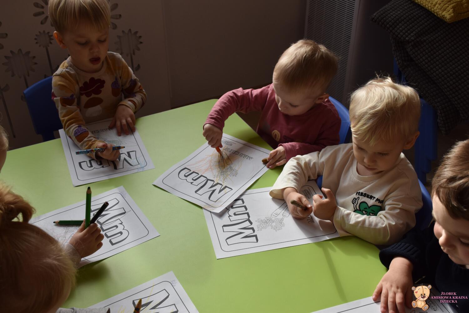 Dziś na zajęciach Literkowo nasze Amisie poznały literę M. Dzieci zapoznały się z jej kształtem potrafiły odszukać ją na żłobkowej tablicy z alfabetem. Poznaliśmy kilka słowek na „m”, a na zakonczenie pomalowaliśmy kolorowankę przypominając sobie dwa kolory: ![]()