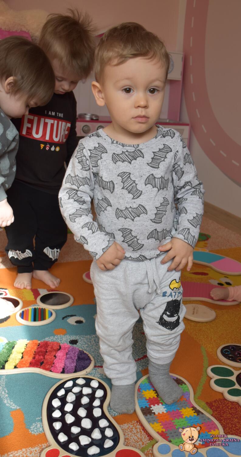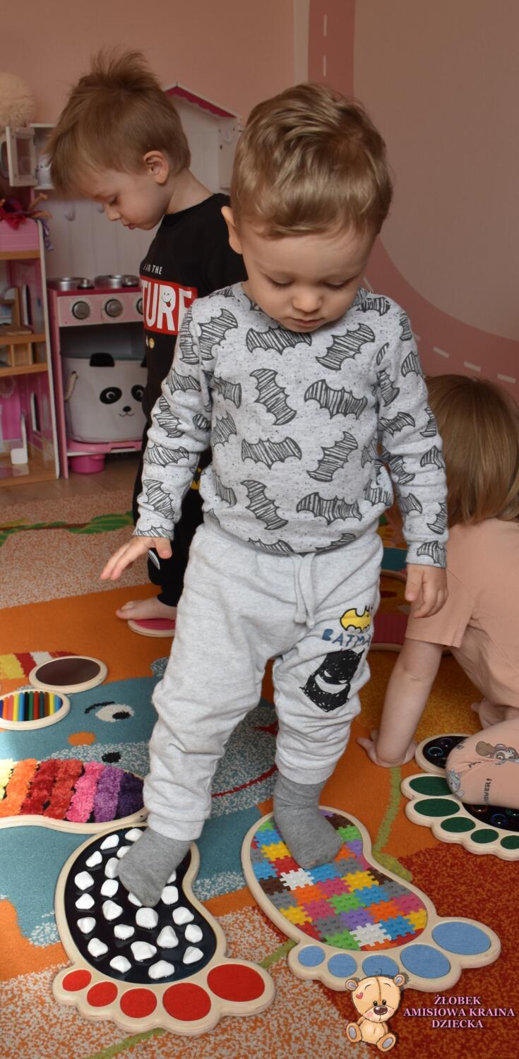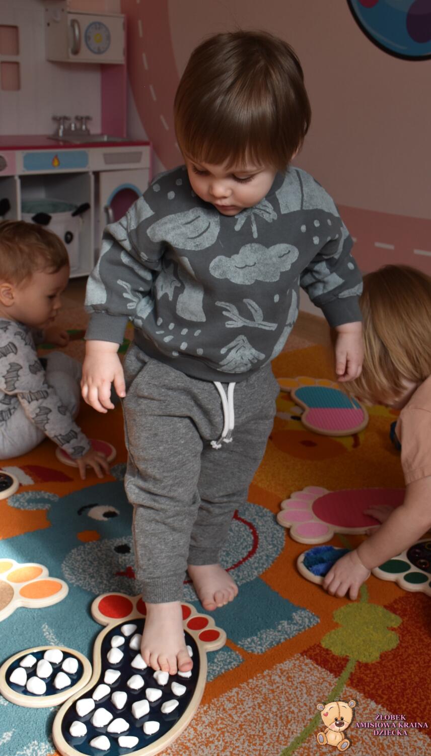 Dziś ciocie zaaranżowały dzieciom wyjątkowa zabawę- spacer po ścieżce sensorycznej Sensory Feet 🙂Dzieci miały okazję przejść bosa stópka po specjalnych podkładkach o różnych fakturach, które stymulowały receptory czuciowe w ich nóżkach. Dzięki temu dzieci rozwijają koordynację wzrokowo- ruchowa oraz równowagę. Dzieci były bardzo zainteresowane poszczególnymi elementami- czekamy na kolejne takie zajecia🙂