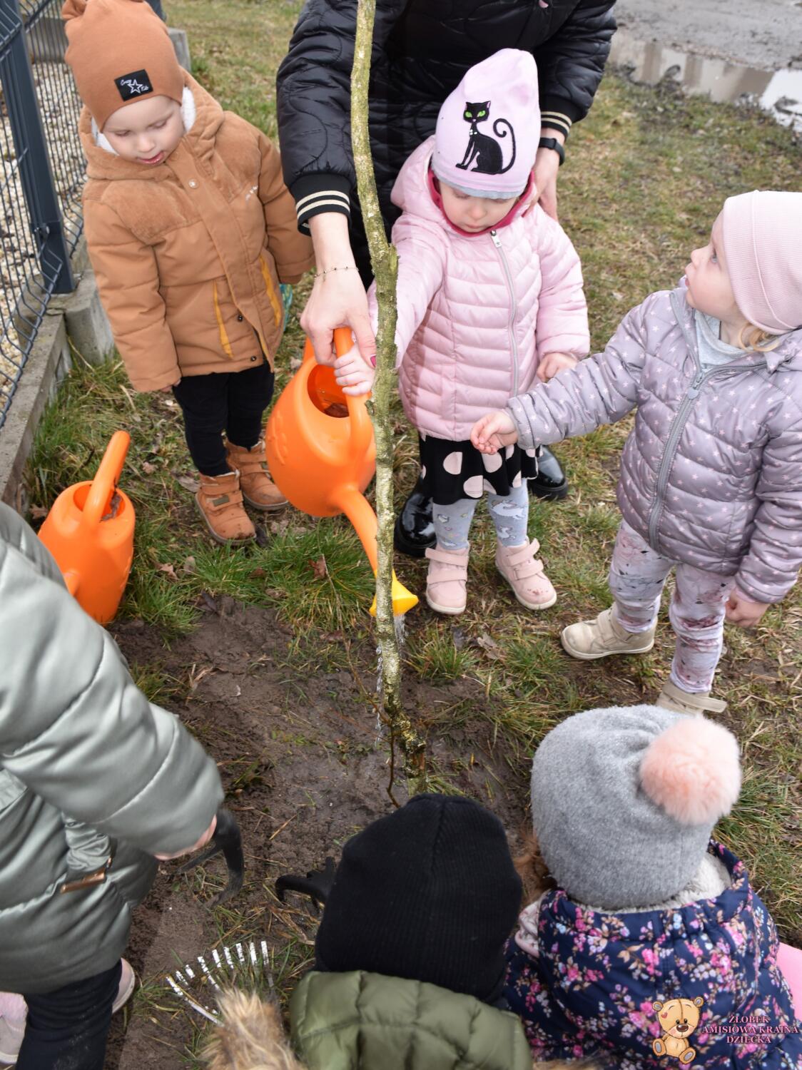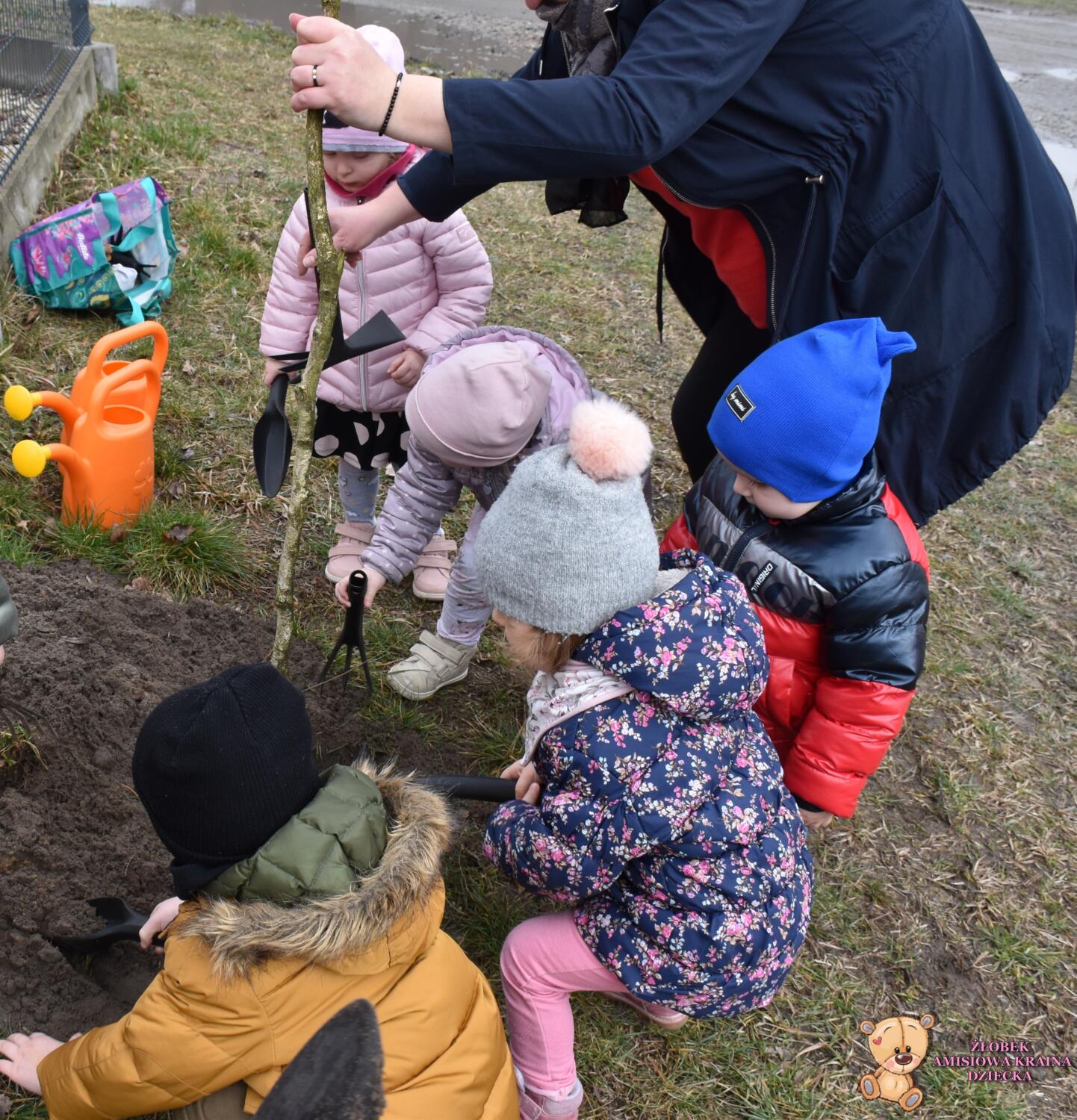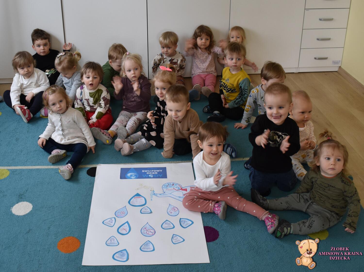 Dziś w naszym żłobku obchodziliśmy Światowy Dzień Wody .Nasze AMIsiaki rozmawiali z ciocia jak oszczędzać wodę .Grupa Niedźwiadków zasadziła z ciocia drzewko ,co było dla nich wielkim wydarzeniem .Za parę lat mogą odwiedzić Amisiową Krainę dziecka i zobaczyć jak pięknie rośnie .Na koniec wykonaliśmy pracę plastyczną ,przy której rozmawialiśmy jak oszczędzać wodę.