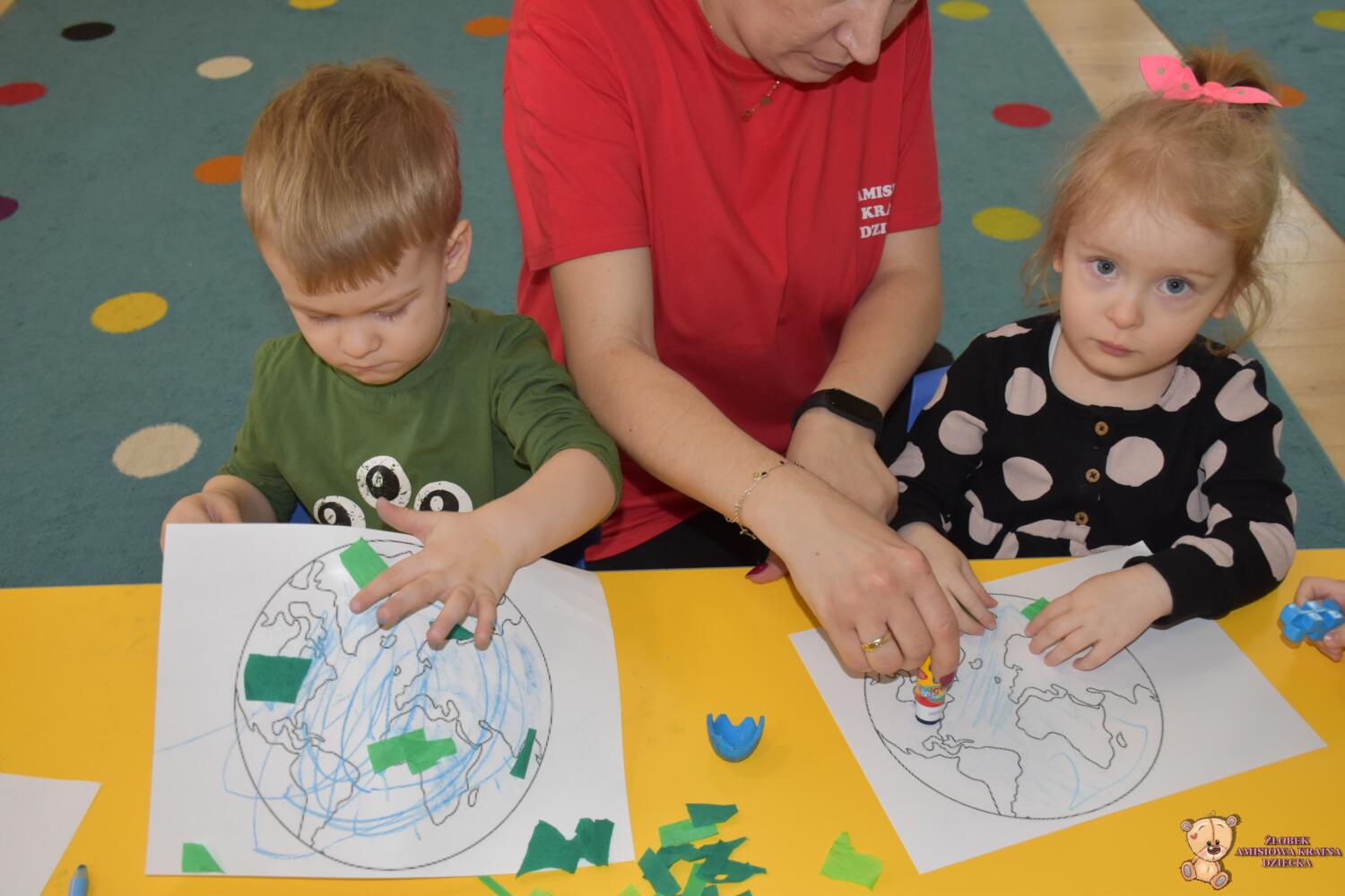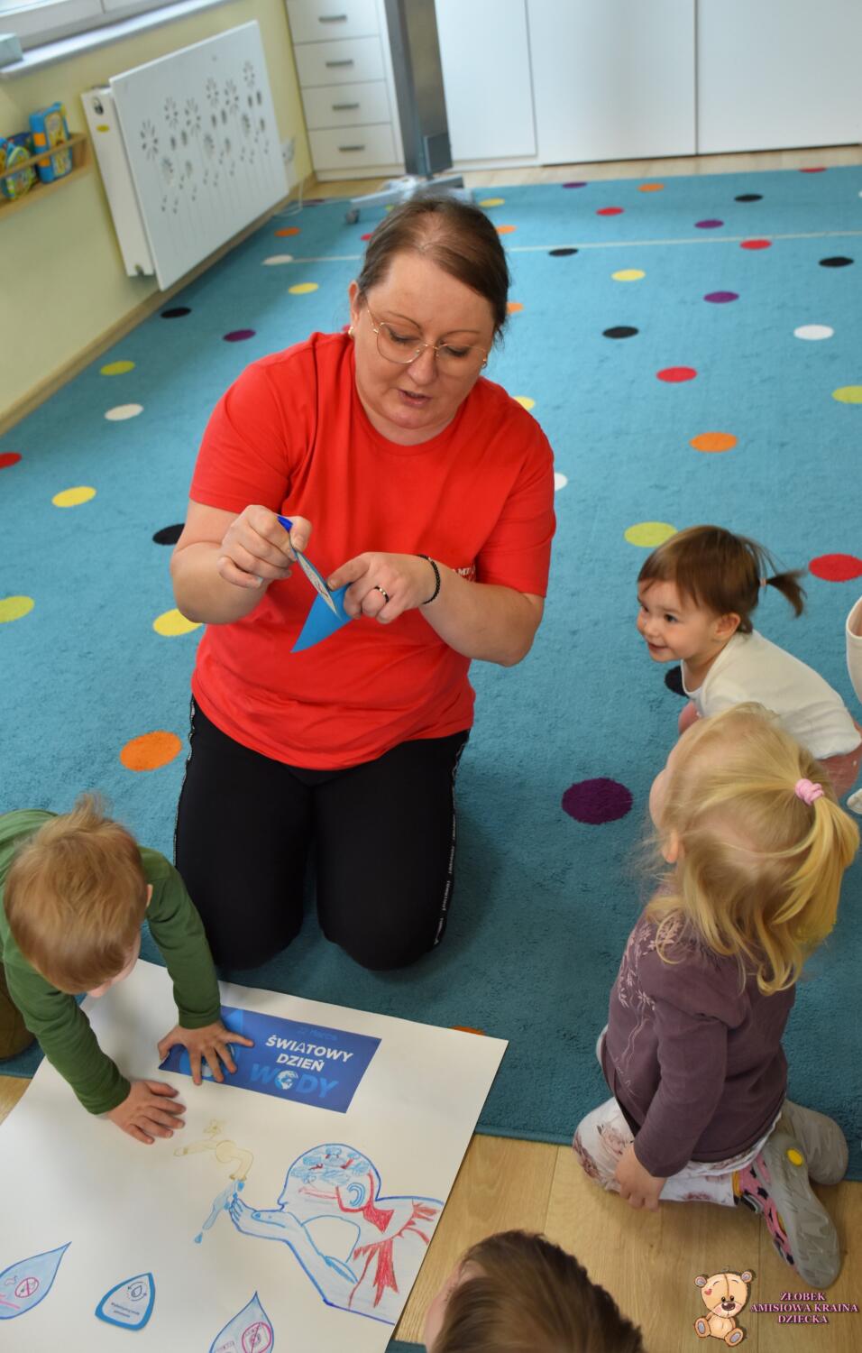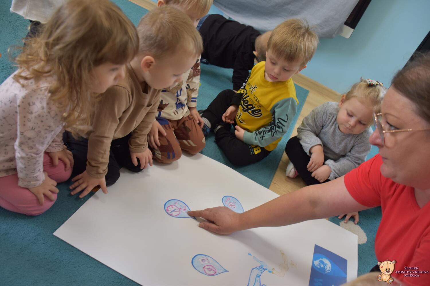 Dziś w naszym żłobku obchodziliśmy Światowy Dzień Wody .Nasze AMIsiaki rozmawiali z ciocia jak oszczędzać wodę .Grupa Niedźwiadków zasadziła z ciocia drzewko ,co było dla nich wielkim wydarzeniem .Za parę lat mogą odwiedzić Amisiową Krainę dziecka i zobaczyć jak pięknie rośnie .Na koniec wykonaliśmy pracę plastyczną ,przy której rozmawialiśmy jak oszczędzać wodę.