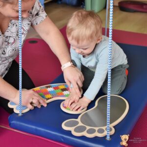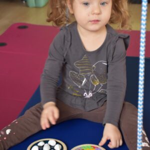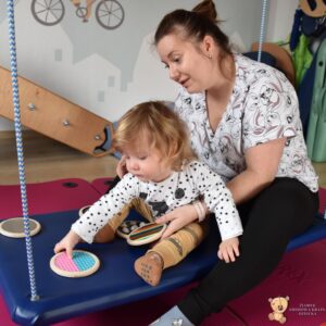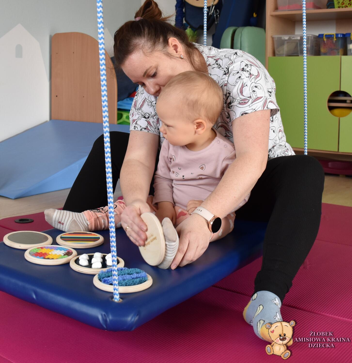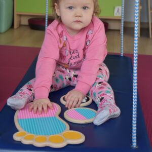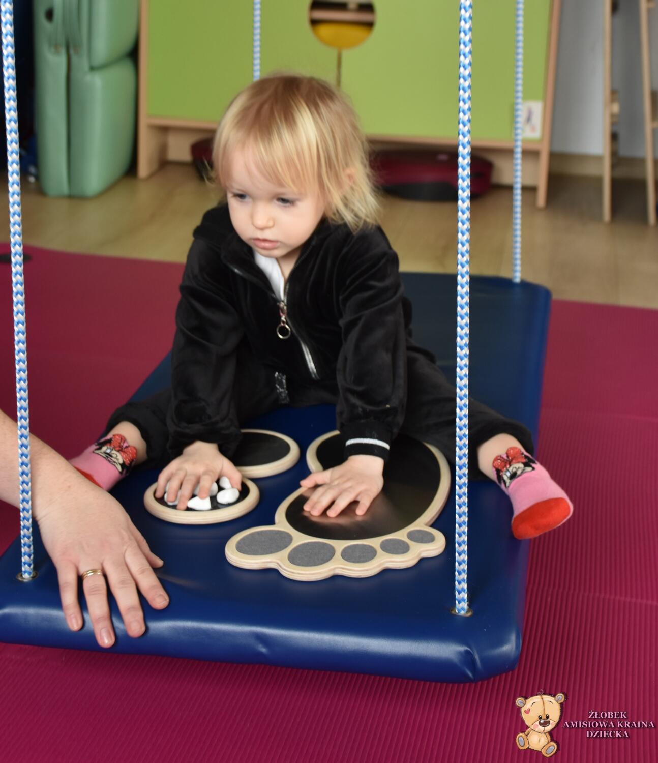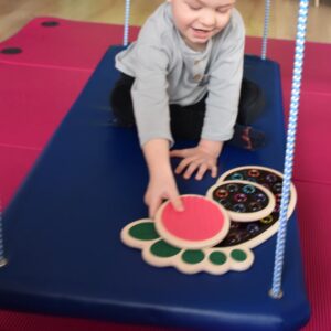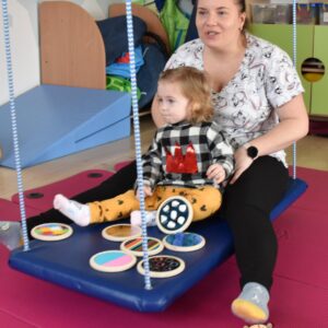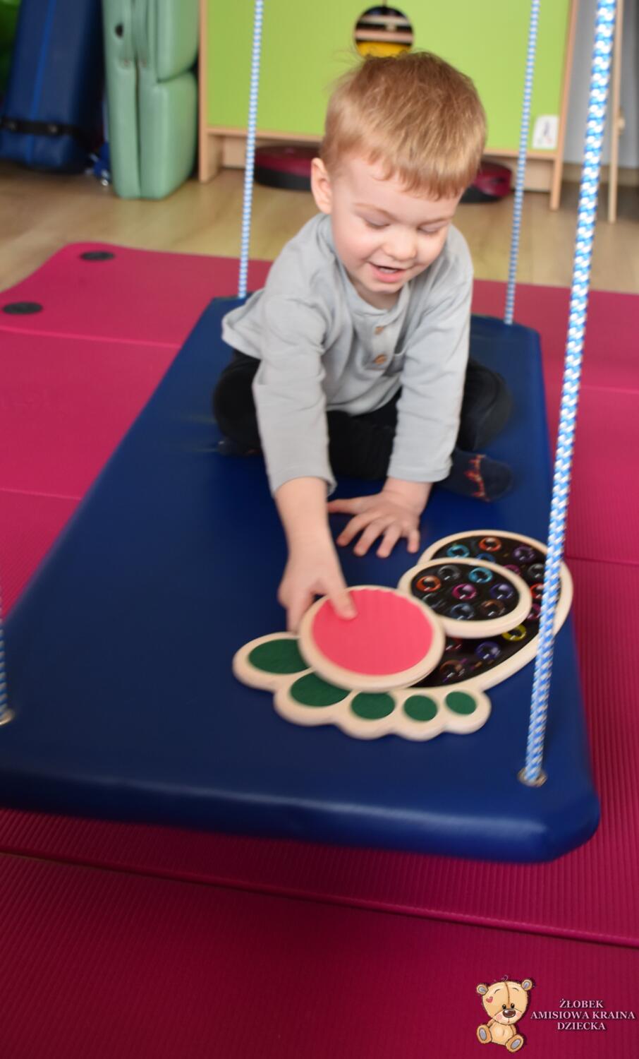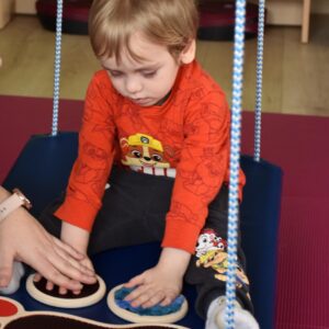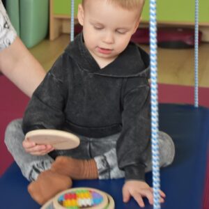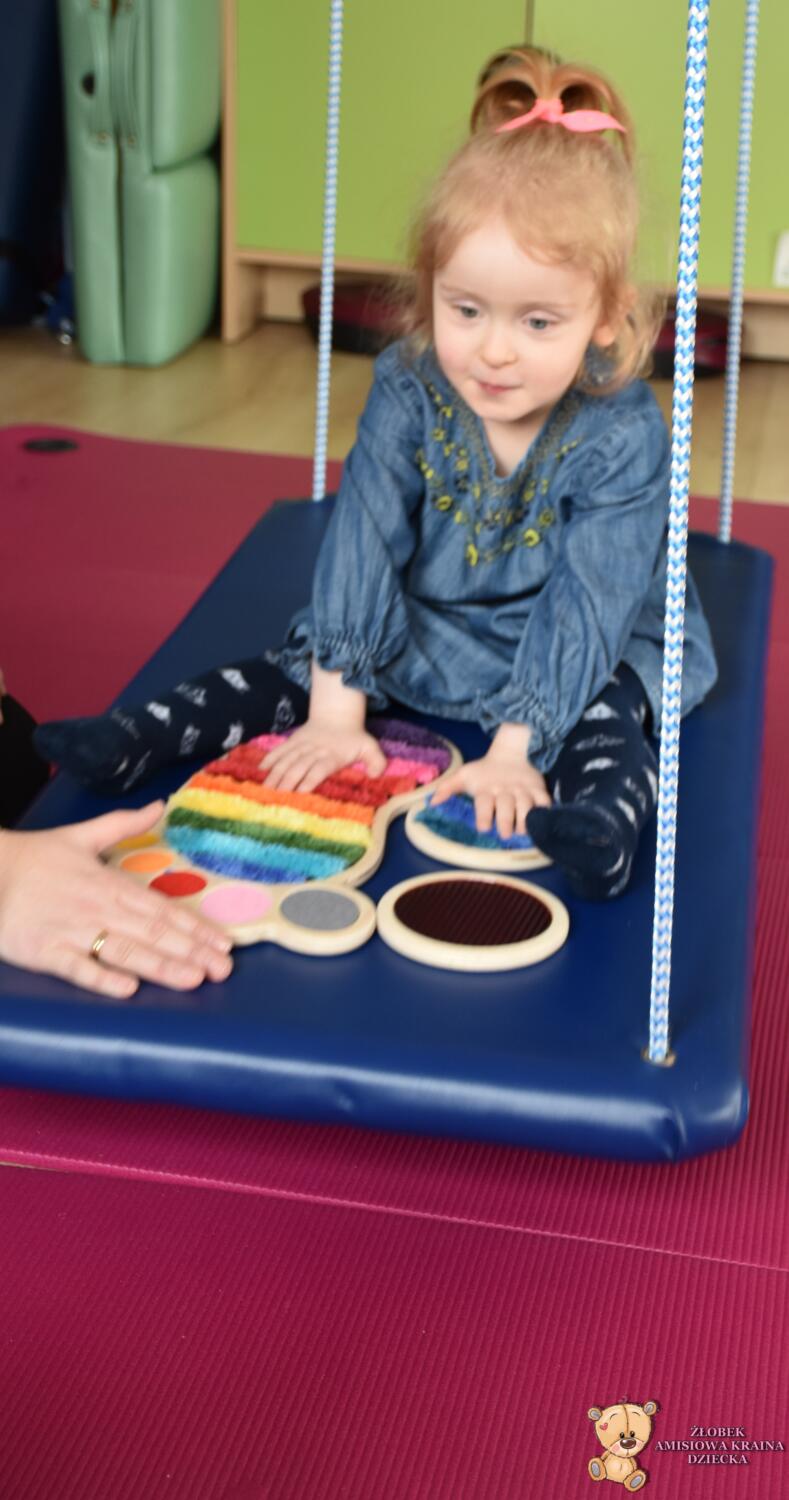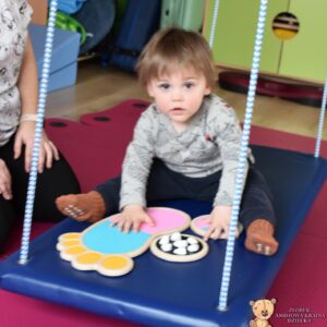 Dziś na zajęciach Integracji Sensorycznej Amisiaki stymulowały układ przedsionkowy, równowagę oraz dotyk. Ciocia łagodnie nas huśtała, a Dzieci dotykały dysków sensoryczych  i szukały takich samych. Trzeba było wygodnie usiąść na platformie, utrzymać równowagę podczas ćwiczeń. Amisiaki były zaciekawione i bardzo zaangażowane. Super!
