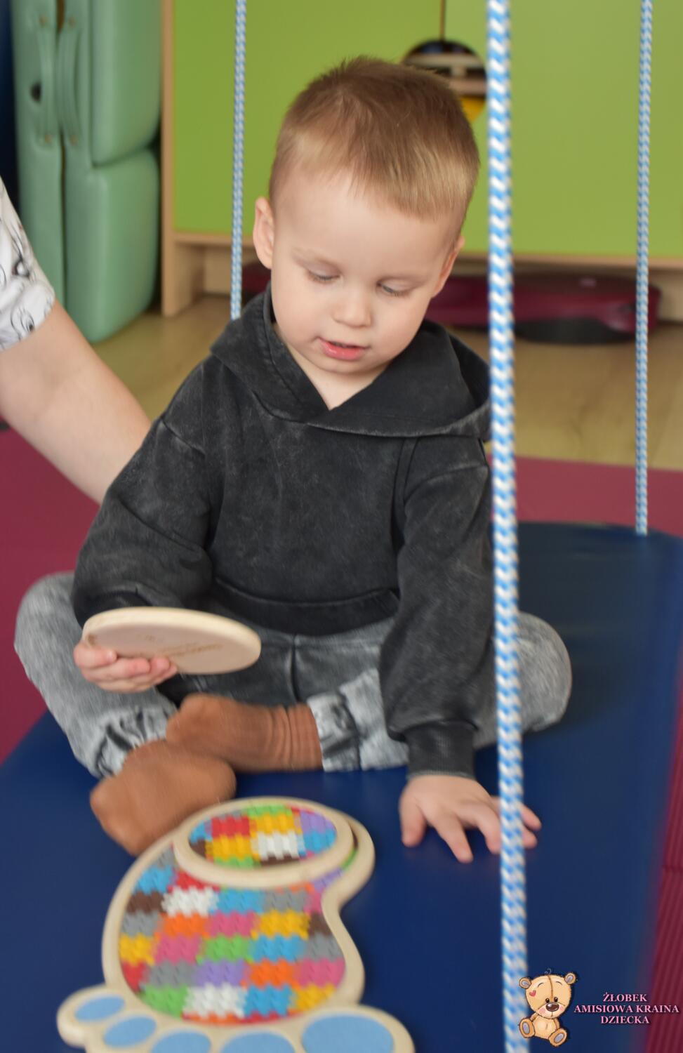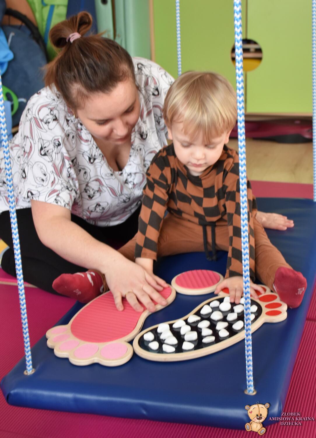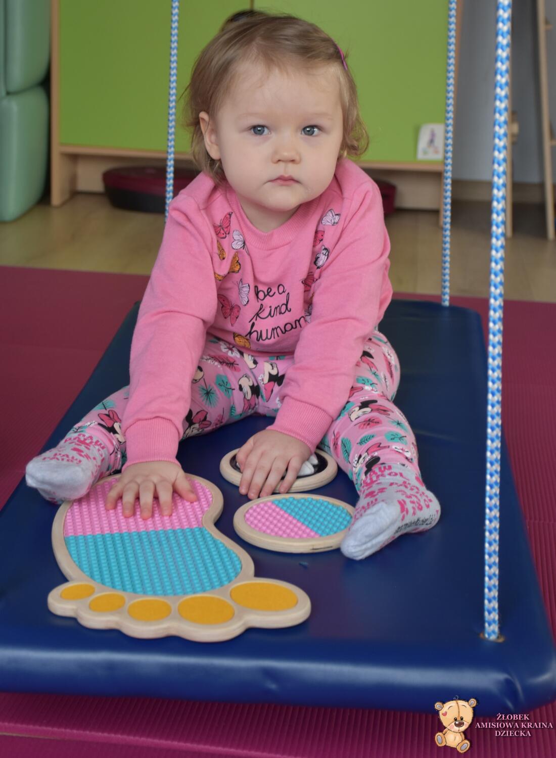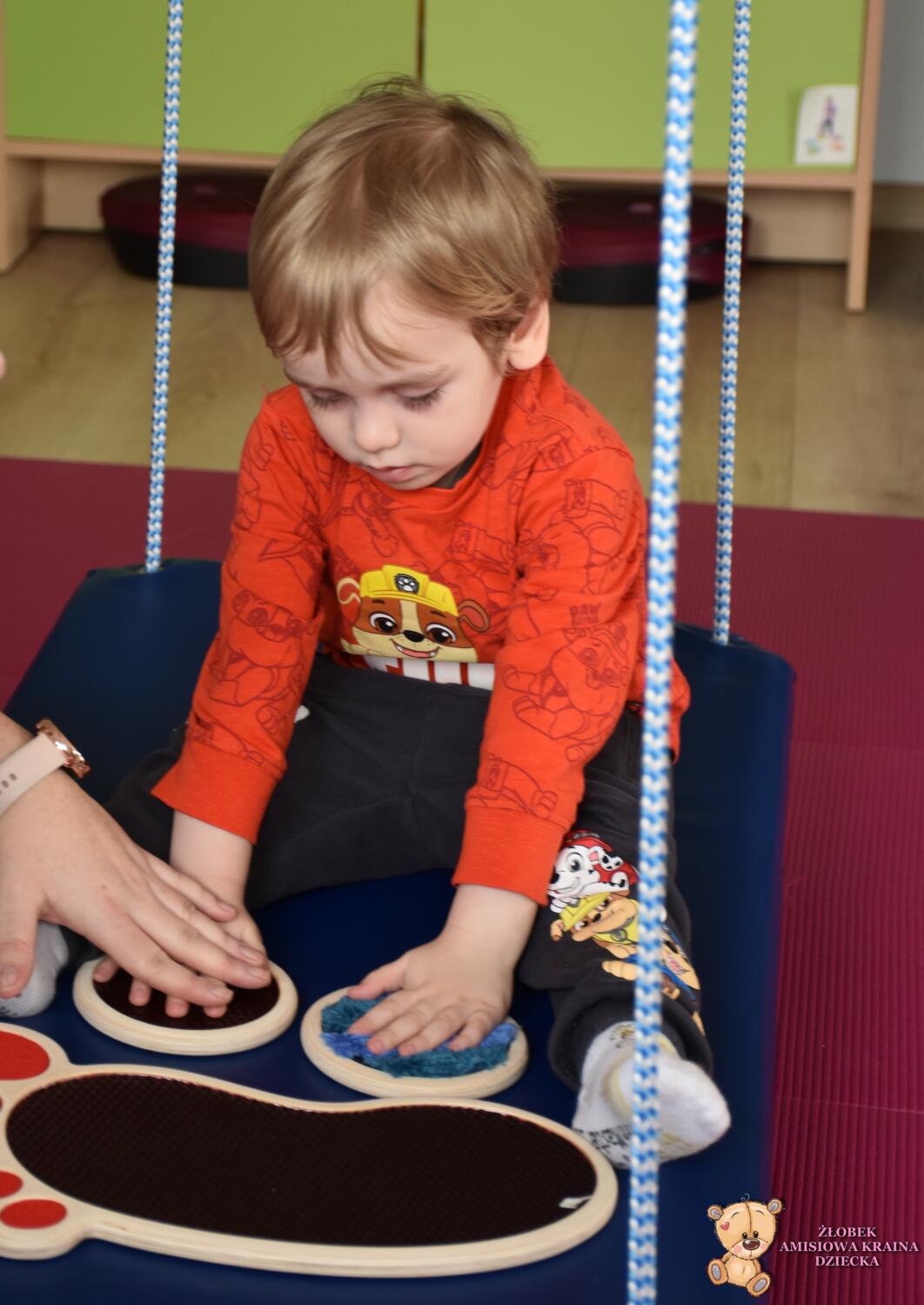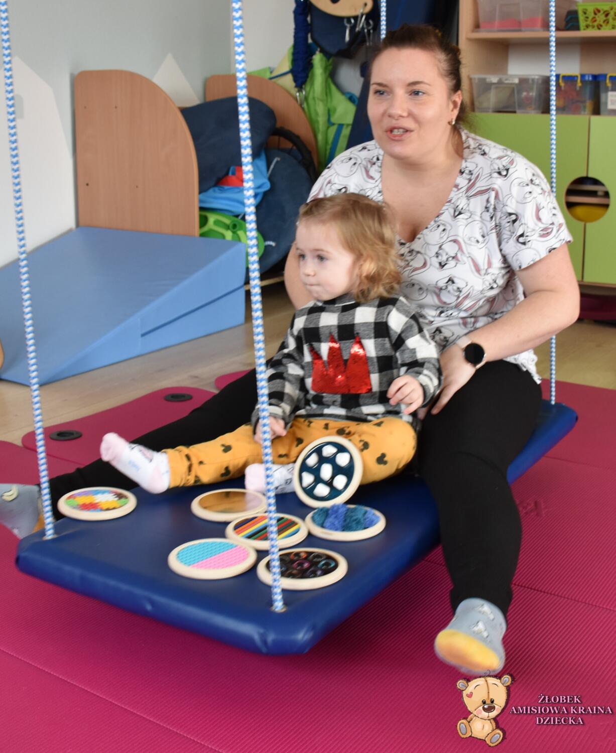 Dziś na zajęciach Integracji Sensorycznej Amisiaki stymulowały układ przedsionkowy, równowagę oraz dotyk. Ciocia łagodnie nas huśtała, a Dzieci dotykały dysków sensoryczych  i szukały takich samych. Trzeba było wygodnie usiąść na platformie, utrzymać równowagę podczas ćwiczeń. Amisiaki były zaciekawione i bardzo zaangażowane. Super!
