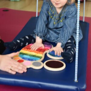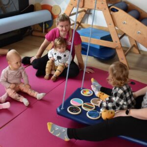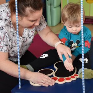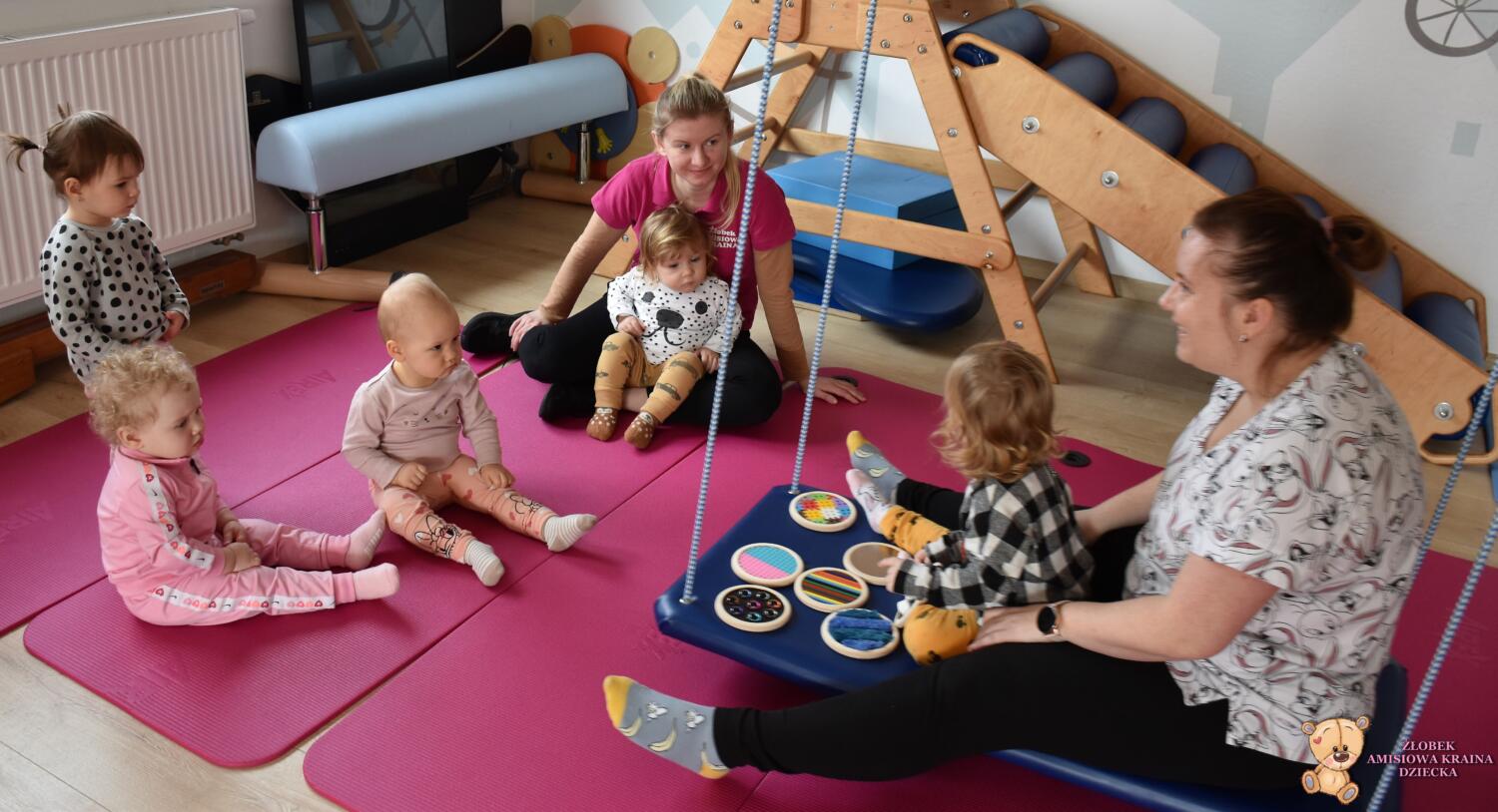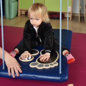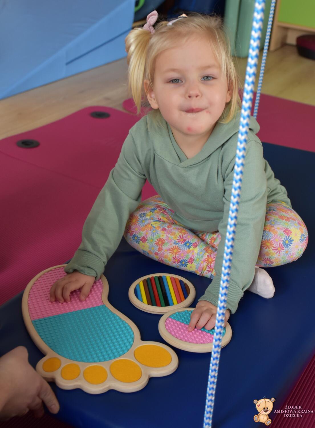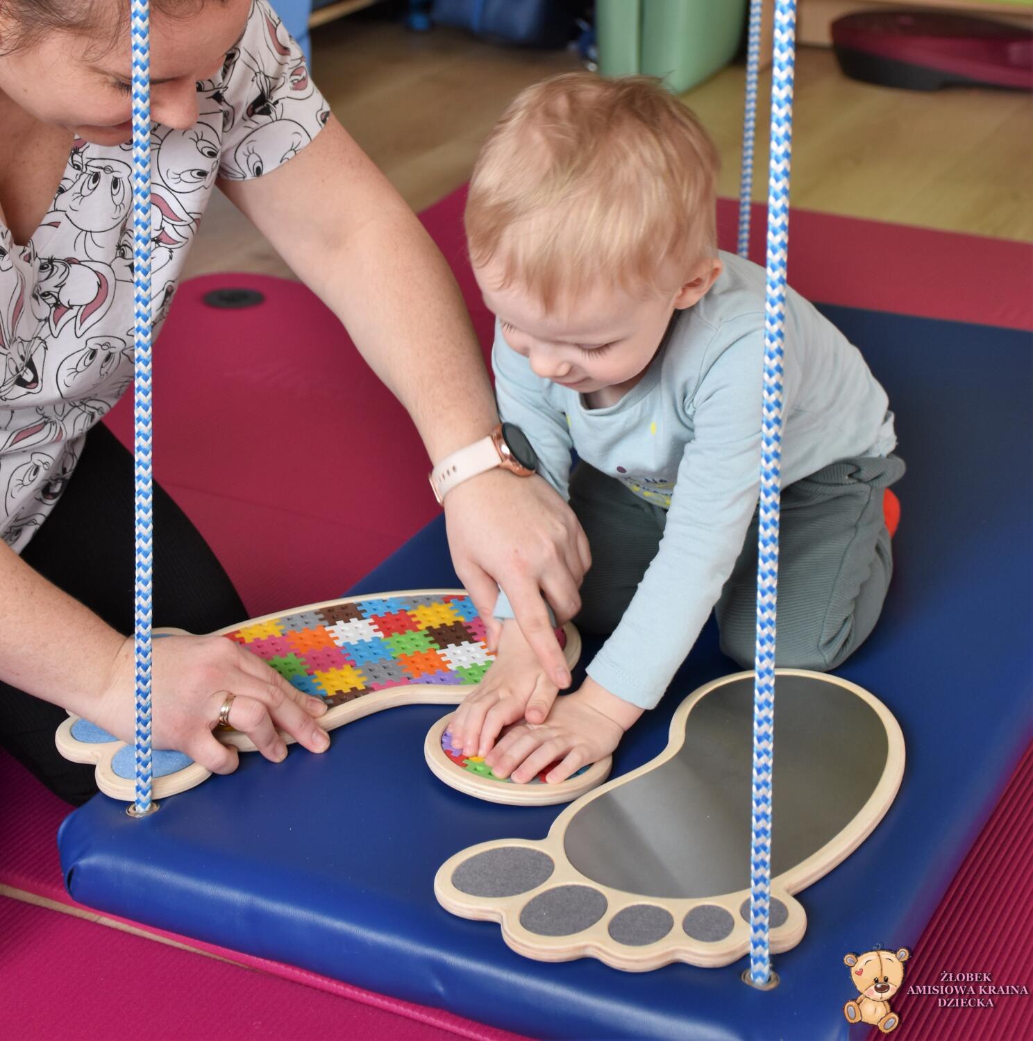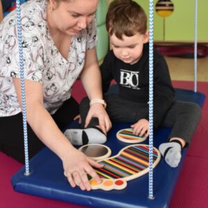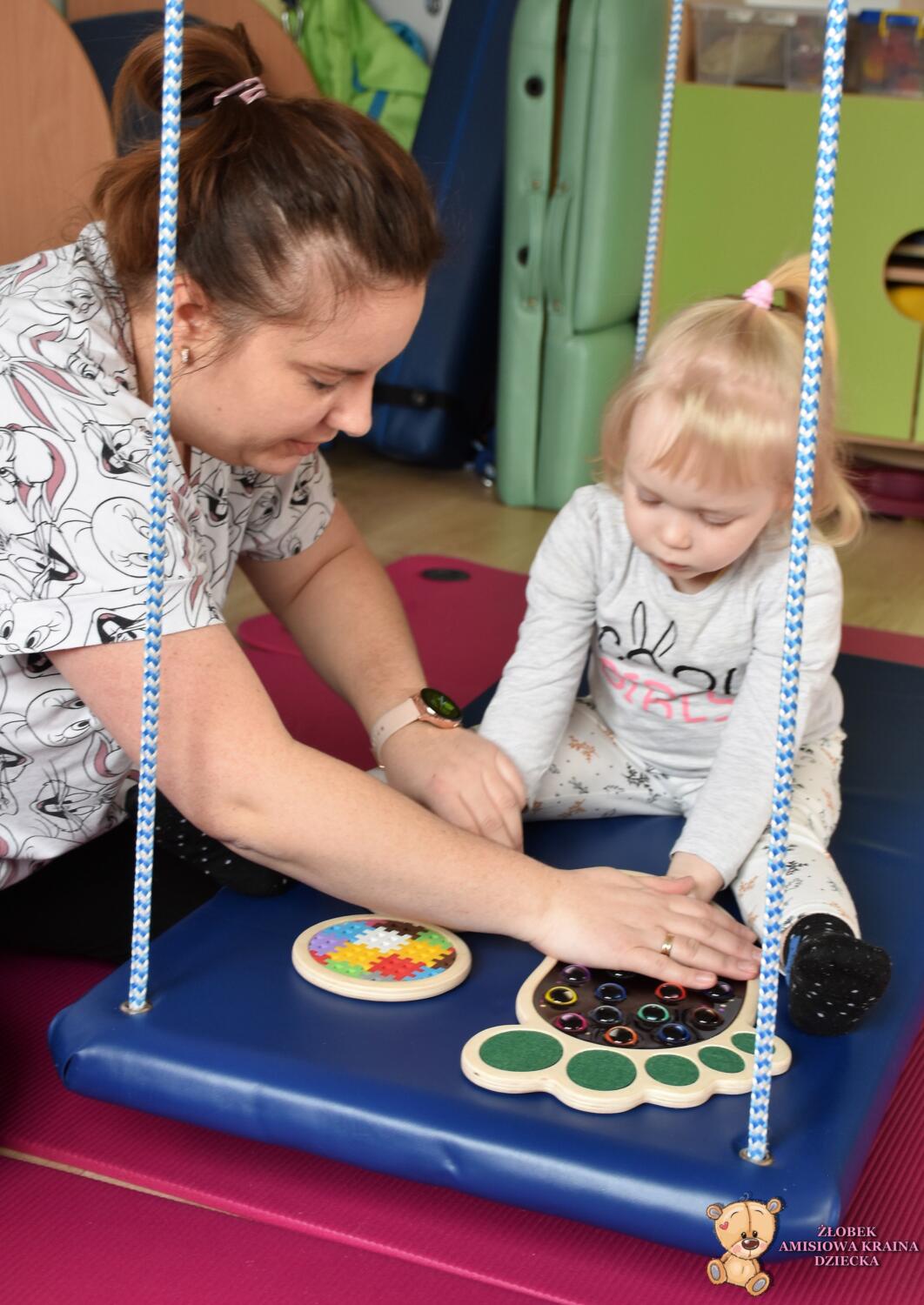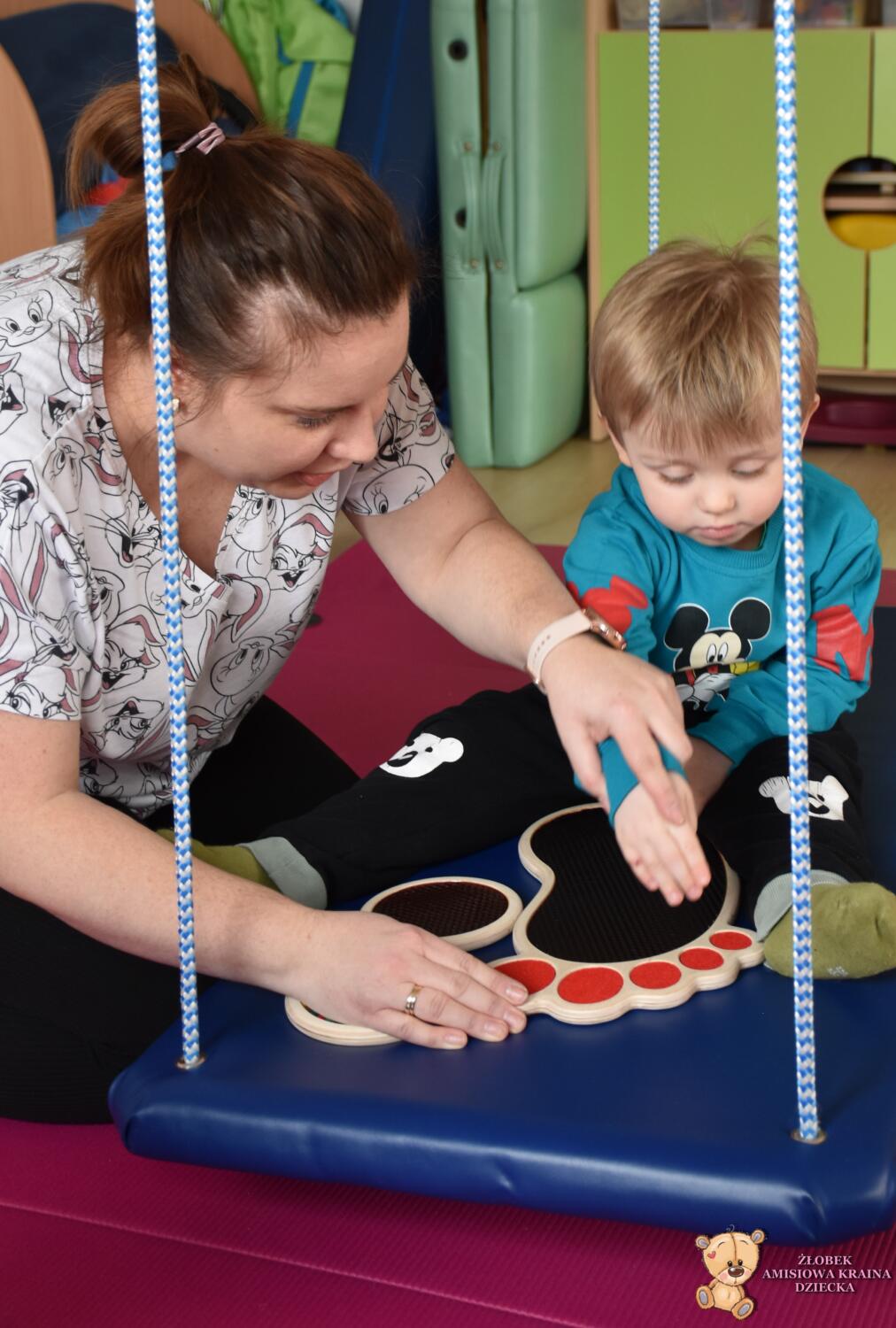 Dziś na zajęciach Integracji Sensorycznej Amisiaki stymulowały układ przedsionkowy, równowagę oraz dotyk. Ciocia łagodnie nas huśtała, a Dzieci dotykały dysków sensoryczych  i szukały takich samych. Trzeba było wygodnie usiąść na platformie, utrzymać równowagę podczas ćwiczeń. Amisiaki były zaciekawione i bardzo zaangażowane. Super!