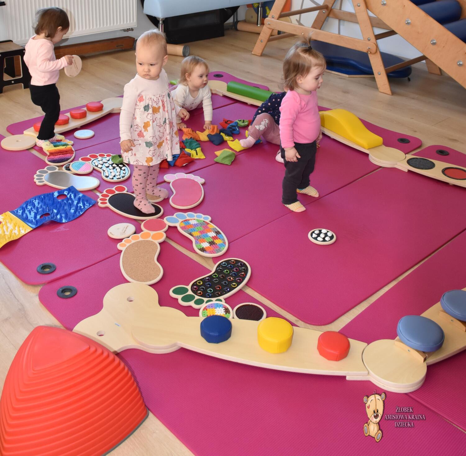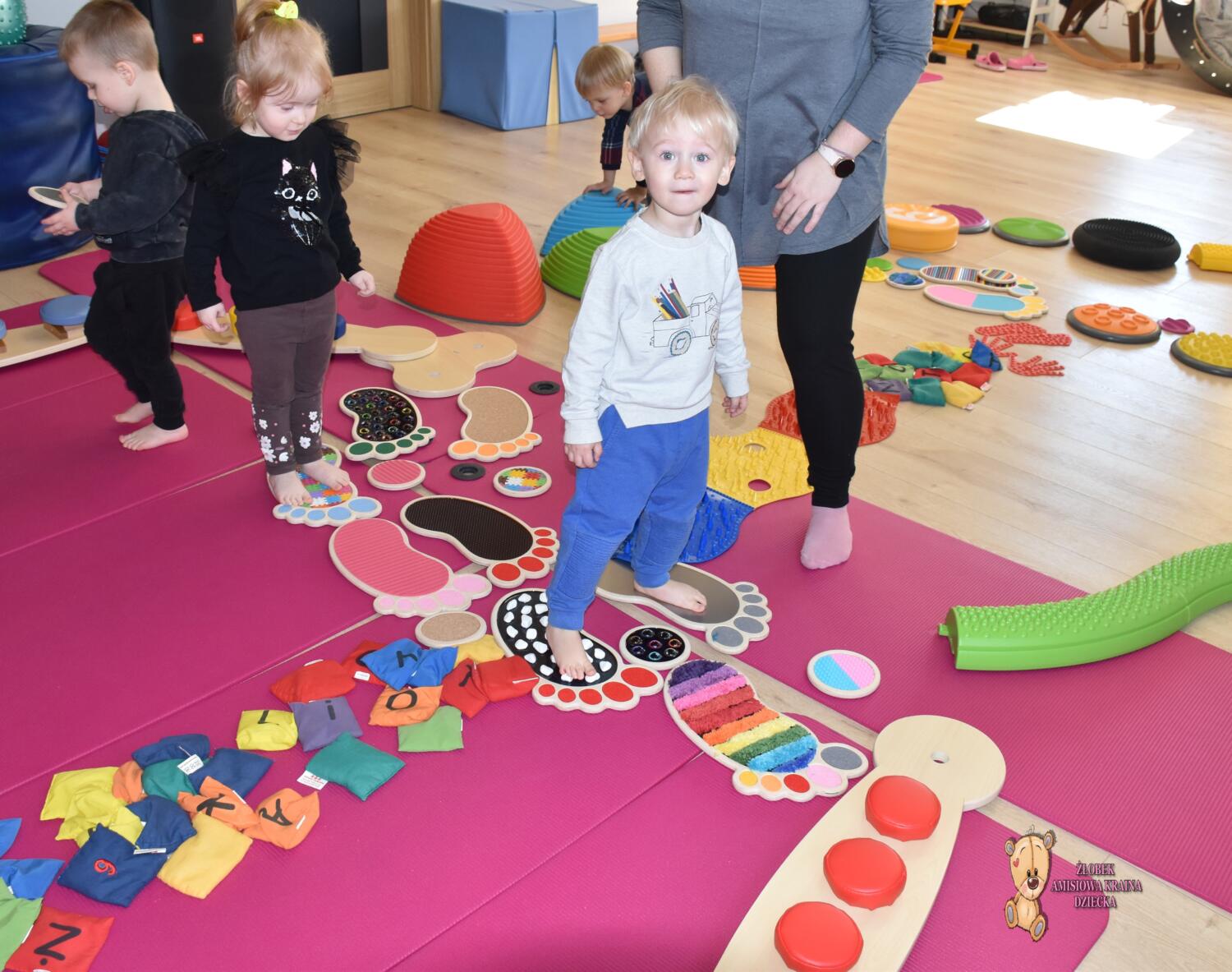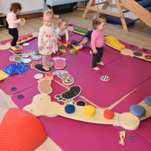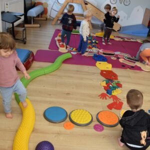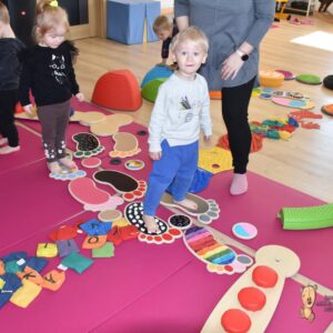 Dziś na zajęcia Integracji Sensorycznej Ciocia przygotowała dla Amisiaków małych i dużych ścieżkę sensoryczną. Dzieciom bardzo podobała się taka aktywność. Wszyscy byli zaciekawieni, zaangażowani i skupieni podczas zajęć. Starszaki okazały się bardzo odważne i zdjęły skarpety, żeby ich stopki jeszcze lepiej odczuwały różnorodne podłoże. Amisiaki starały się trzymać równowagę, śmiało kroczyły noga za nogą. Ciocia jest z Was dumna, spisaliście się na medal. Brawo!