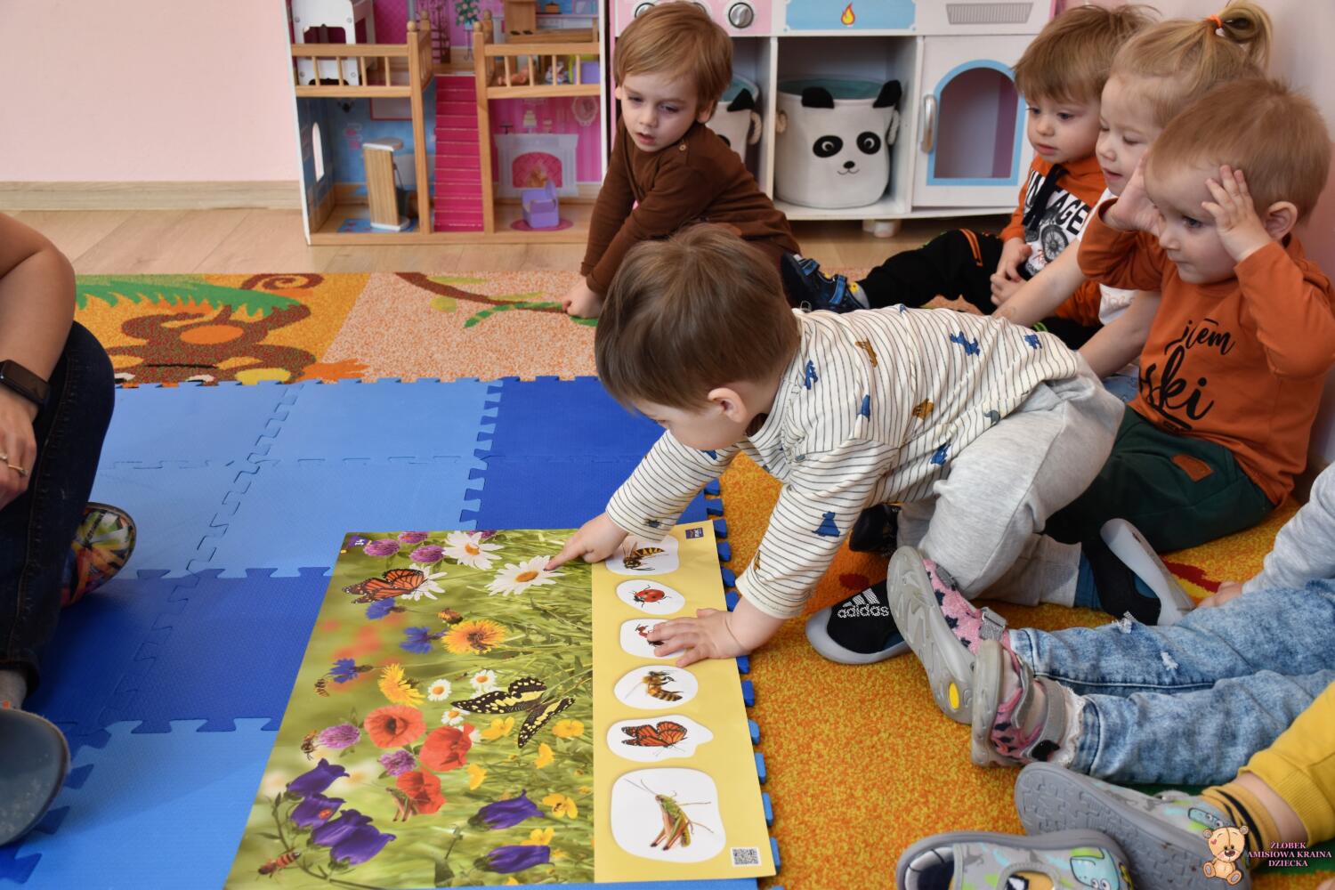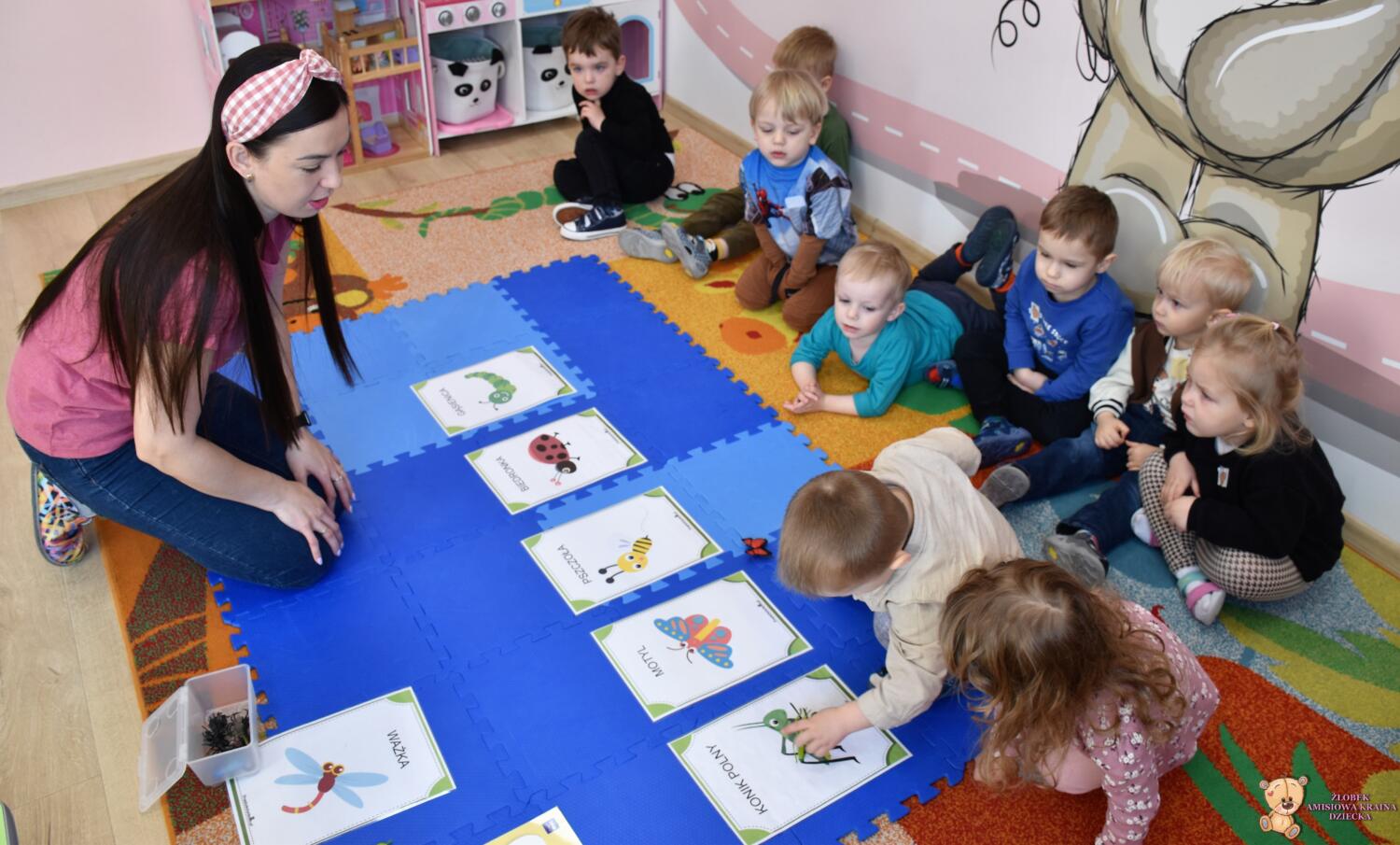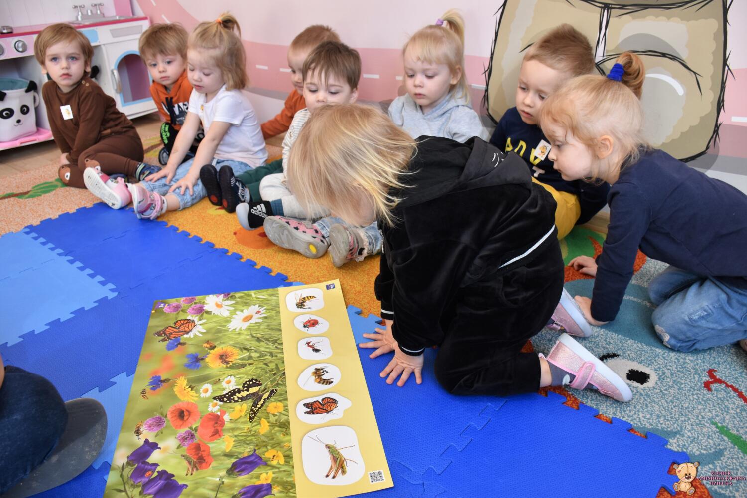 oraz plansze przedstawiające owady. Później dzieci dopasowywały figurki owadów