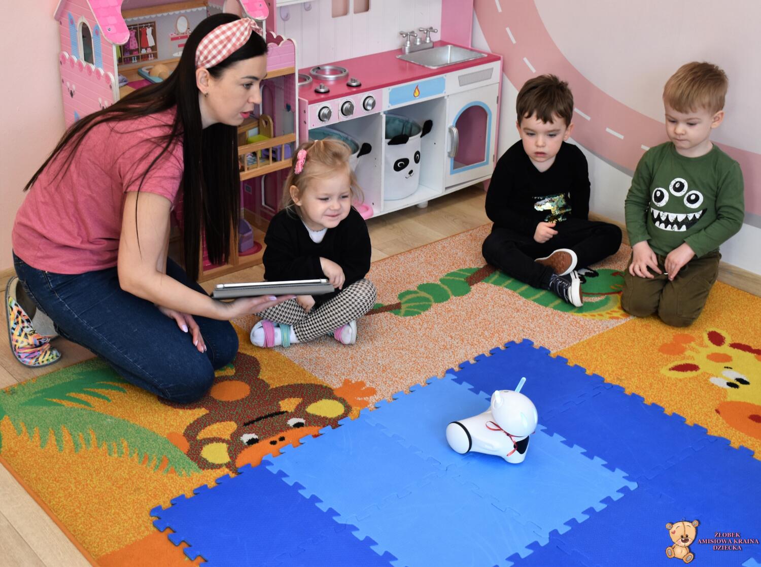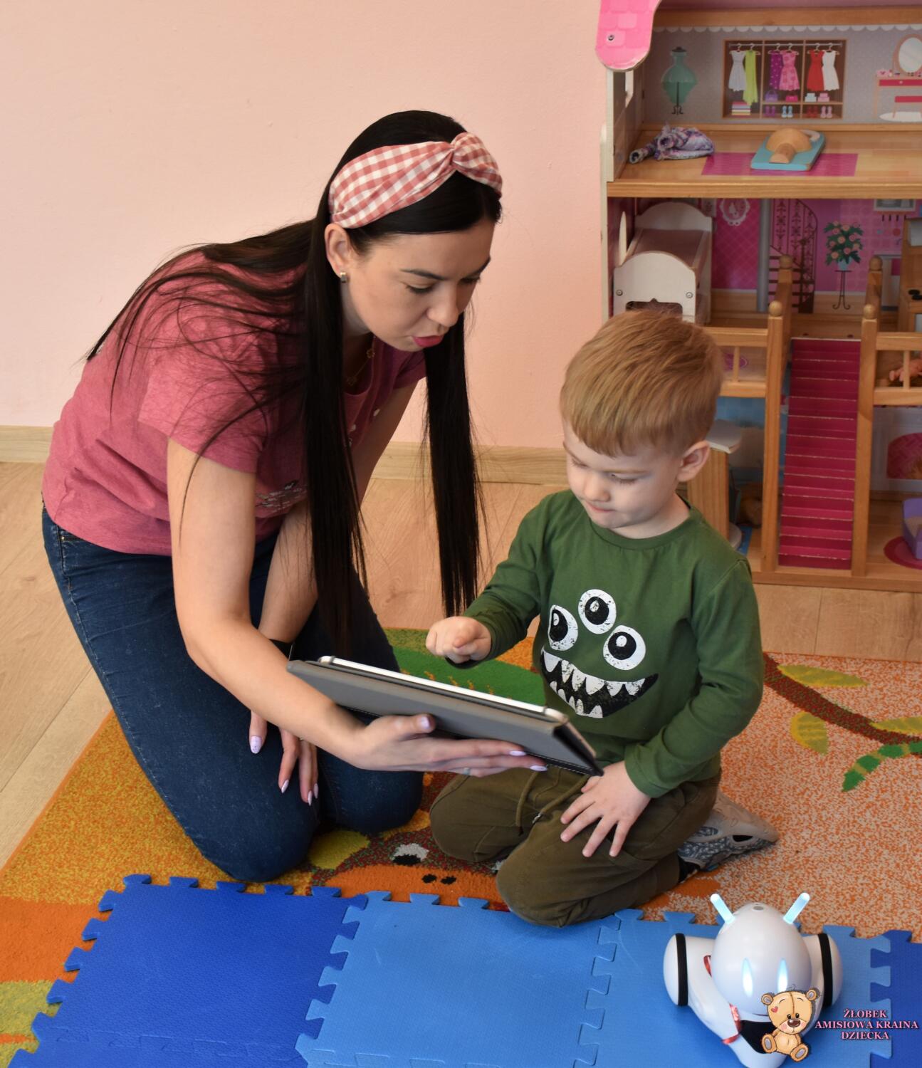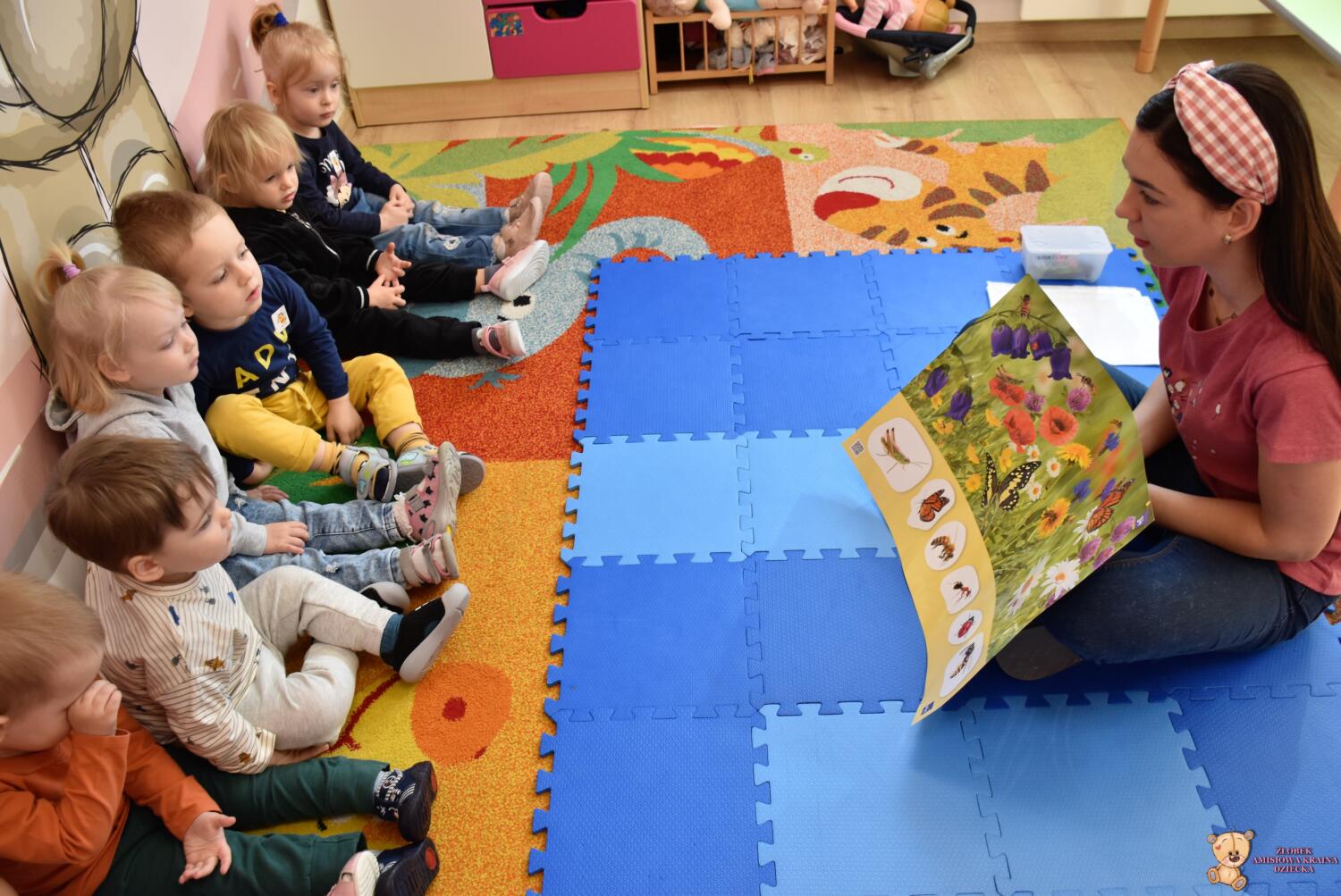 Dzieci wspólnie z robotem i panią Magdą oglądały duże zdjęcia łąki