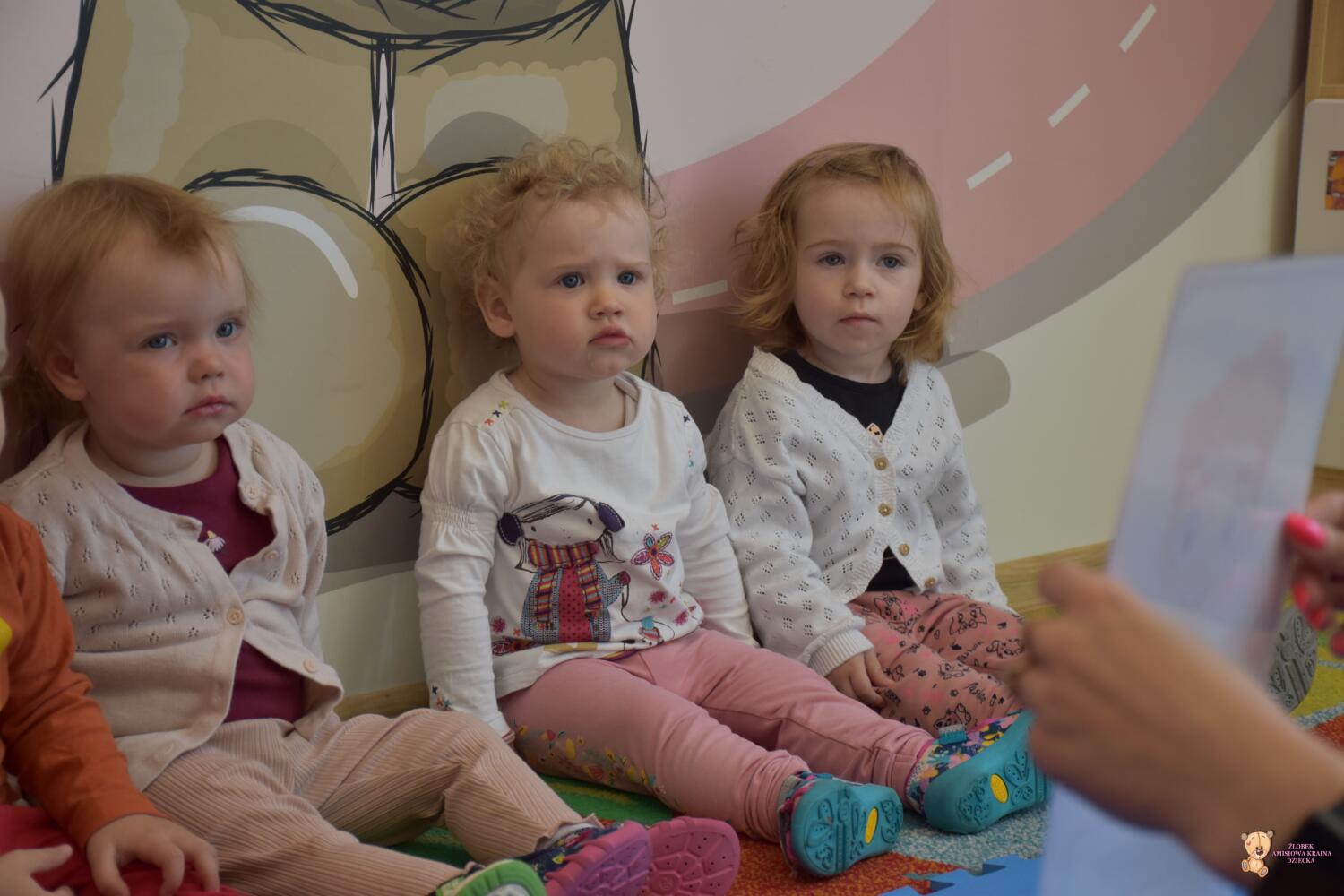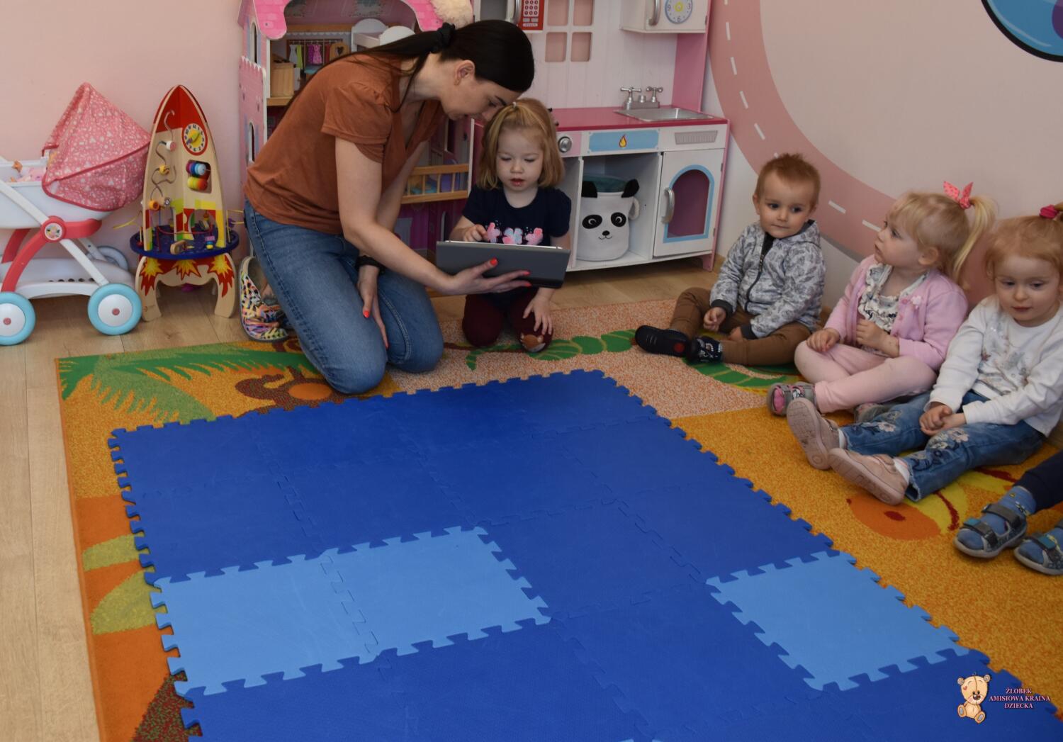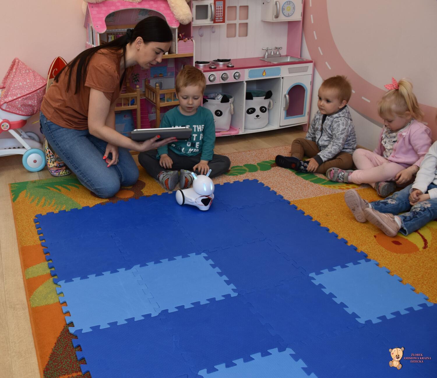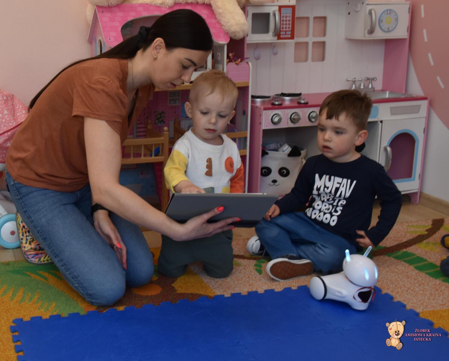 Dzieci wspólnie z robotem i panią Magdą oglądały duże ilustracje