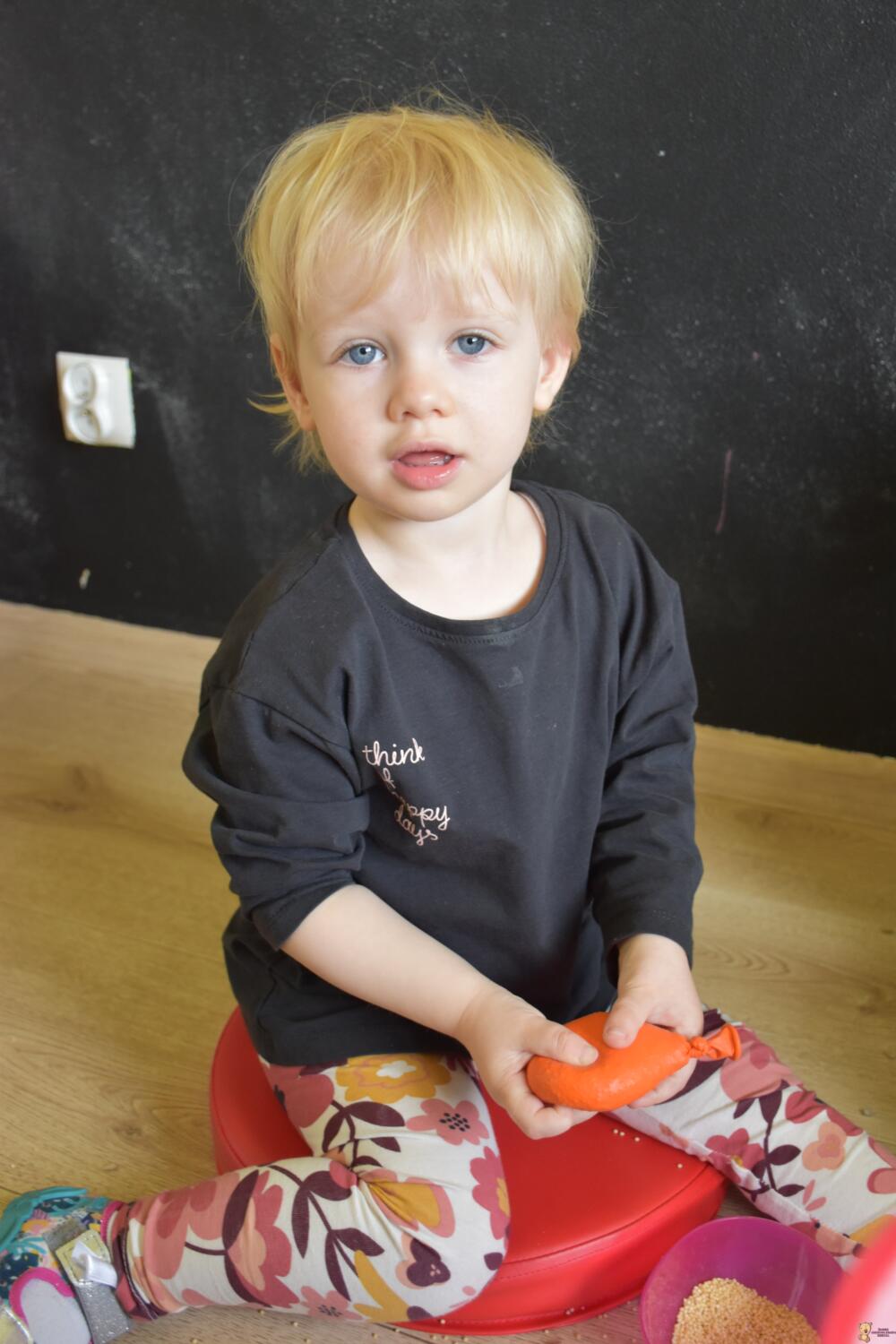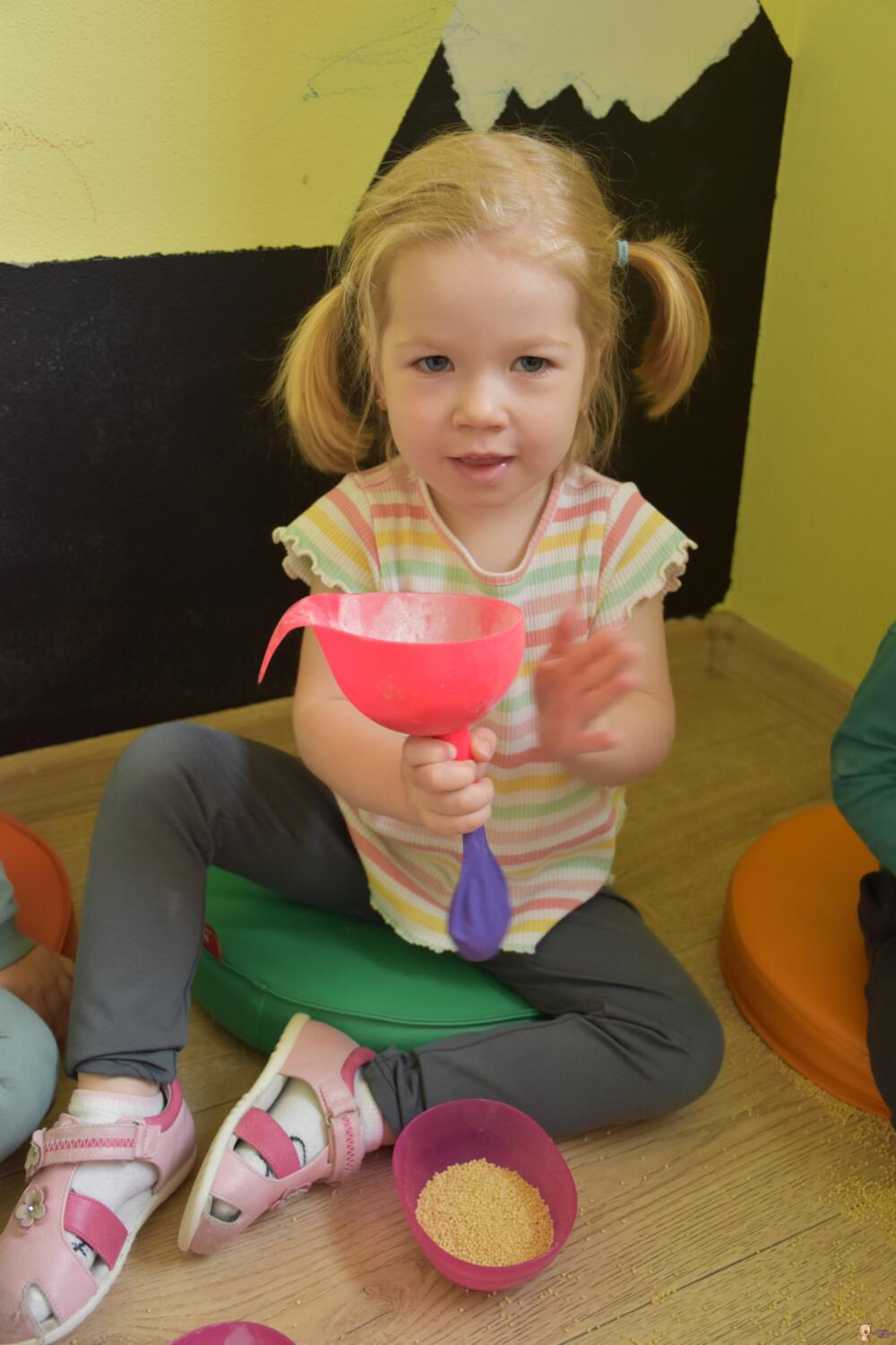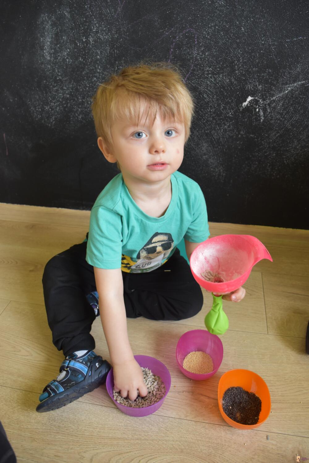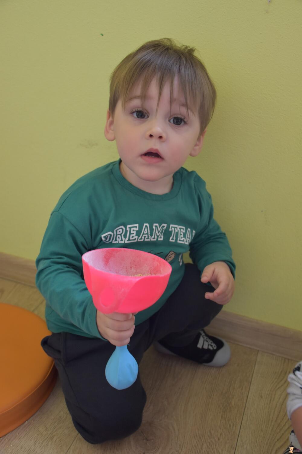 W ramach dzisiejszych zajęć z sensoplastyki dzieci miały okazję stworzyć własnoręcznie sensoryczne gniotki. Do przygotowanych kolorowych baloników, dzieci przesypywały suche produkty spożywcze: mąkę, kasze jaglaną, sól i pestki słonecznika. Tak wypełnione balony, po zawiązaniu, zamieniły się w kolorowe gniotki. Dzieci podczas zajęć ćwiczyły motorykę małą, pobudzały swoją wyobraźnię i relaksowały się gniotąc w rączkach samodzielnie stworzone zabawki.