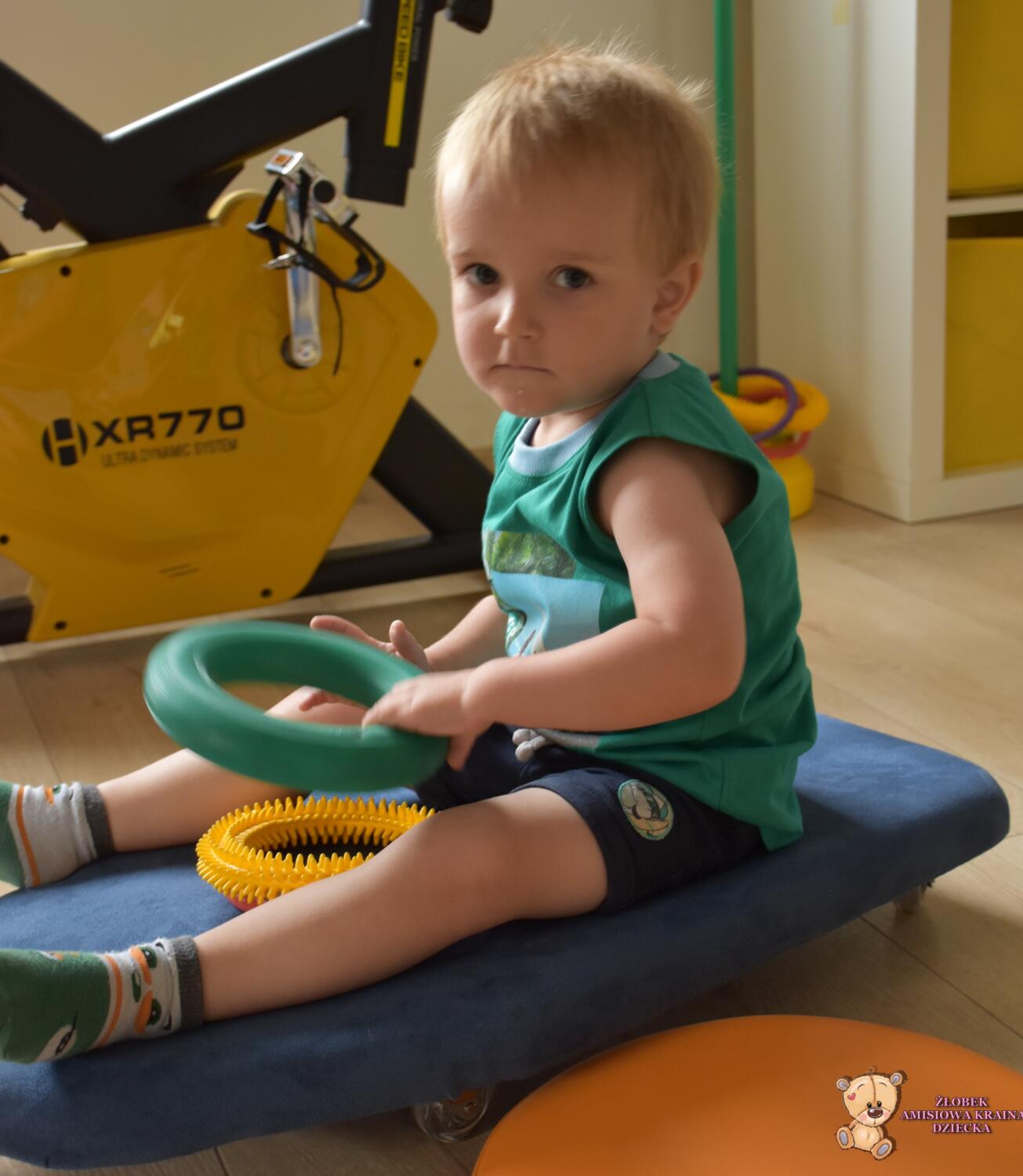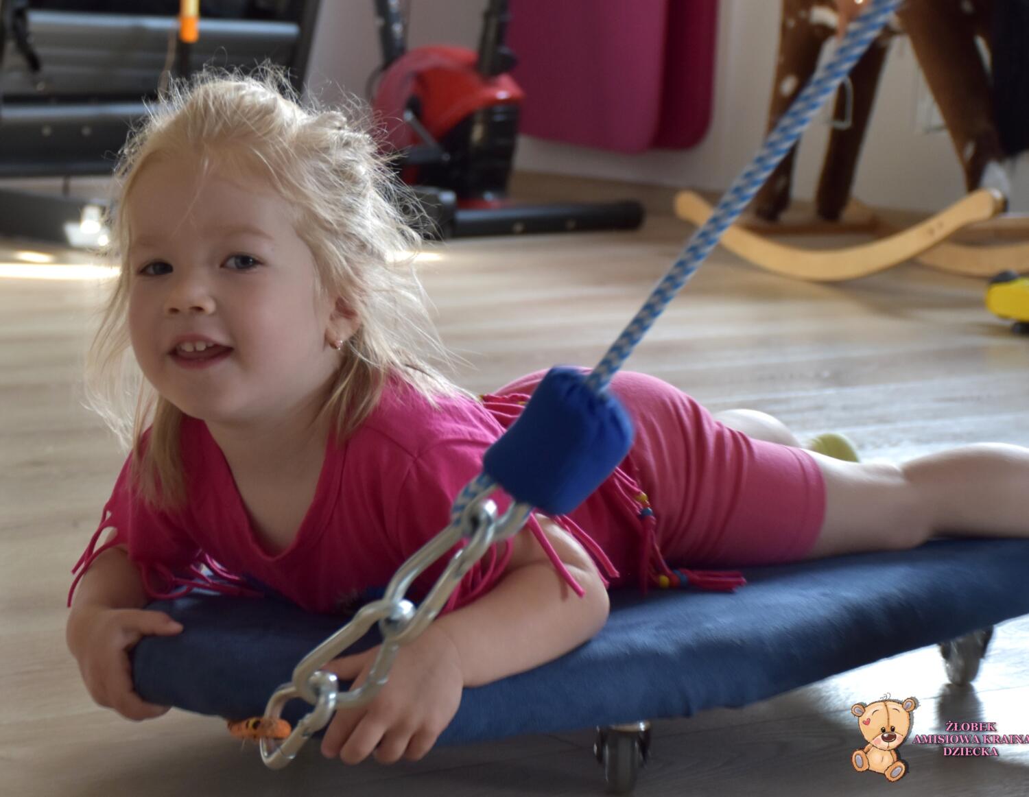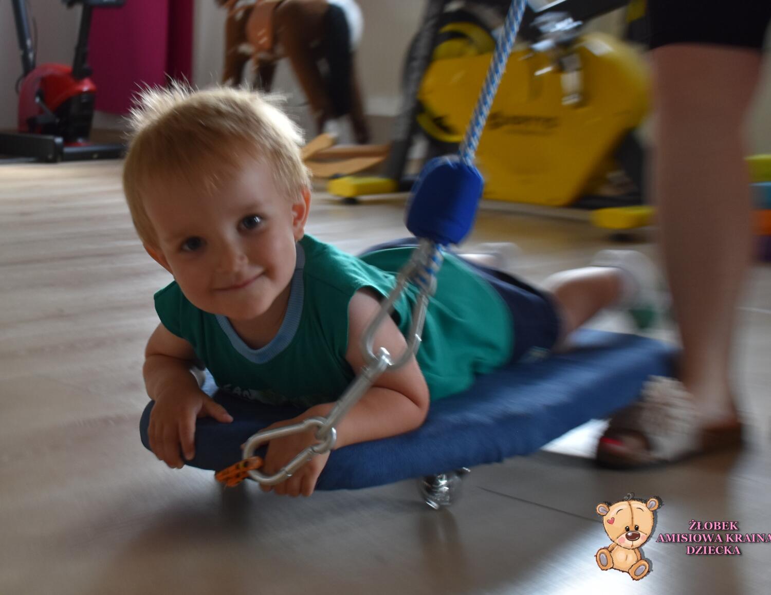 Dziś na zajęciach Integracji Sensorycznej Amisiaki ćwiczyły na deskorolce. Ciocia nas wprowadzała w ruch, a my wykonywaliśmy różne zadania. Zbieraliśmy obręcze i nakładaliśmy je na pachołki, zbieraliśmy dotykowe dyski i szukaliśmy pary, chwytaliśmy woreczki i odkładaliśmy w wyznaczone miejsce. A to wszystko podczas jazdy na deskorolce. Amisiaki stymulowały układ przedsionkowy oraz dotykowy, równowagę, rozwijały świadomość własnego ciała, a także umiejętności koordynacyjne, precyzję w działaniu, dopasowywanie według koloru. Na koniec była super szybka przejażdżka na brzuchu, były zakręty i mocne hamowanie. Amisiaki były bardzo odważne. Brawo!