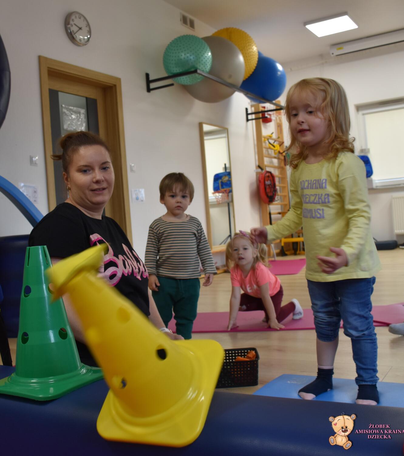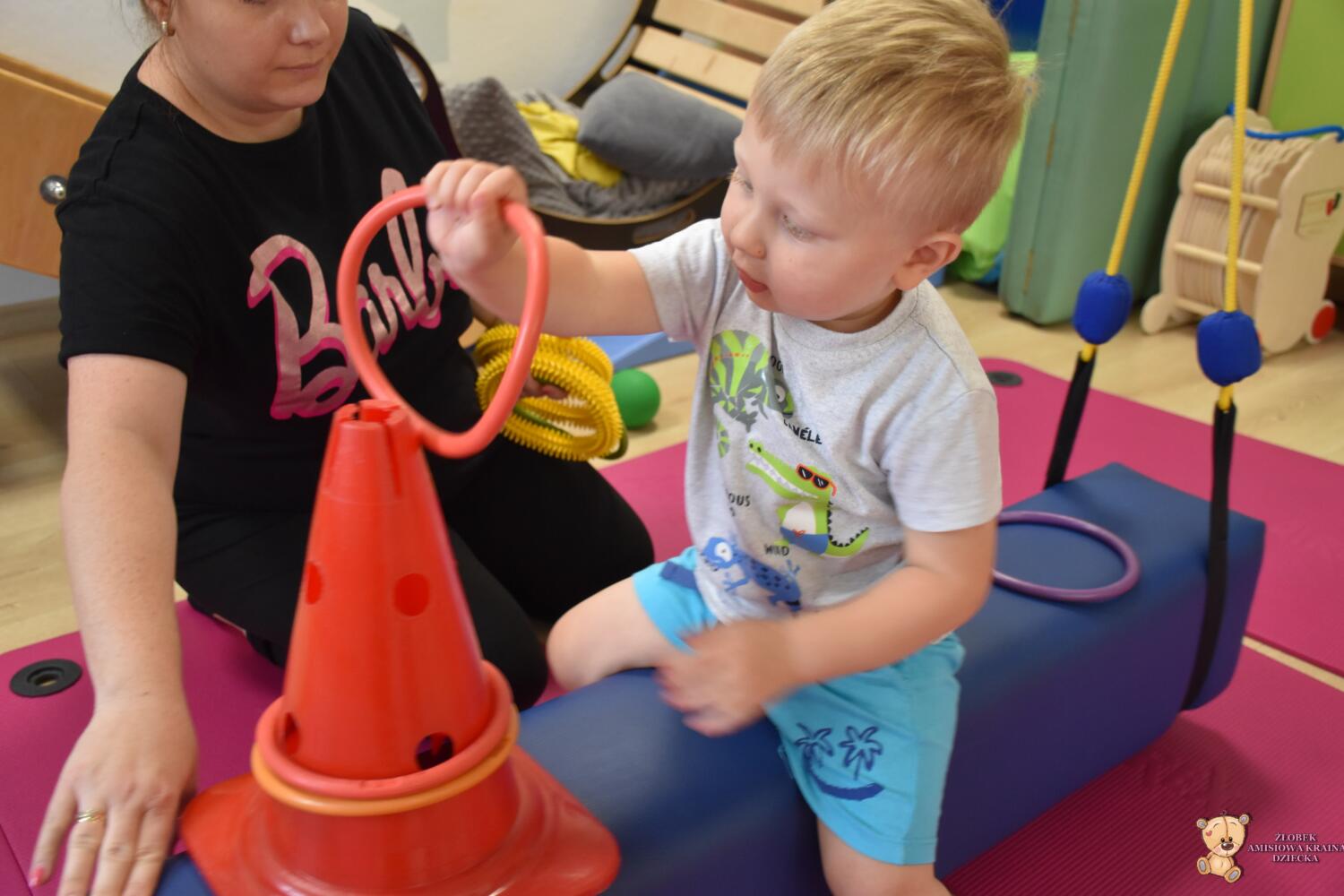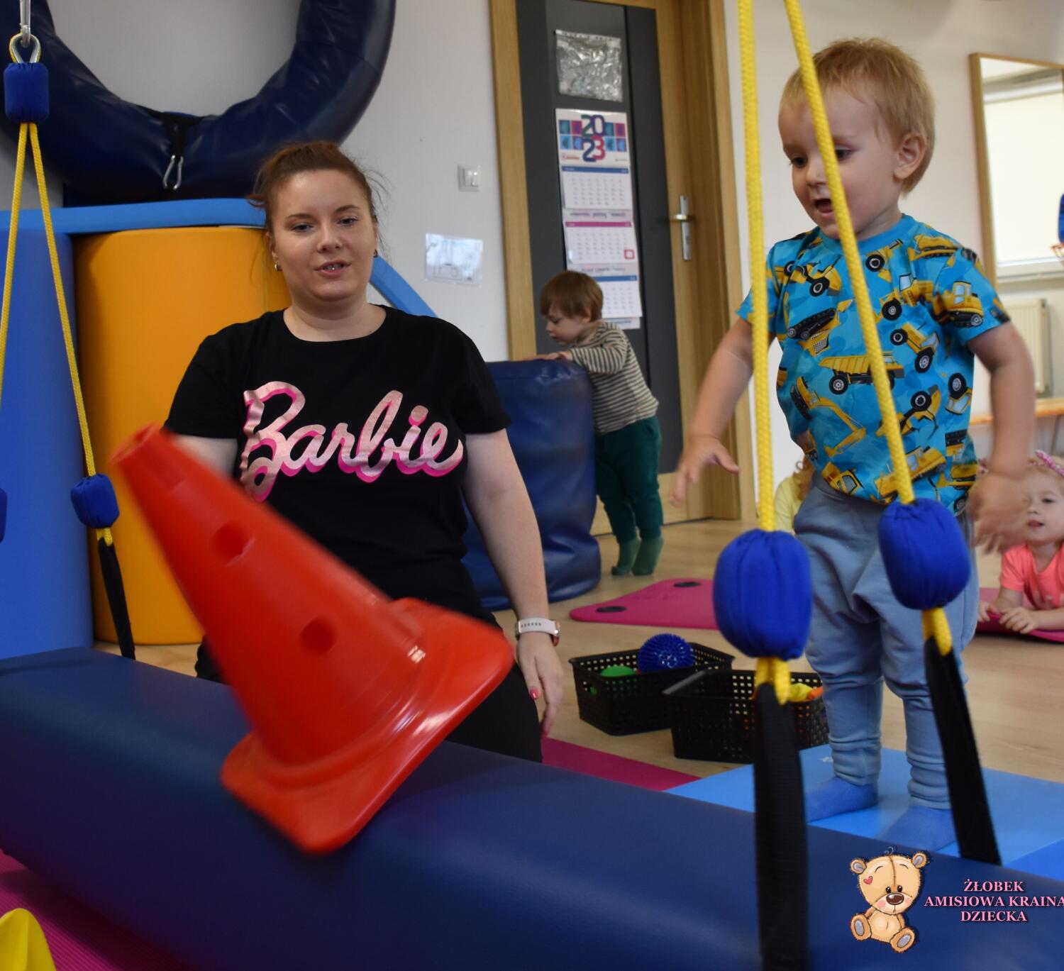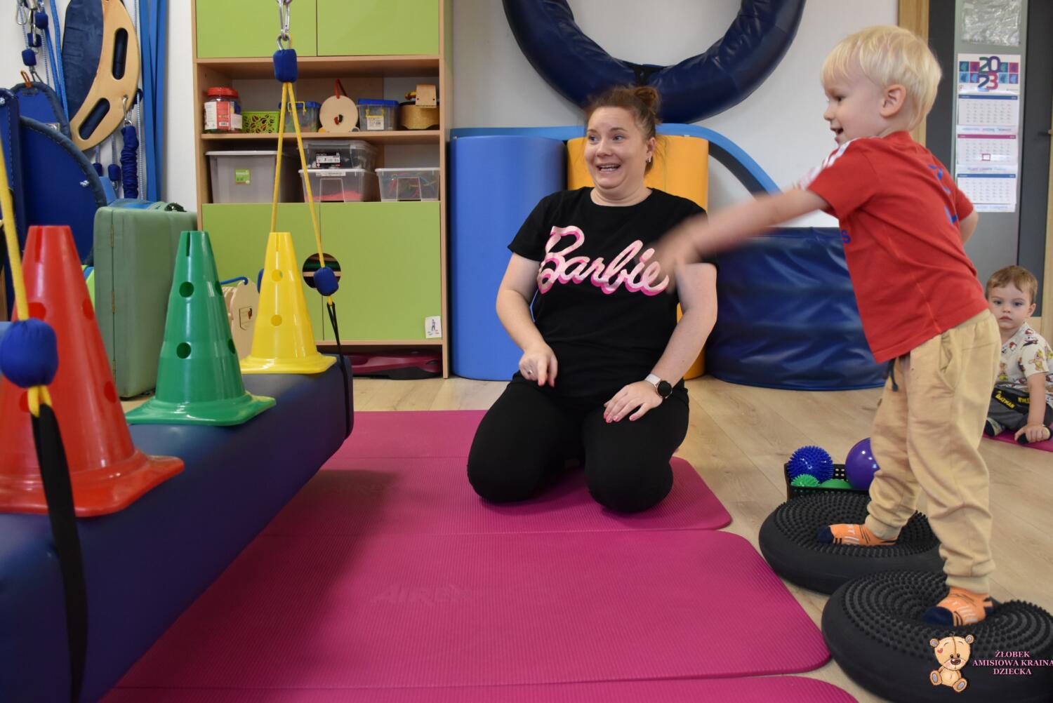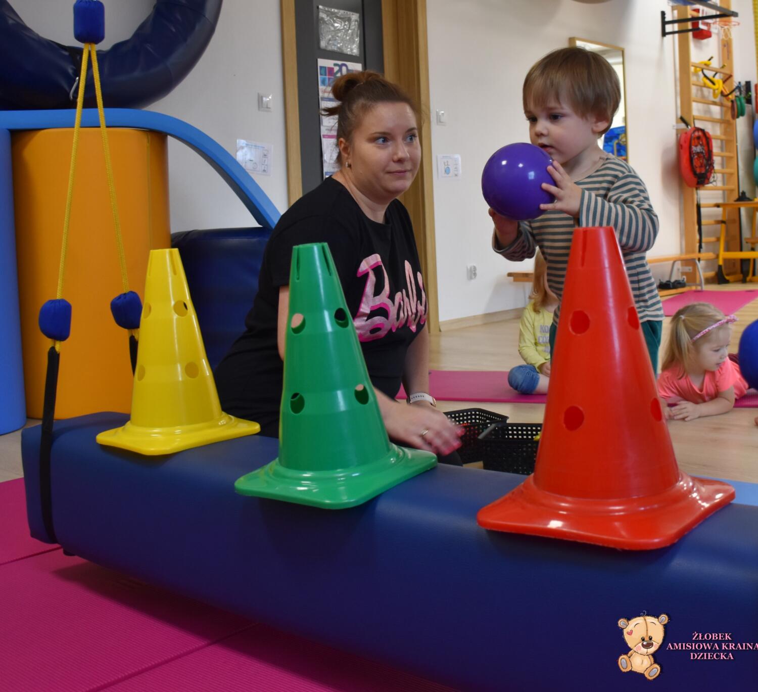 Dziś na zajęciach Integracji Sensorycznej Amisiaki ćwiczyły równowagę, koordynację wzrokowo ruchową, precyzję, motorykę dużą i małą, stymulowaliśmy układ przedsionkowy, proprioceptynwy oraz dotykowy. Amisiaki zbijały pachołki stojące na koniku podwieszanym, strącały pachołki podczas huśtania, turlały piłki oraz nakładały obręcze w czasie ruchu na huśtawce. Zadania oraz ich trudność była dostosowana do grupy wiekowej. Na zakończenie była zabawa ,,sztorm na morzu”, Amisiaki mocno trzymały równowagę na koniku żeby nie spaść. Było bardzo wesoło. Brawo Dzieciaki!