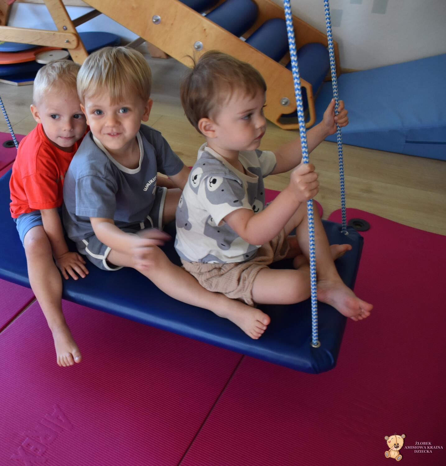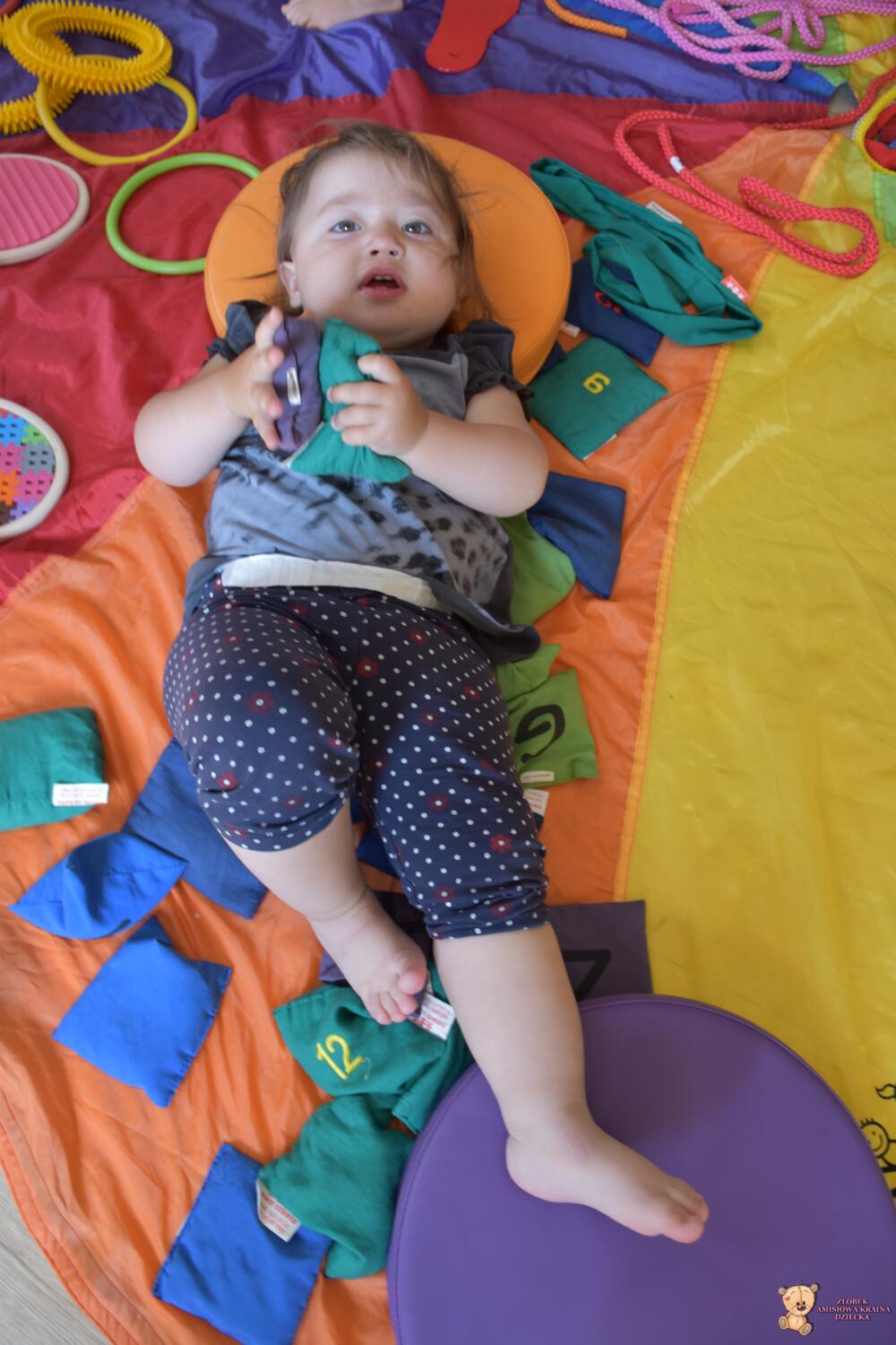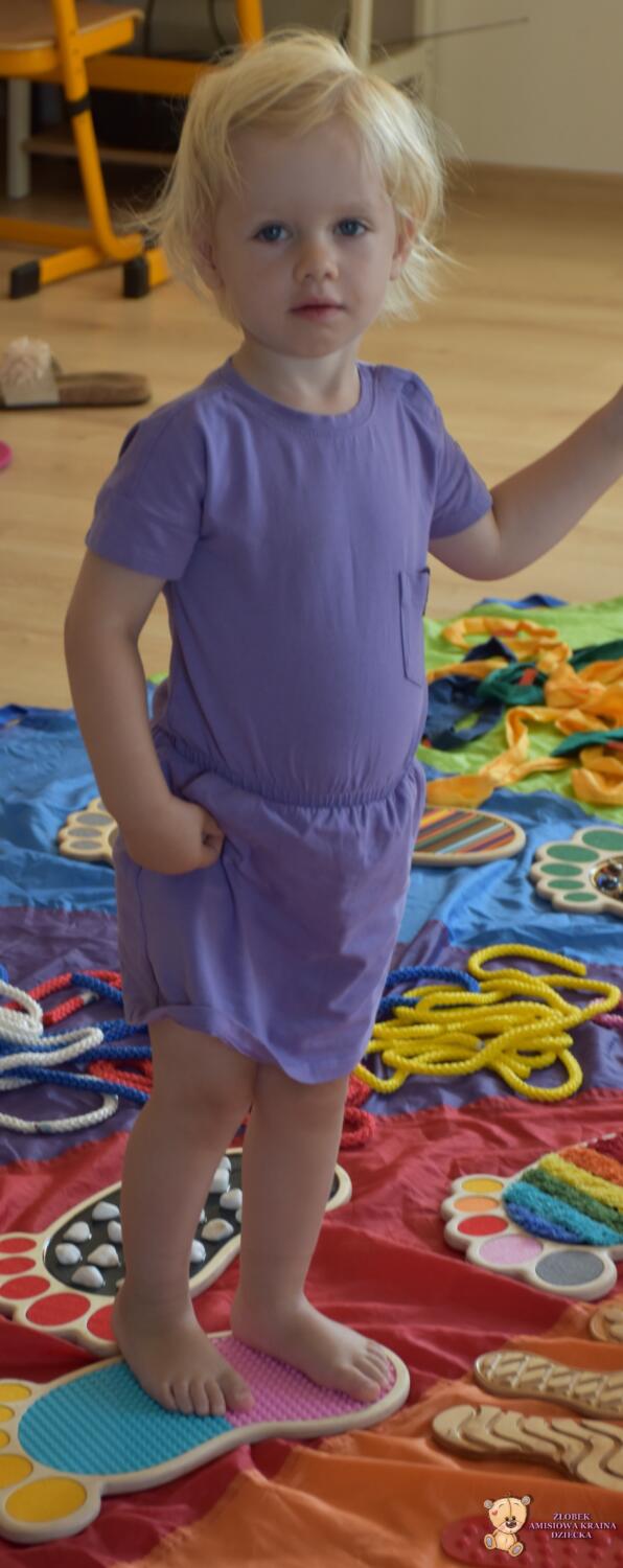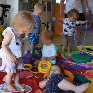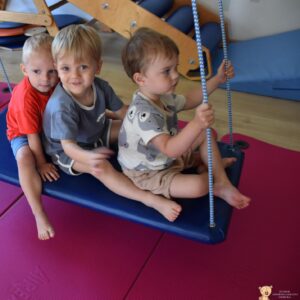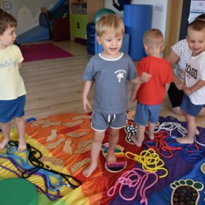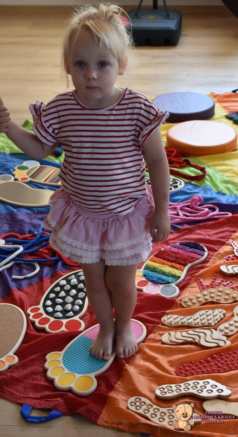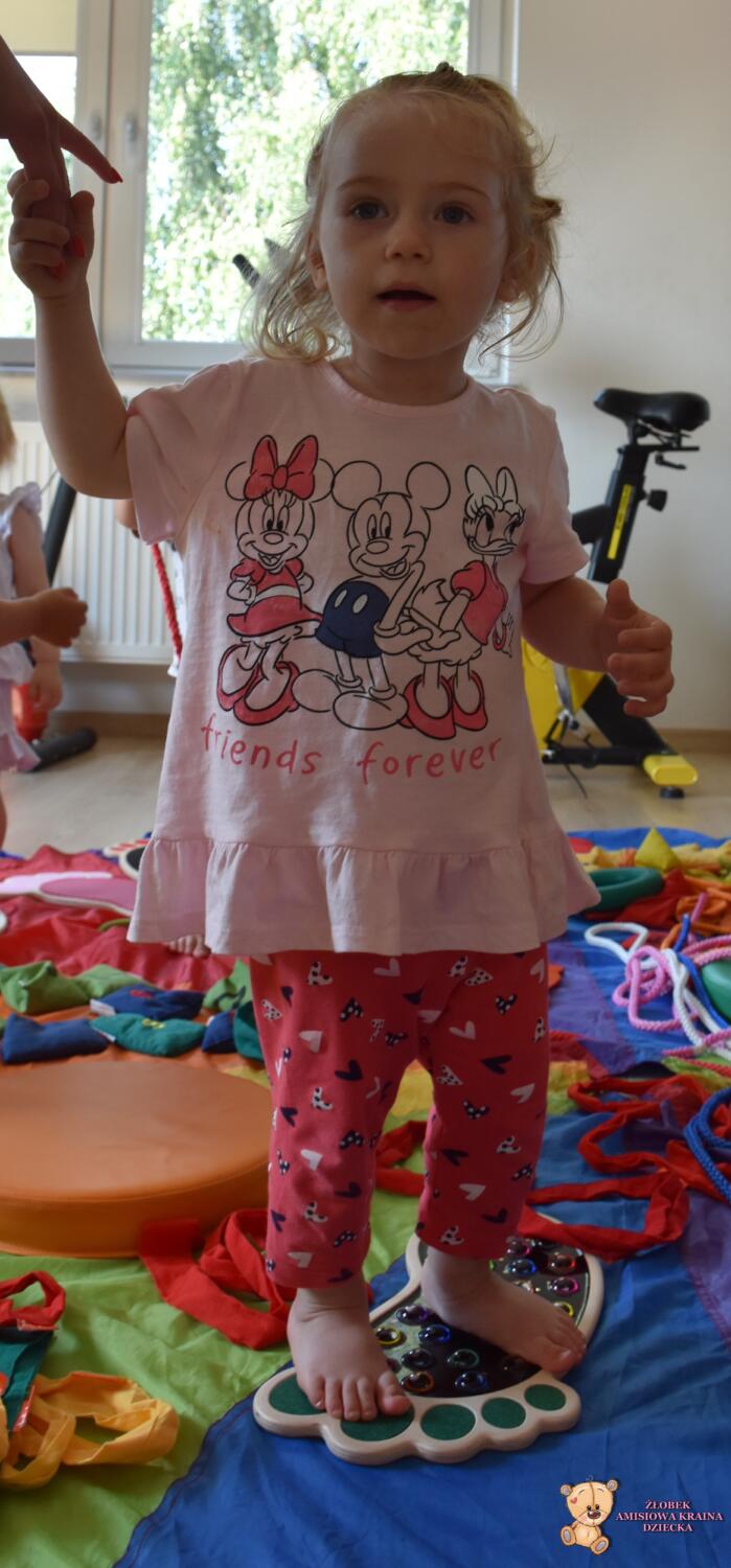 Dziś na zajęciach Integracji Sensorycznej Amisiaki stymulowały układ przedsionkowy, proprioceptynwy, dotykowy oraz rozwijały umiejętności równoważne. Na dobry początek Ciocia naszykowała pole sensoryczne, wyłożone różnorodnymi fakturami, po którym Amisiaki chodziły na boso, dotykały oraz kładły się. Następnie była zabawa w ,, sztorm na morzu „. Amisiaki huśtały się na platformie podwieszanej, musiały trzymać się mocno, gdy pojawiały się fale. Ta zabawa sprawiała Amisiakom dużą frajdę, zadowolenie oraz satysfakcję. Wspaniale!