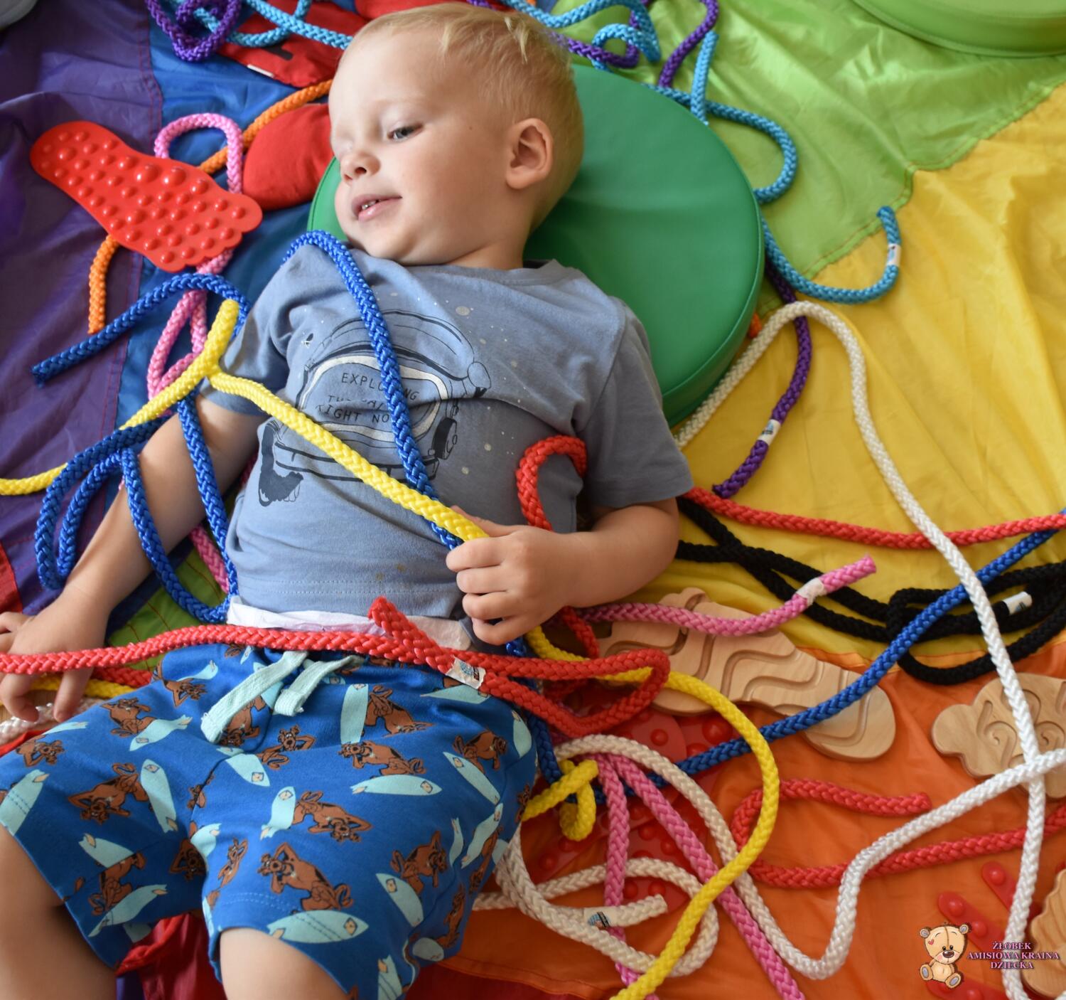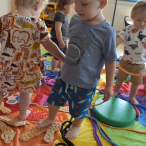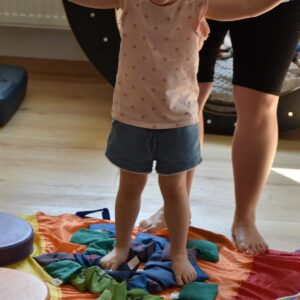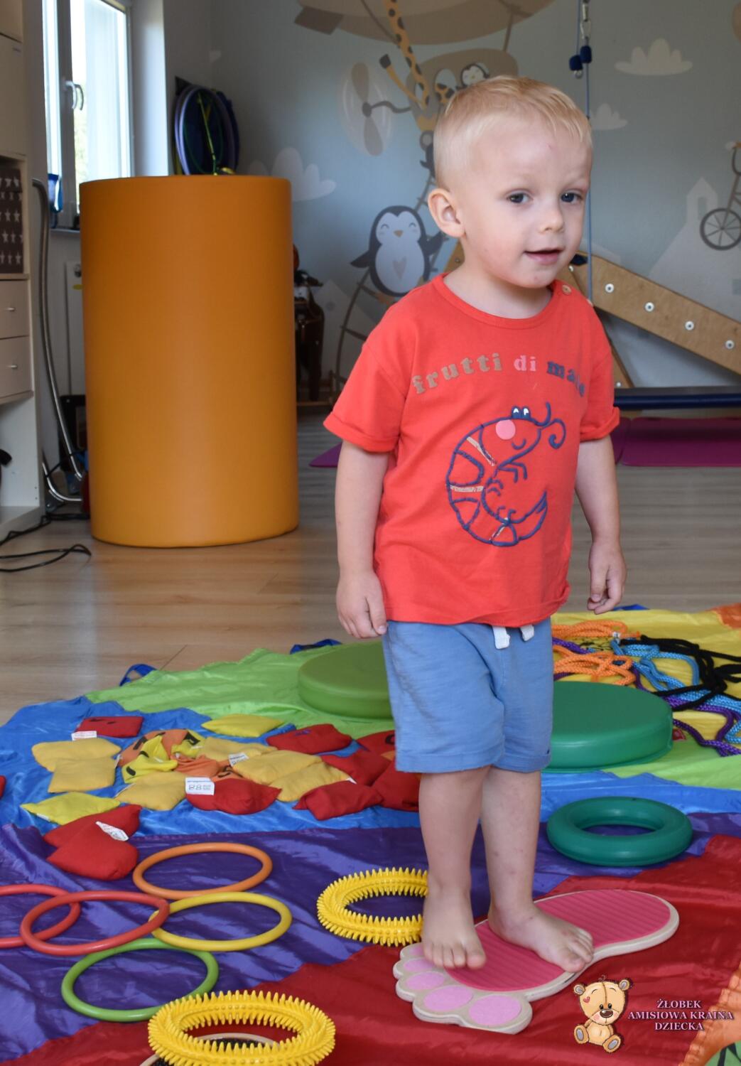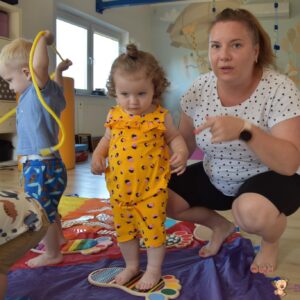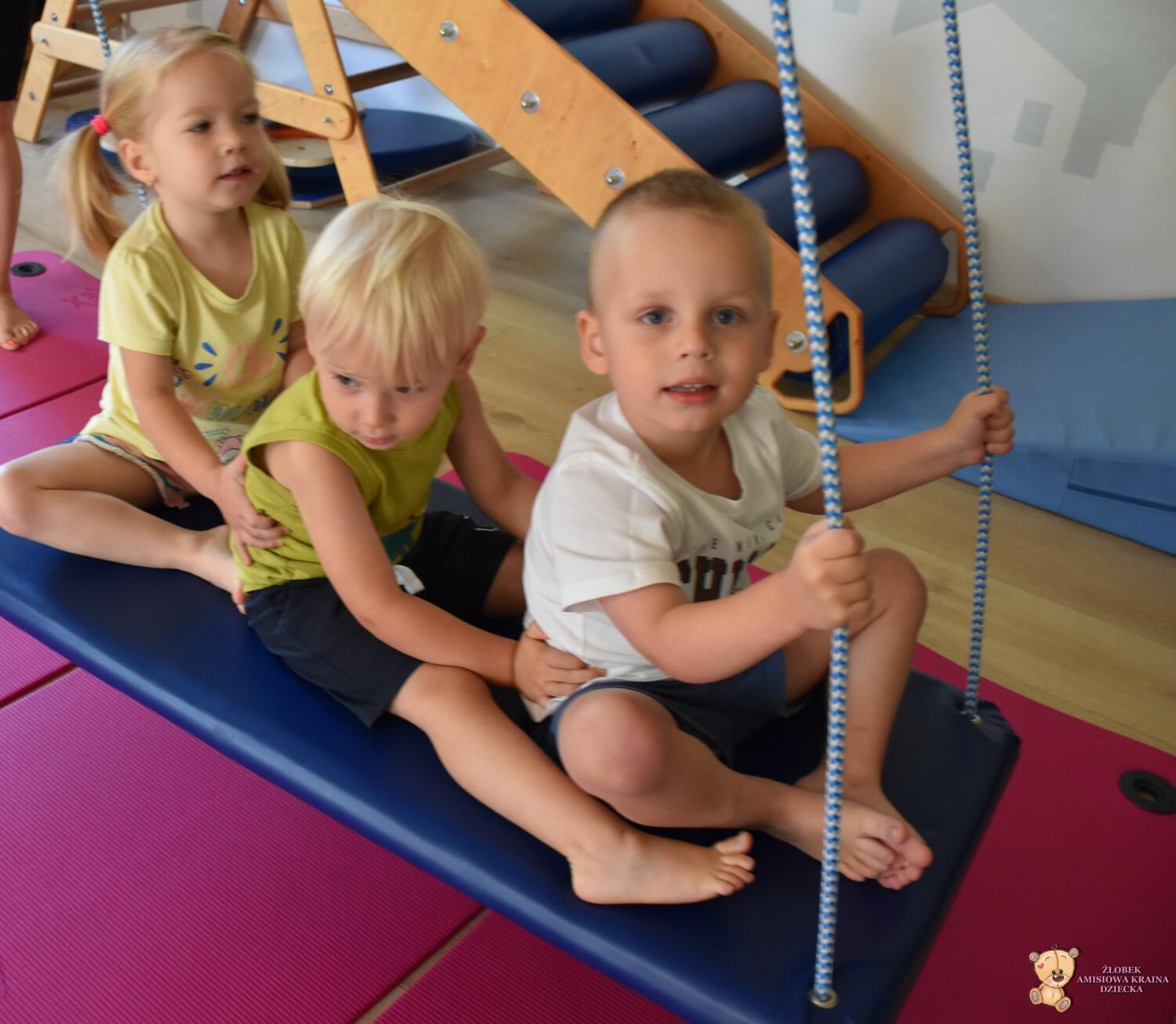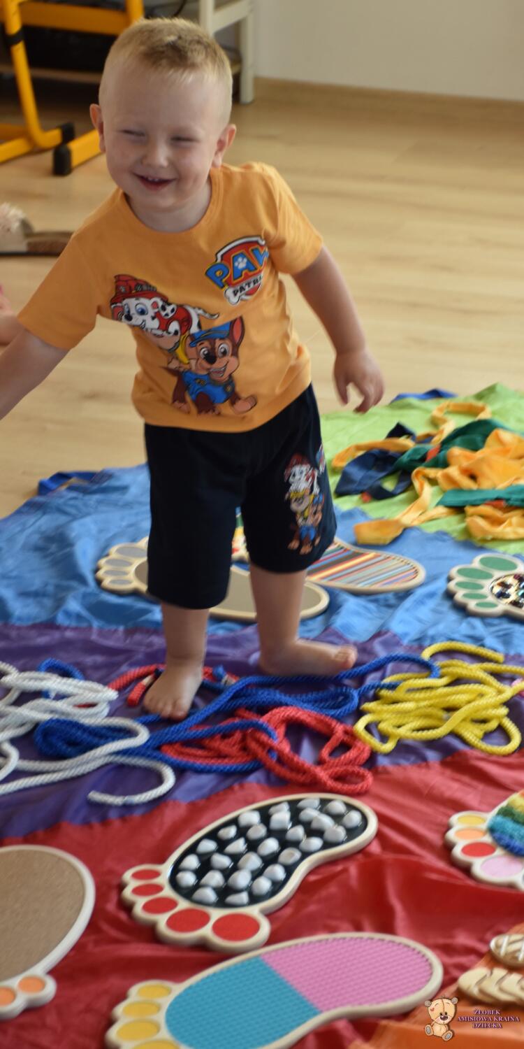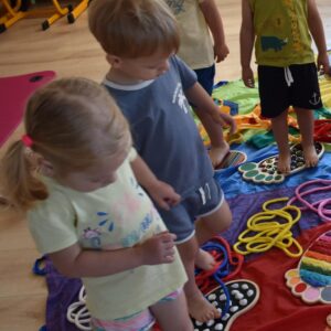 Dziś na zajęciach Integracji Sensorycznej Amisiaki stymulowały układ przedsionkowy, proprioceptynwy, dotykowy oraz rozwijały umiejętności równoważne. Na dobry początek Ciocia naszykowała pole sensoryczne, wyłożone różnorodnymi fakturami, po którym Amisiaki chodziły na boso, dotykały oraz kładły się. Następnie była zabawa w ,, sztorm na morzu „. Amisiaki huśtały się na platformie podwieszanej, musiały trzymać się mocno, gdy pojawiały się fale. Ta zabawa sprawiała Amisiakom dużą frajdę, zadowolenie oraz satysfakcję. Wspaniale!