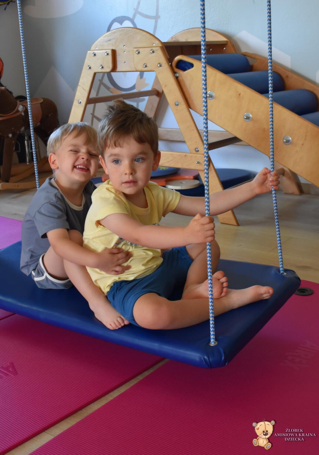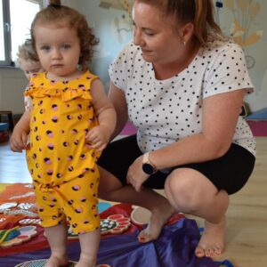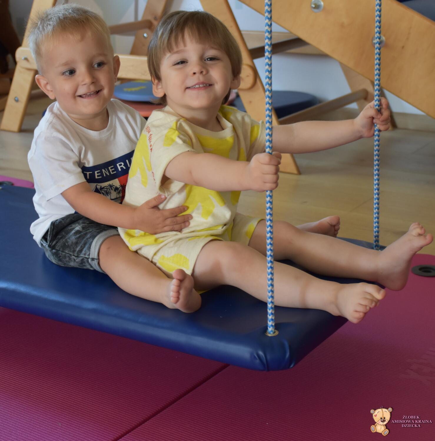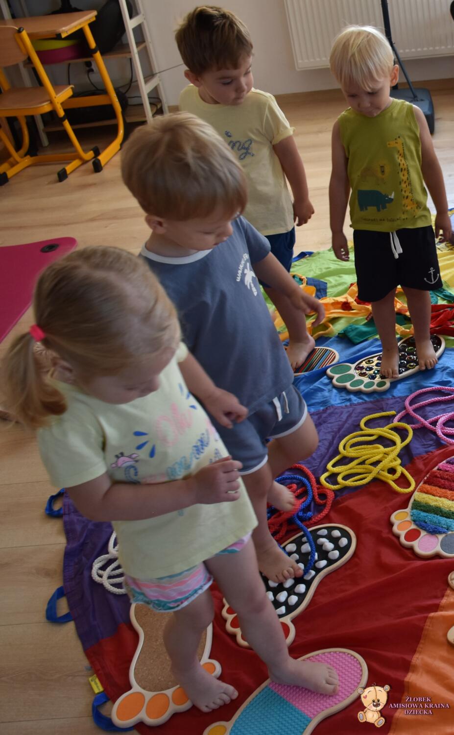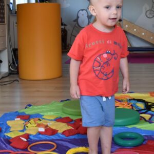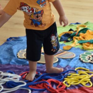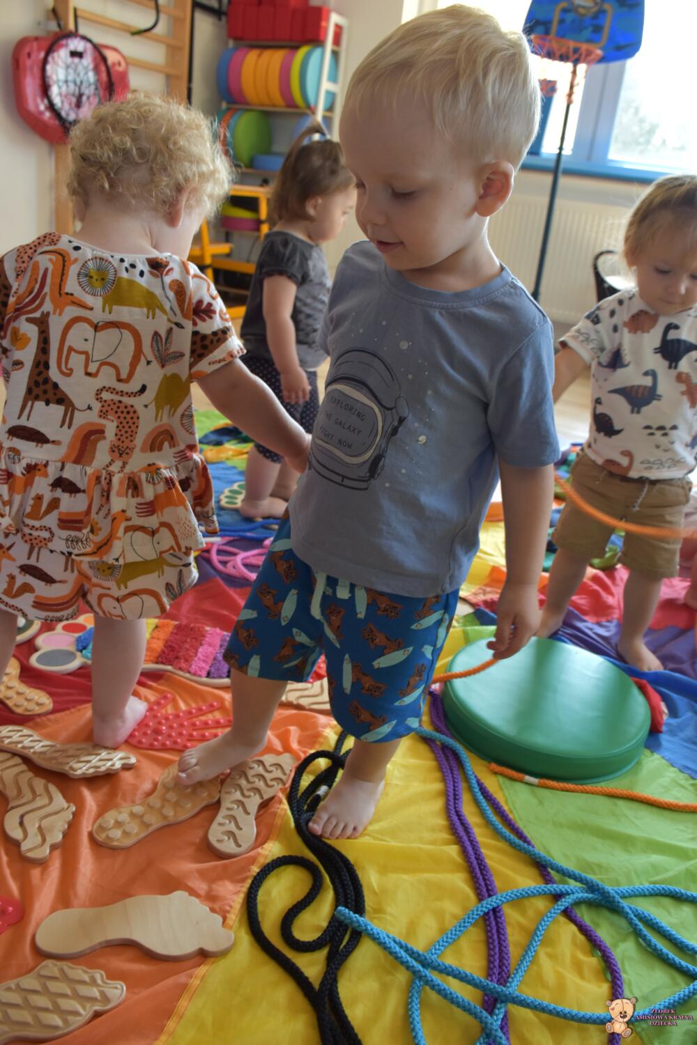 Dziś na zajęciach Integracji Sensorycznej Amisiaki stymulowały układ przedsionkowy, proprioceptynwy, dotykowy oraz rozwijały umiejętności równoważne. Na dobry początek Ciocia naszykowała pole sensoryczne, wyłożone różnorodnymi fakturami, po którym Amisiaki chodziły na boso, dotykały oraz kładły się. Następnie była zabawa w ,, sztorm na morzu „. Amisiaki huśtały się na platformie podwieszanej, musiały trzymać się mocno, gdy pojawiały się fale. Ta zabawa sprawiała Amisiakom dużą frajdę, zadowolenie oraz satysfakcję. Wspaniale!