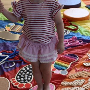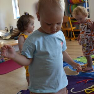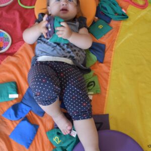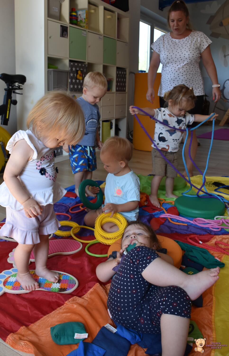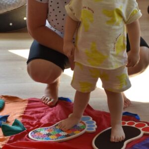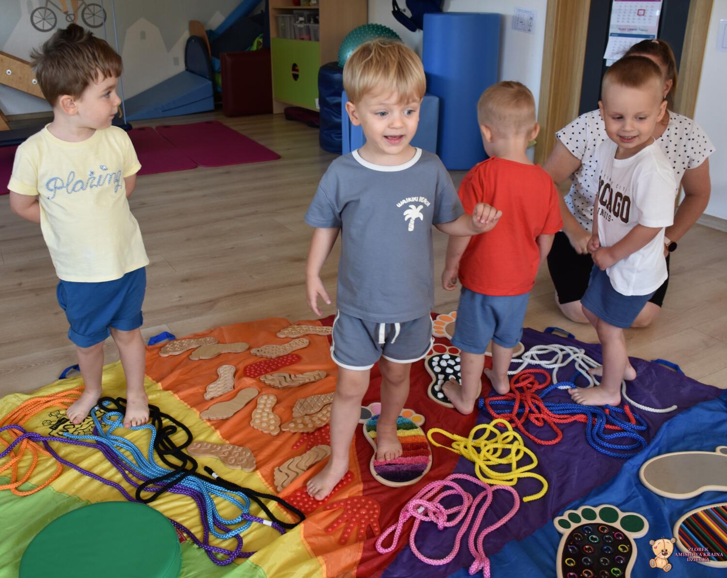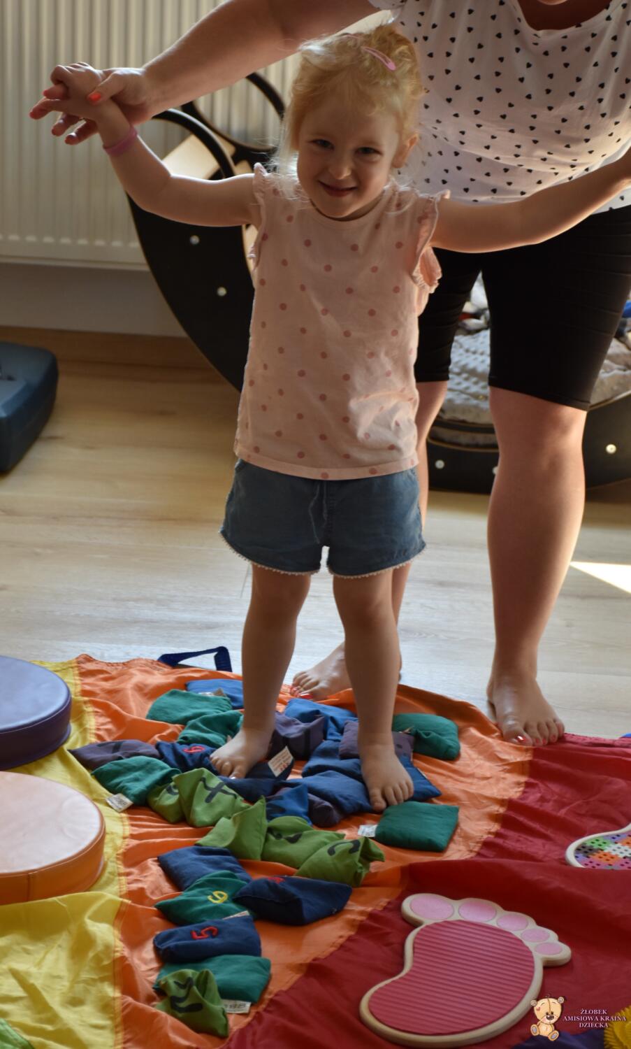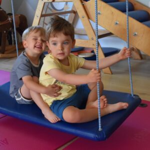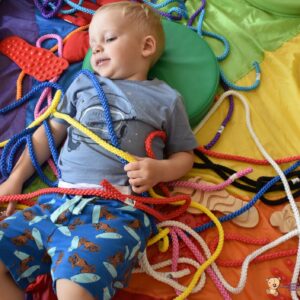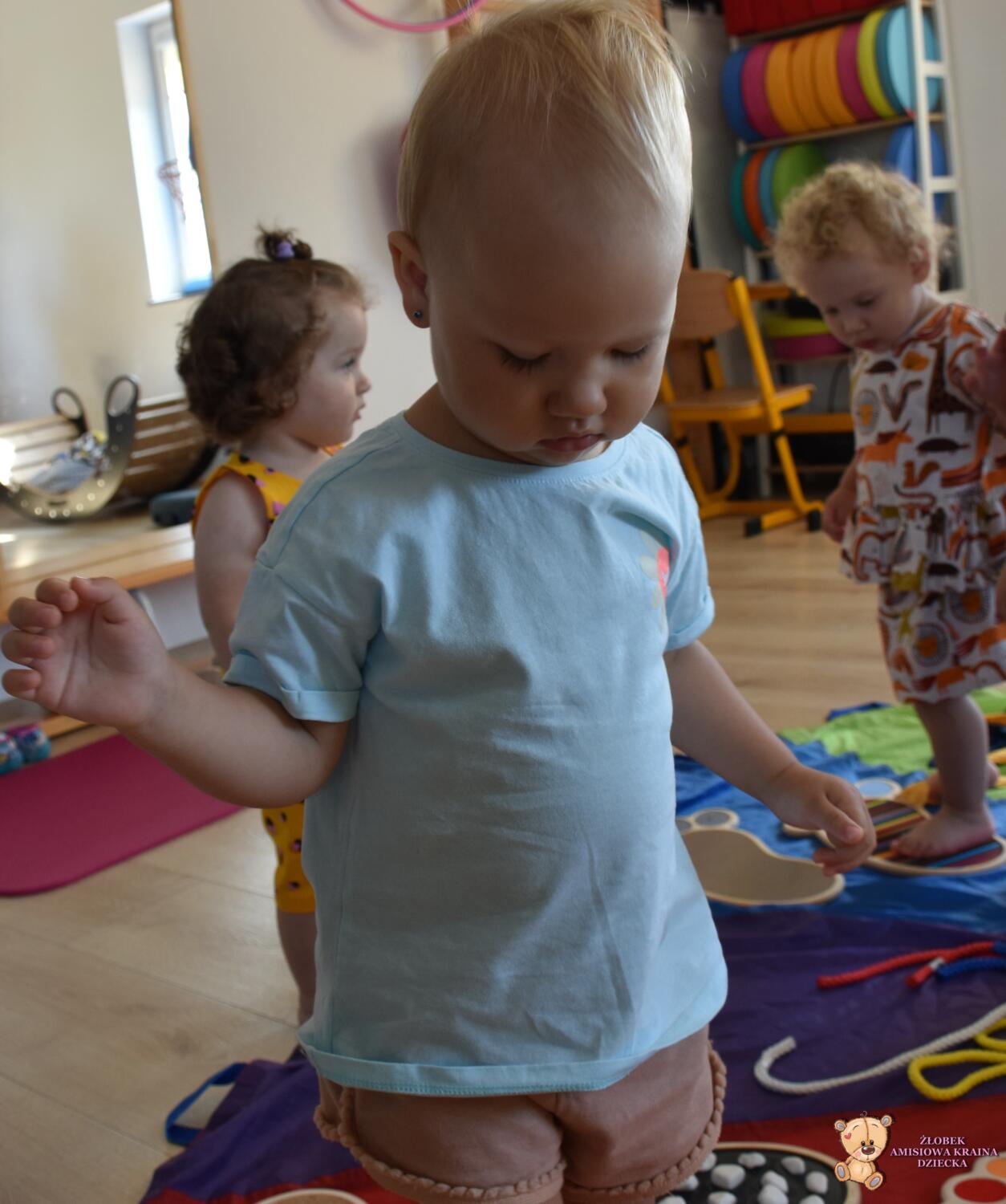 Dziś na zajęciach Integracji Sensorycznej Amisiaki stymulowały układ przedsionkowy, proprioceptynwy, dotykowy oraz rozwijały umiejętności równoważne. Na dobry początek Ciocia naszykowała pole sensoryczne, wyłożone różnorodnymi fakturami, po którym Amisiaki chodziły na boso, dotykały oraz kładły się. Następnie była zabawa w ,, sztorm na morzu „. Amisiaki huśtały się na platformie podwieszanej, musiały trzymać się mocno, gdy pojawiały się fale. Ta zabawa sprawiała Amisiakom dużą frajdę, zadowolenie oraz satysfakcję. Wspaniale!