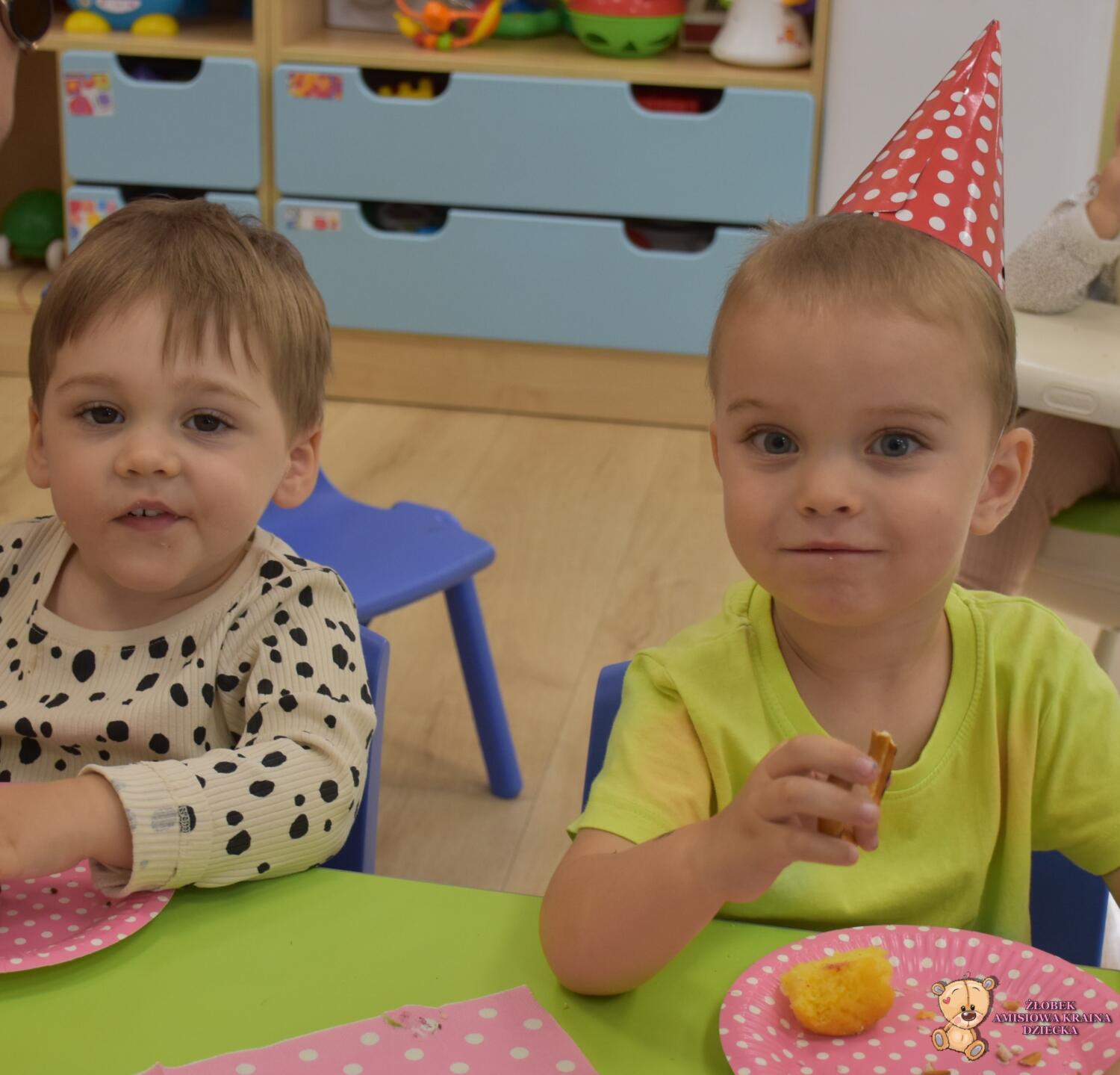 Dziś świętowaliśmy drugie urodziny Zuzi.W tym dniu towarzyszyła nam jej mama. Zabawę zaczęliśmy od wspólnego przywitania się i zaśpiewania sto lat. Następnie zasiedliśmy do stołu. Mama jubilatki przygotowała słodki poczęstunek. Zuziu jeszcze raz życzymy wszystkiego najlepszego!!