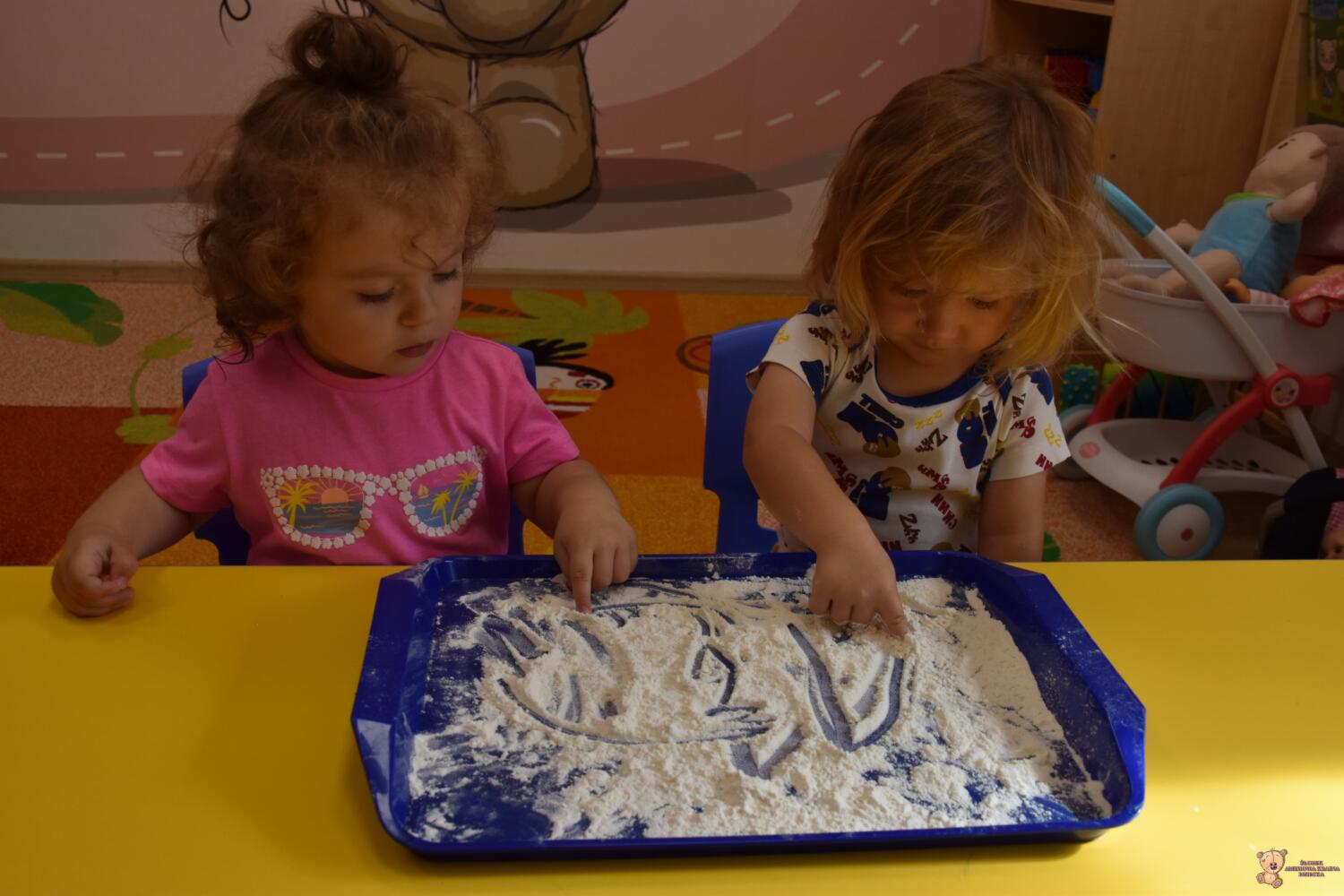 Dziś na zajęciach Małe Bystrzaki poznaliśmy cyferkę 1.Pokazywalismy na paluszkach ile to jest palców ,na zabawkach który to jest klawisz a co było najciekawsze pisaliśmy na tacy z mąką.To była dopiero śmieszna zabawa, pouczająca,a zarazem ucząca pisać ta cyferkę