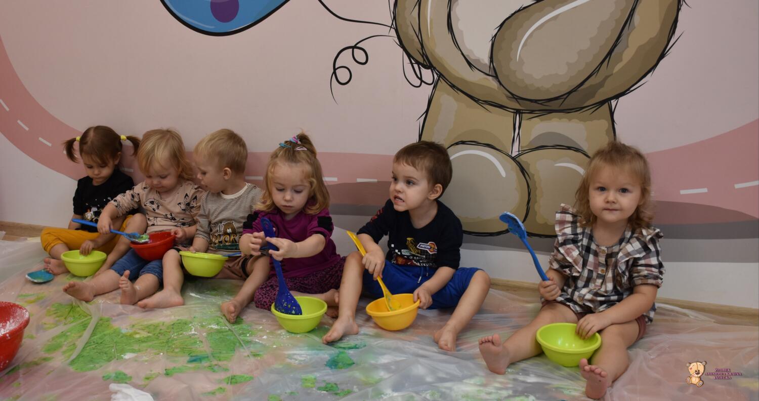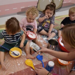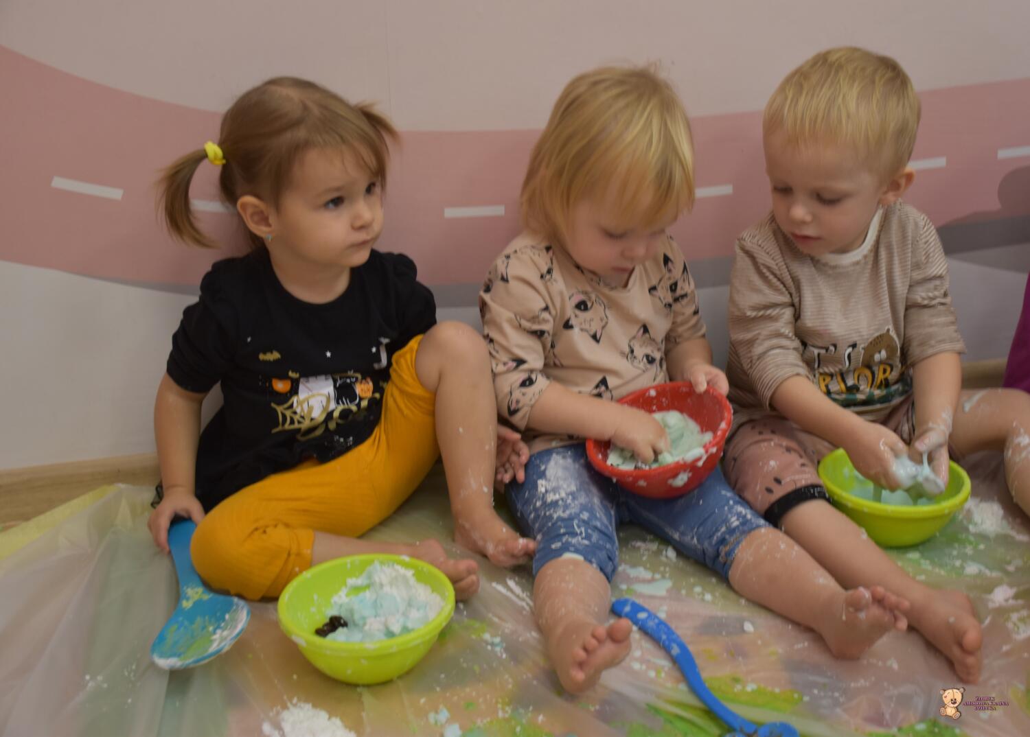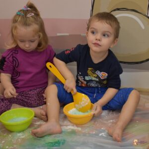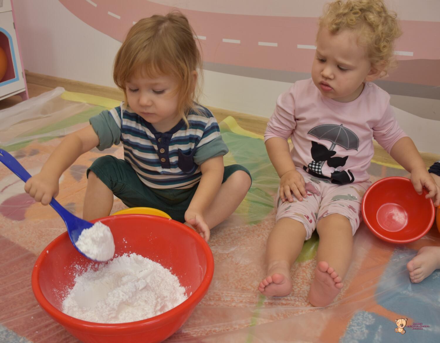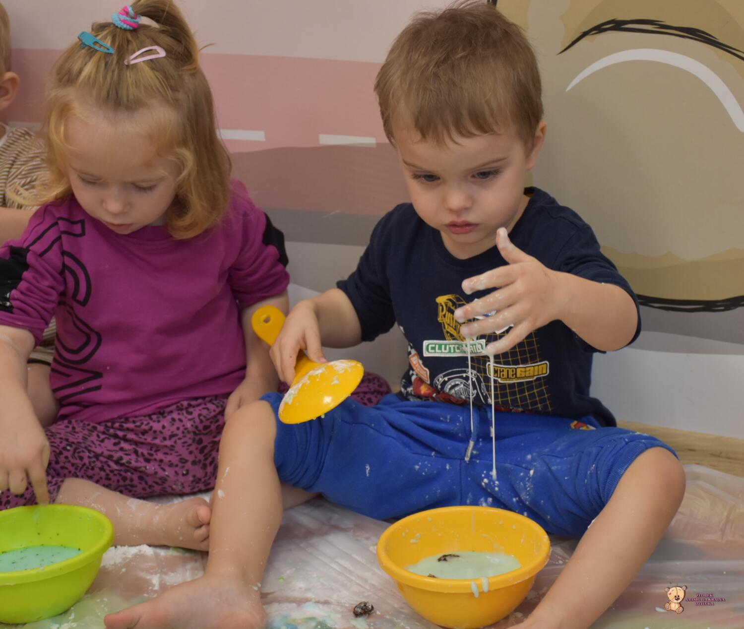 Dzisiaj na zajęciach sensoplastyki dzieci robiły masę zwaną cieczą nieniutonowską. Same z pomocą cioci wsypywały do miseczek składniki i je proporcjowały. Ugniatały w rękach i lepiły. Była to dla nich świetna zabawa.