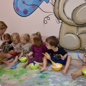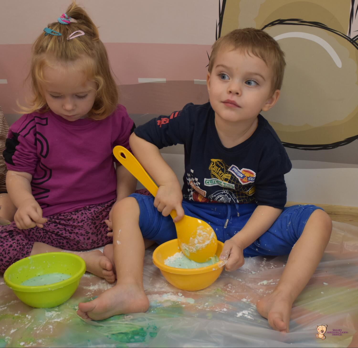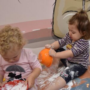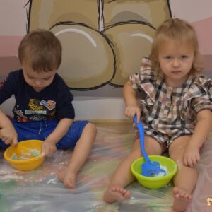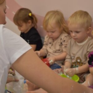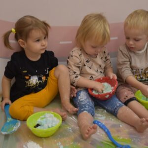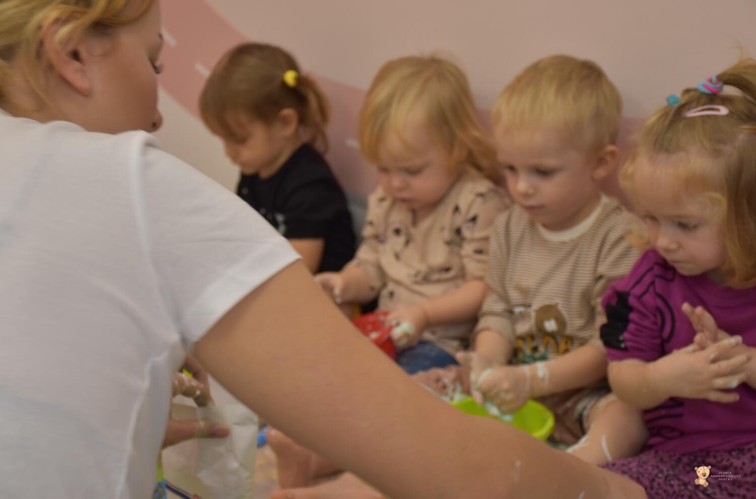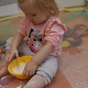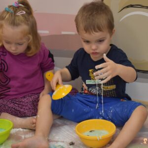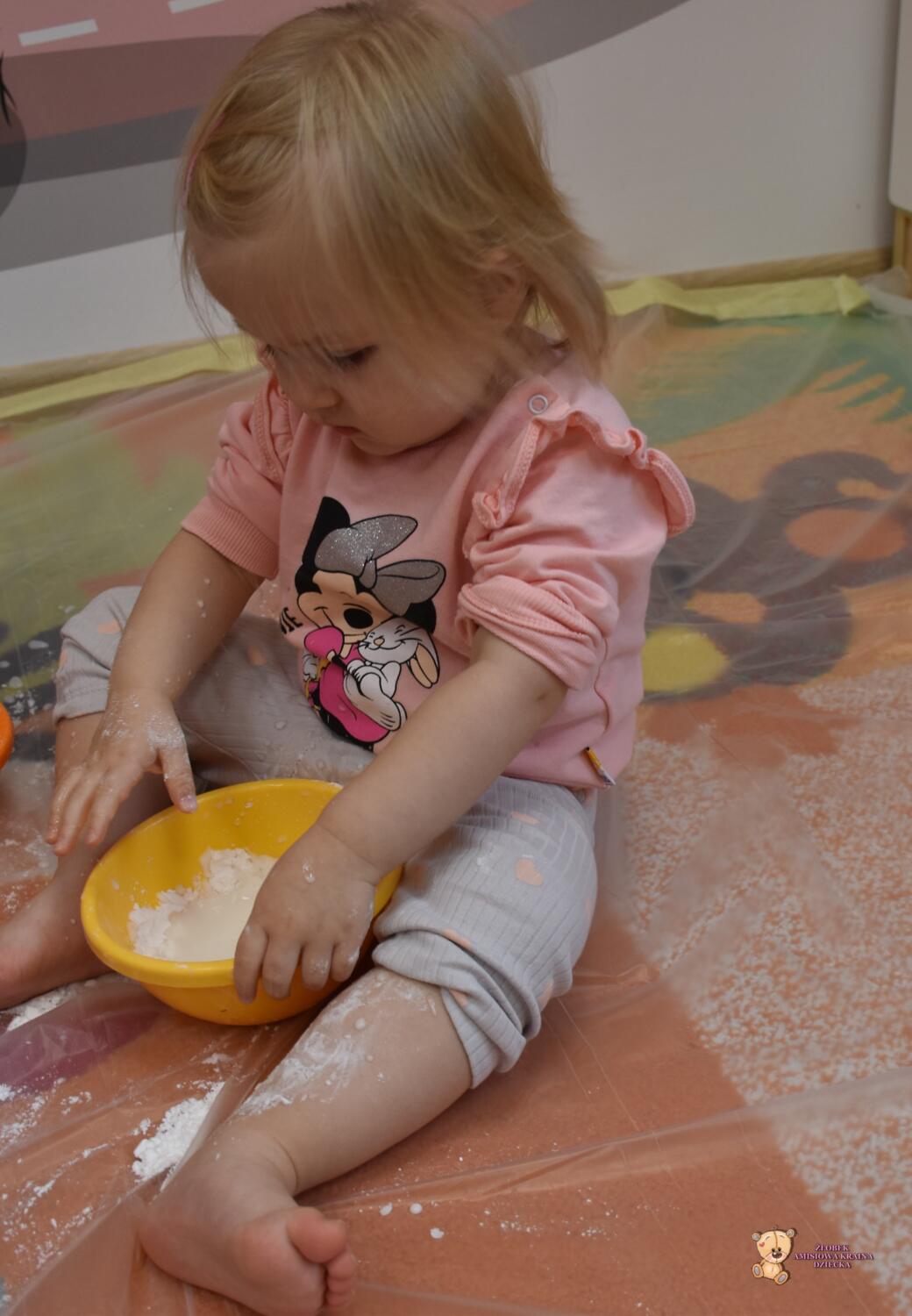 Dzisiaj na zajęciach sensoplastyki dzieci robiły masę zwaną cieczą nieniutonowską. Same z pomocą cioci wsypywały do miseczek składniki i je proporcjowały. Ugniatały w rękach i lepiły. Była to dla nich świetna zabawa.