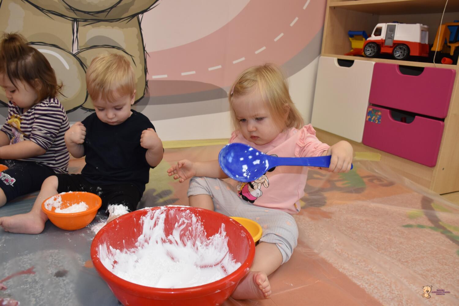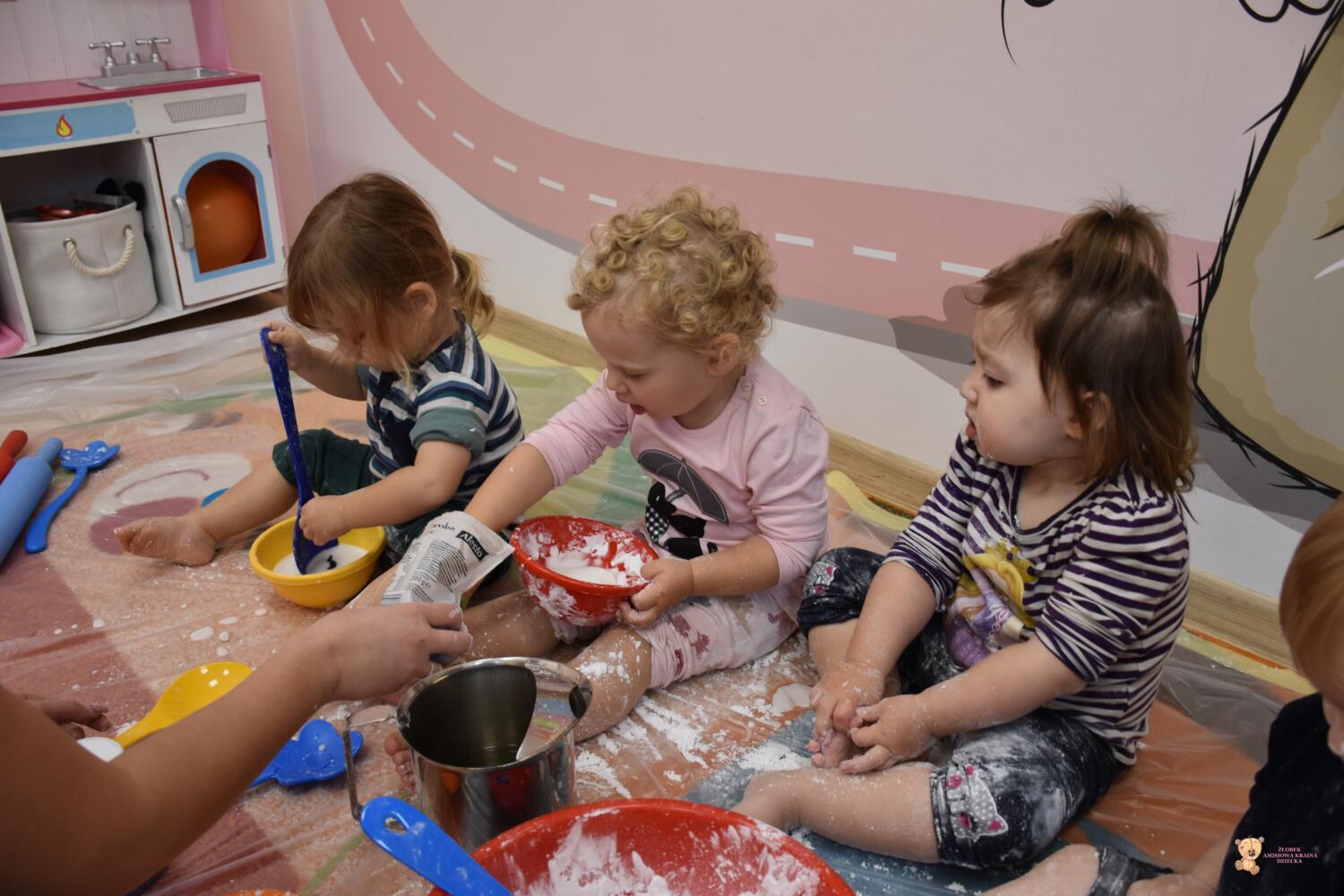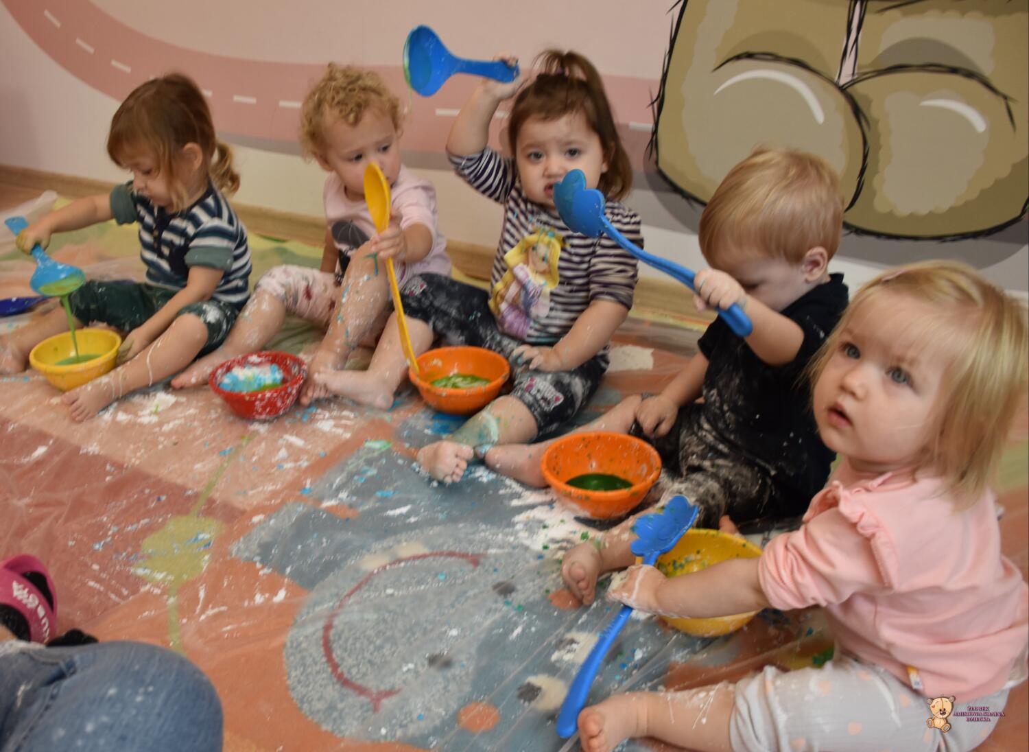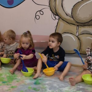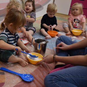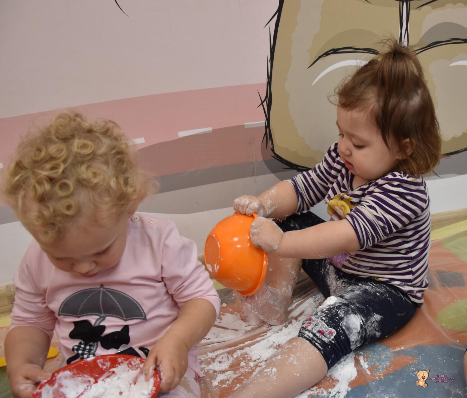 Dzisiaj na zajęciach sensoplastyki dzieci robiły masę zwaną cieczą nieniutonowską. Same z pomocą cioci wsypywały do miseczek składniki i je proporcjowały. Ugniatały w rękach i lepiły. Była to dla nich świetna zabawa.