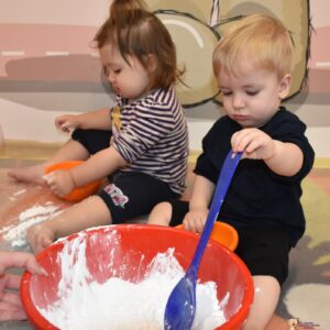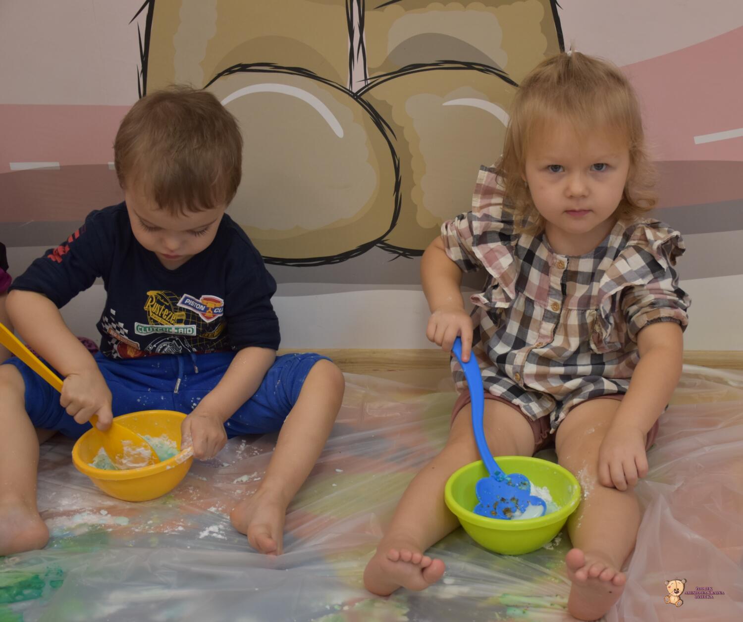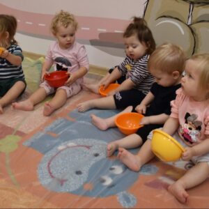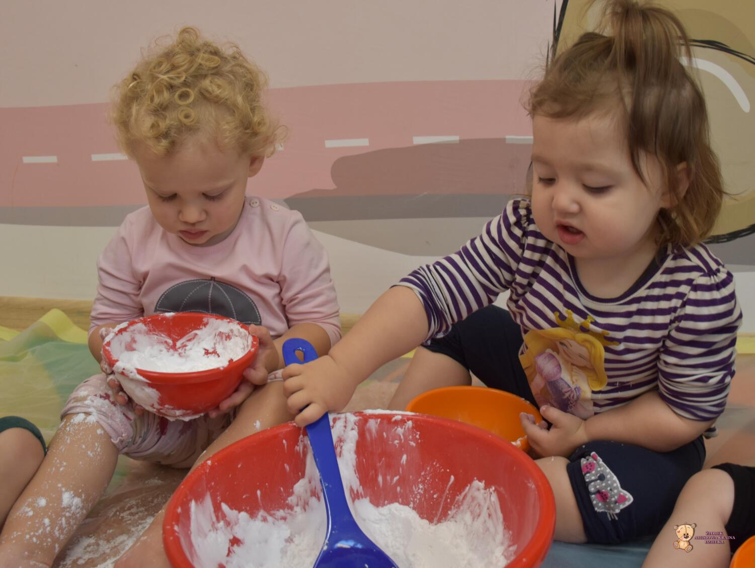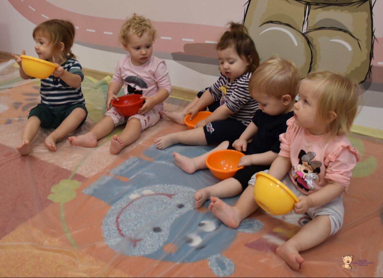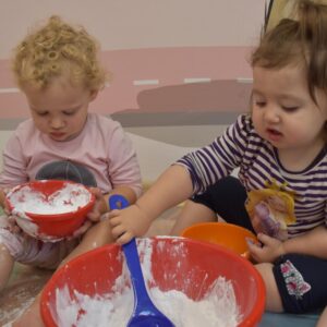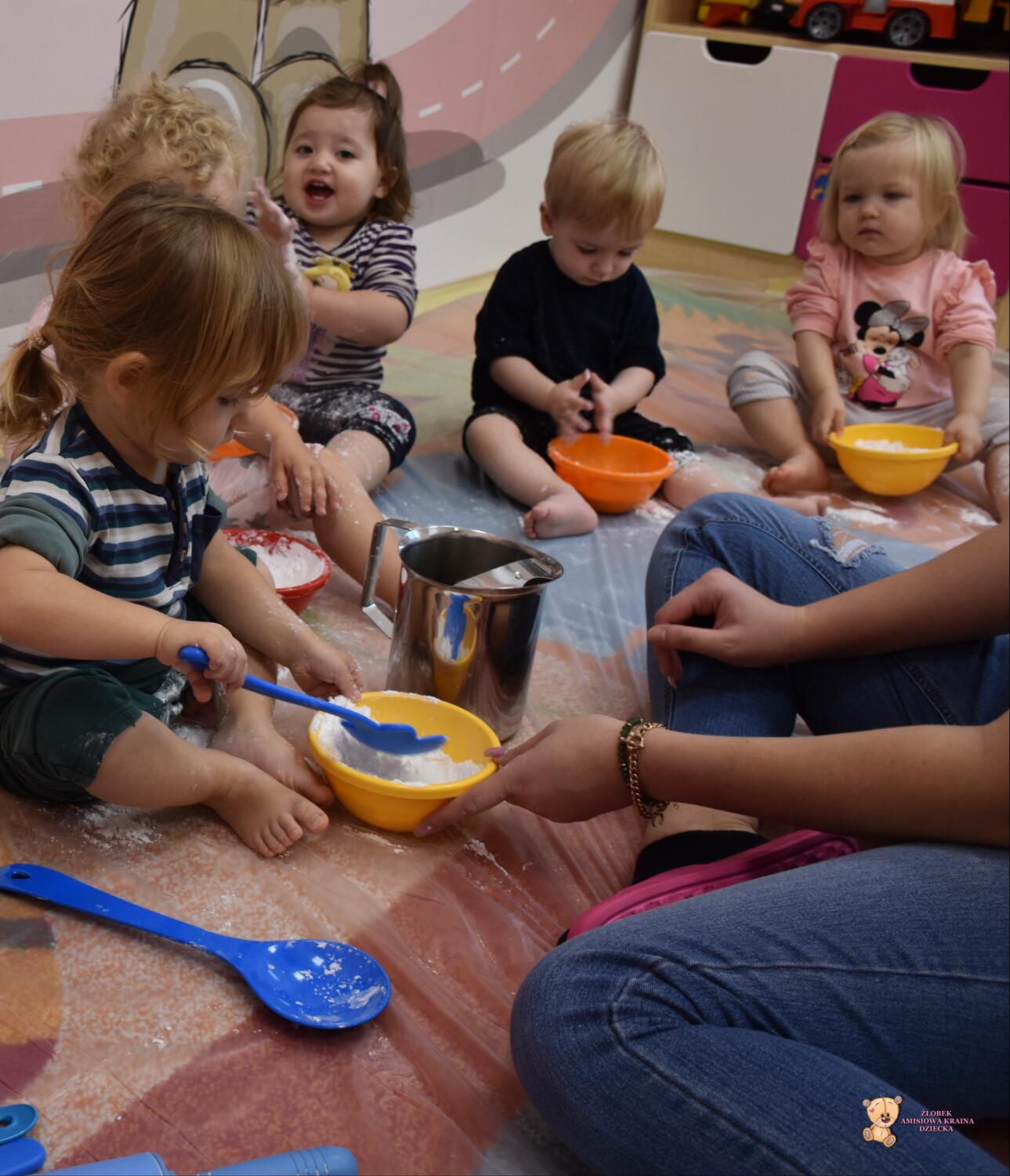 Dzisiaj na zajęciach sensoplastyki dzieci robiły masę zwaną cieczą nieniutonowską. Same z pomocą cioci wsypywały do miseczek składniki i je proporcjowały. Ugniatały w rękach i lepiły. Była to dla nich świetna zabawa.