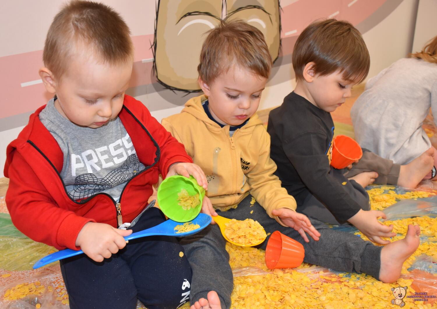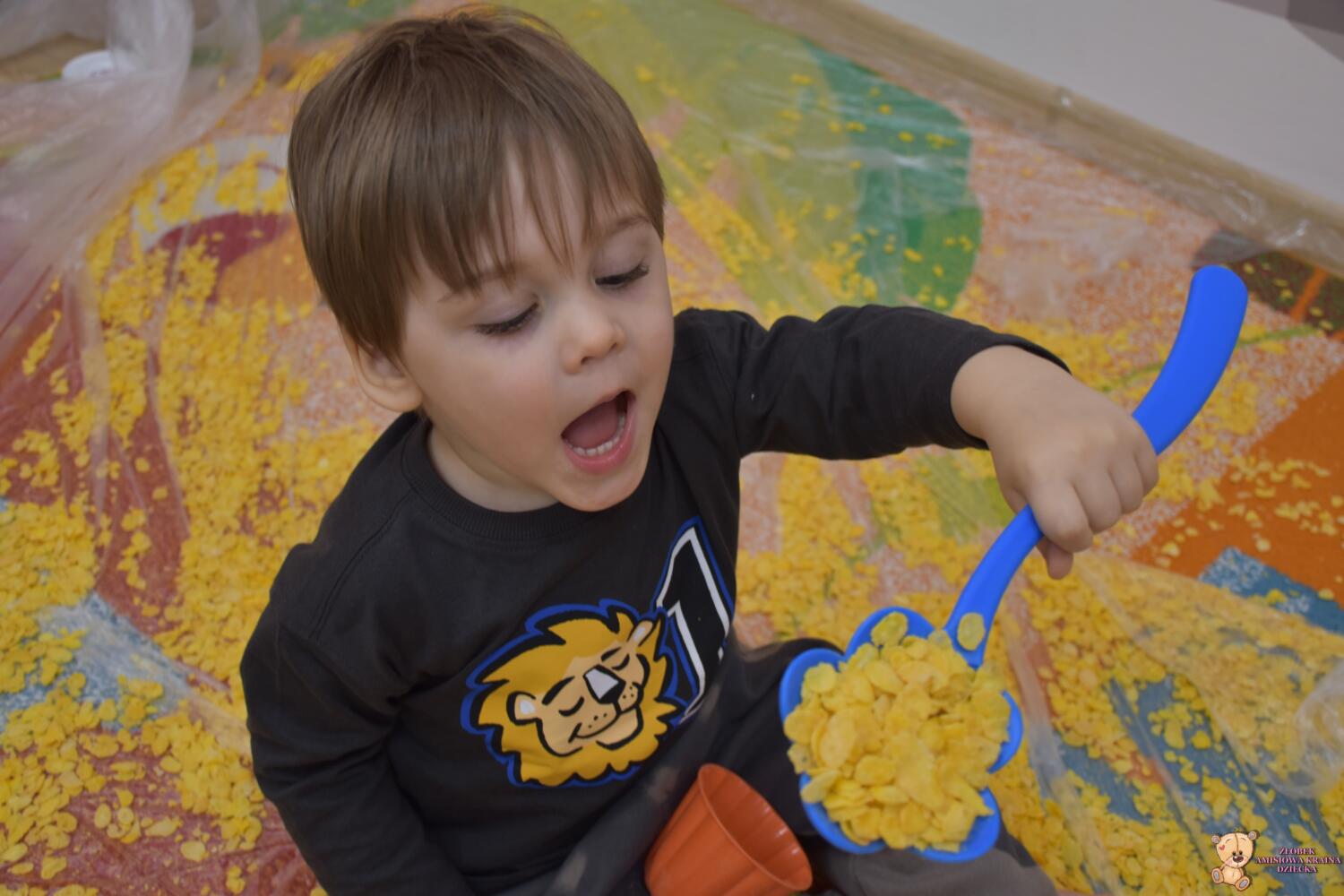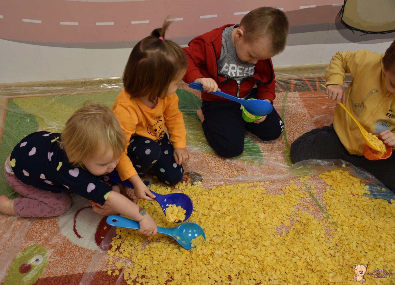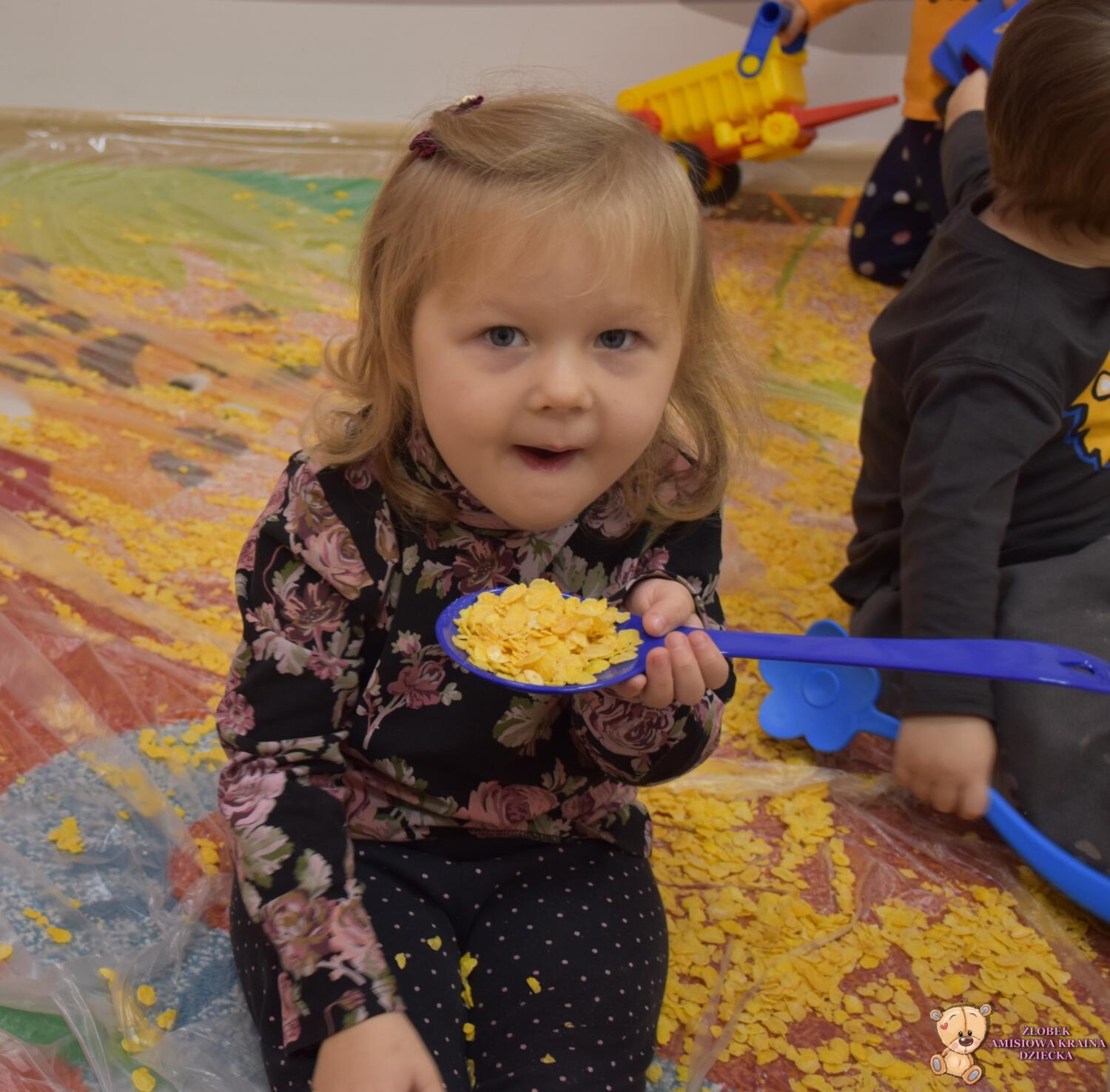 Na dzisiejszych zajęciach sensoplastyki nasze AMIsiaki bawiły się w piaskownicy płatków kukurydzianych. Przesypywały do foremek gniotły je w rączkach rozwijając przy tym zmysły takie jak dotyk, węch oraz rozwój poznawczy.
