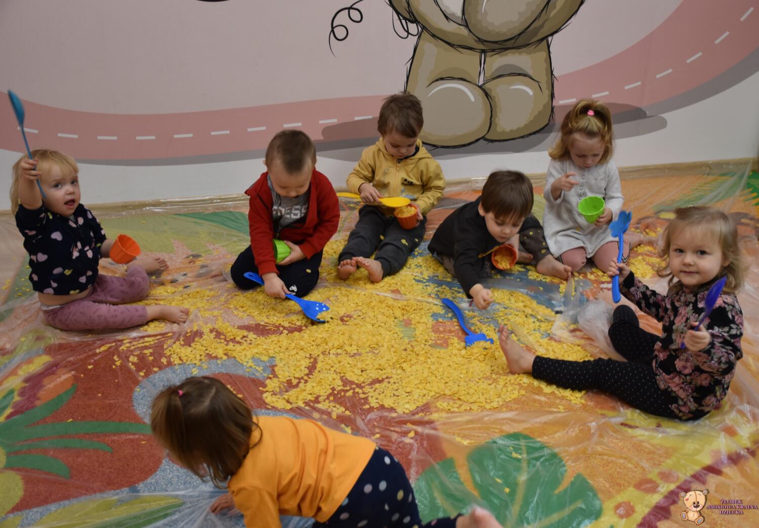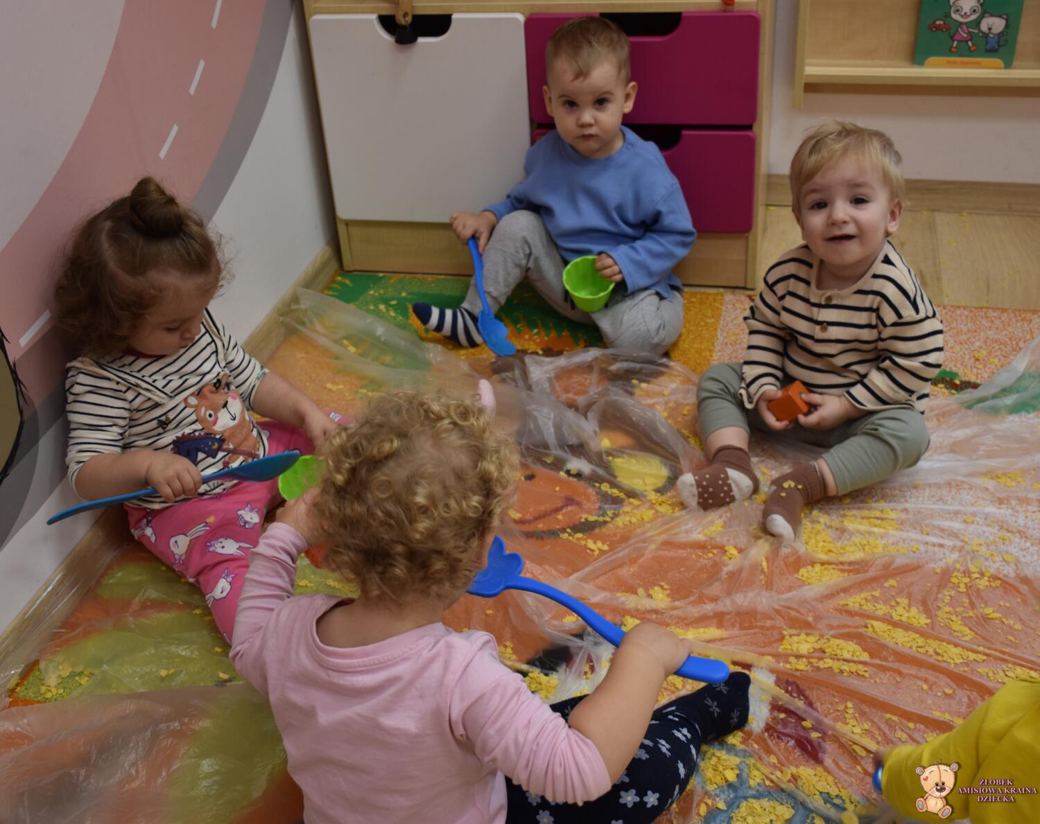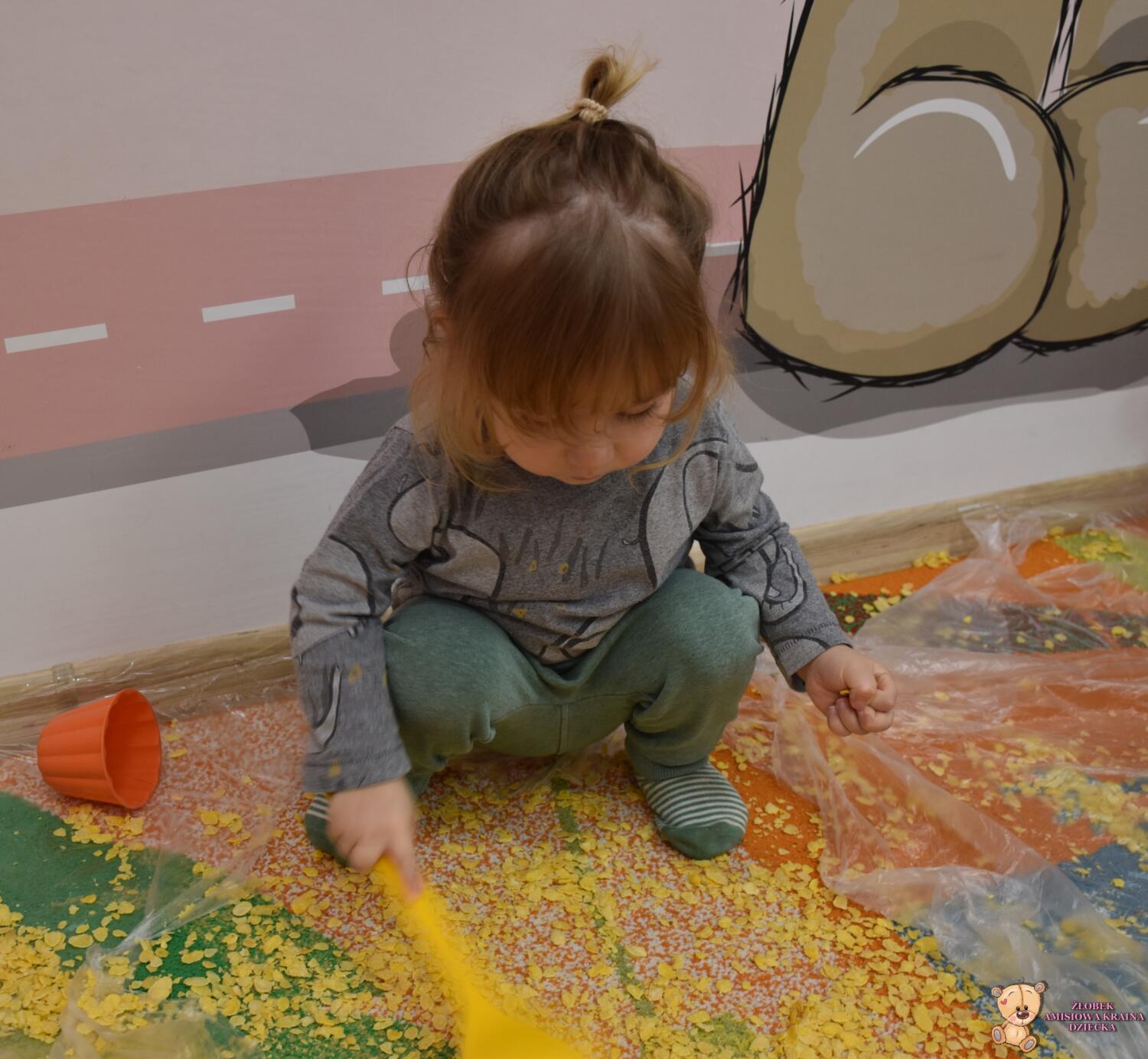 Na dzisiejszych zajęciach sensoplastyki nasze AMIsiaki bawiły się w piaskownicy płatków kukurydzianych. Przesypywały do foremek gniotły je w rączkach rozwijając przy tym zmysły takie jak dotyk, węch oraz rozwój poznawczy.