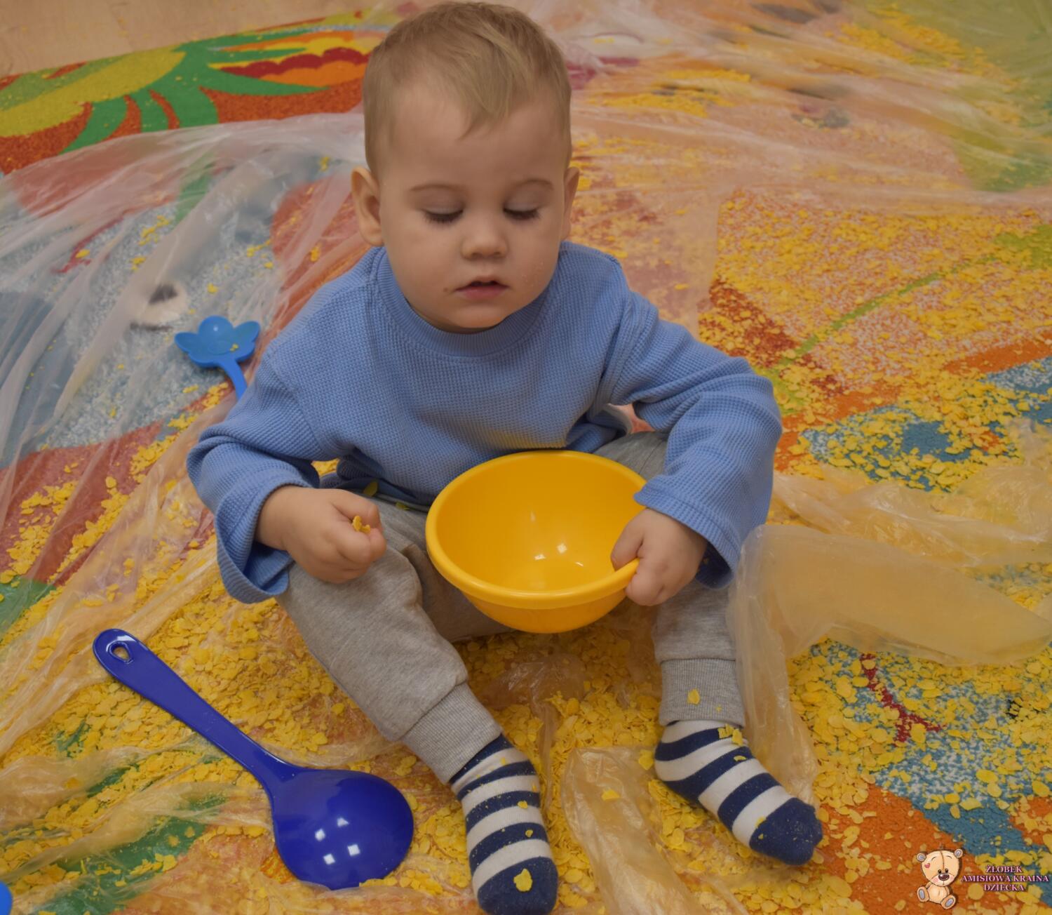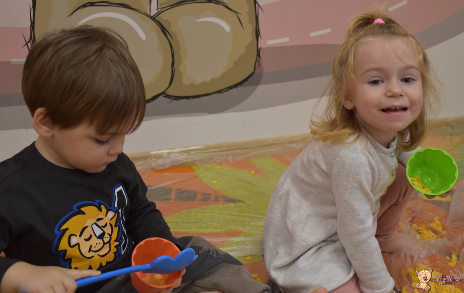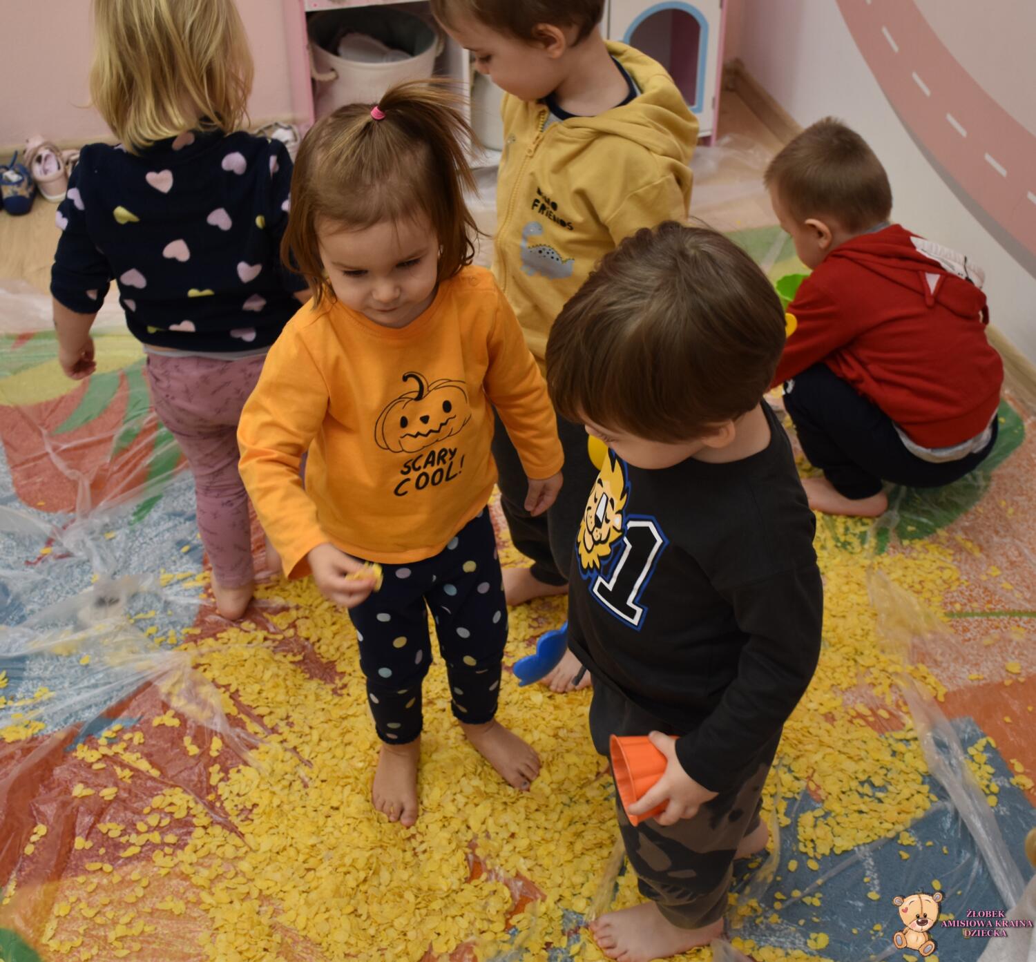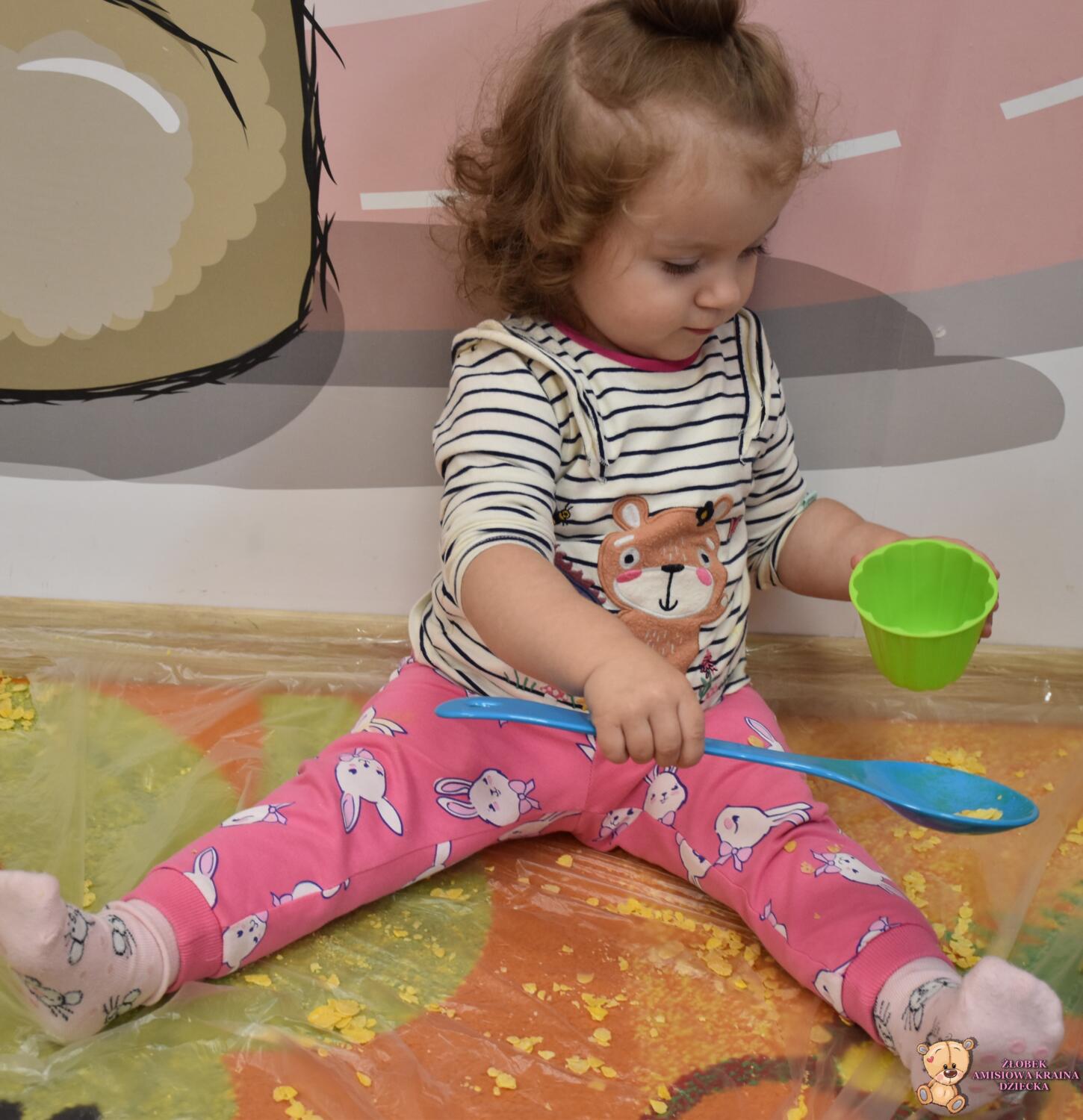 Na dzisiejszych zajęciach sensoplastyki nasze AMIsiaki bawiły się w piaskownicy płatków kukurydzianych. Przesypywały do foremek gniotły je w rączkach rozwijając przy tym zmysły takie jak dotyk, węch oraz rozwój poznawczy.