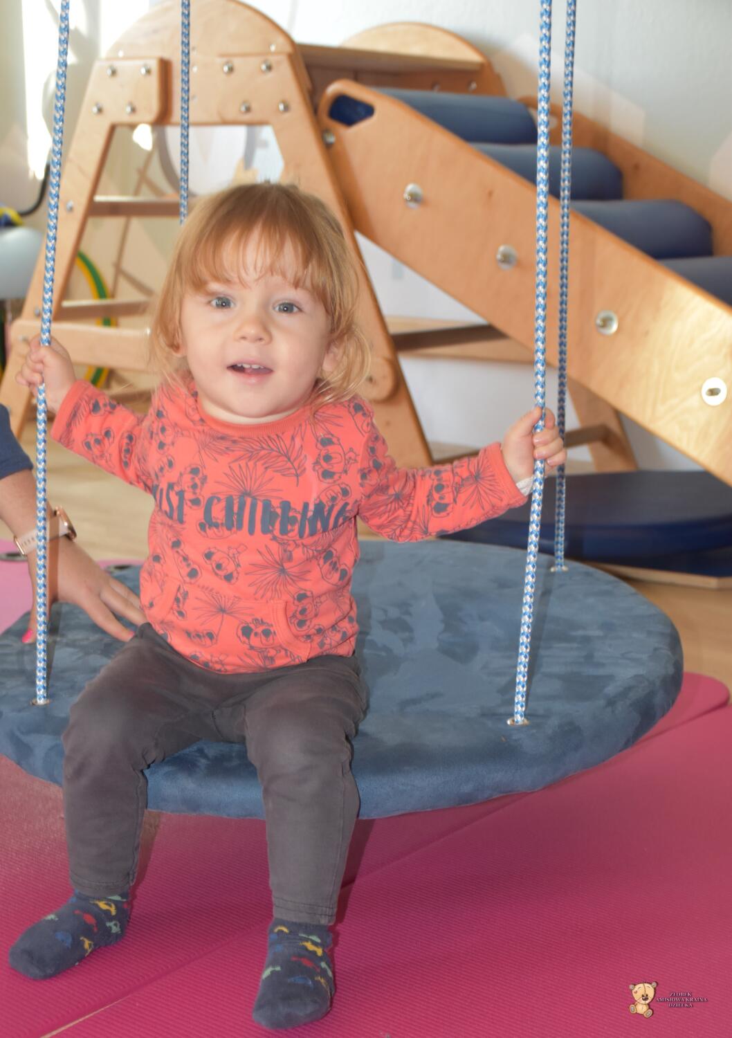 Dziś na zajęciach Integracji Sensorycznej sporo wrażeń przedsionkowych, dotykowych i proprioceptywnych. Amisiaki skorzystały w dwóch huśtawek. Na okrągłej platformie, w ruchu lokalizowały przedmioty w sali. W hamaku można było się schować, wcisnąć ciałko, udawaliśmy loty w kosmos. Na koniec ścieżka sensorycza i rzut do celu. Trzeba było utrzymać równowagę, gdy chodziliśmy po dyskach. Brawo dla Amisiaków!