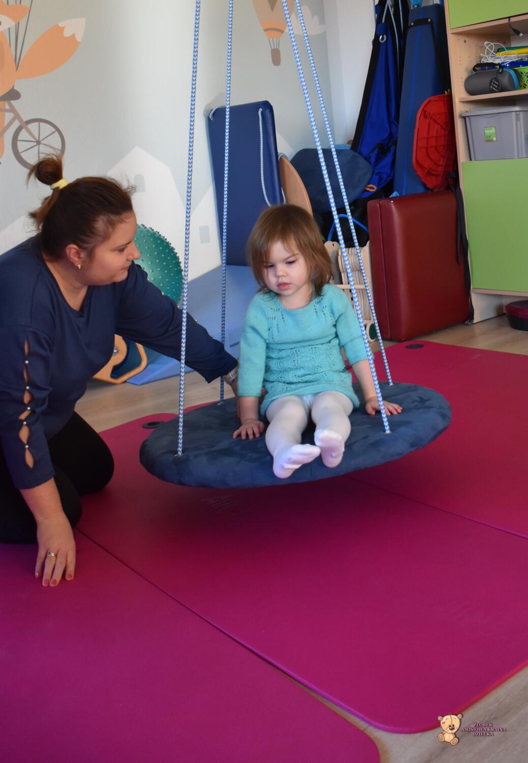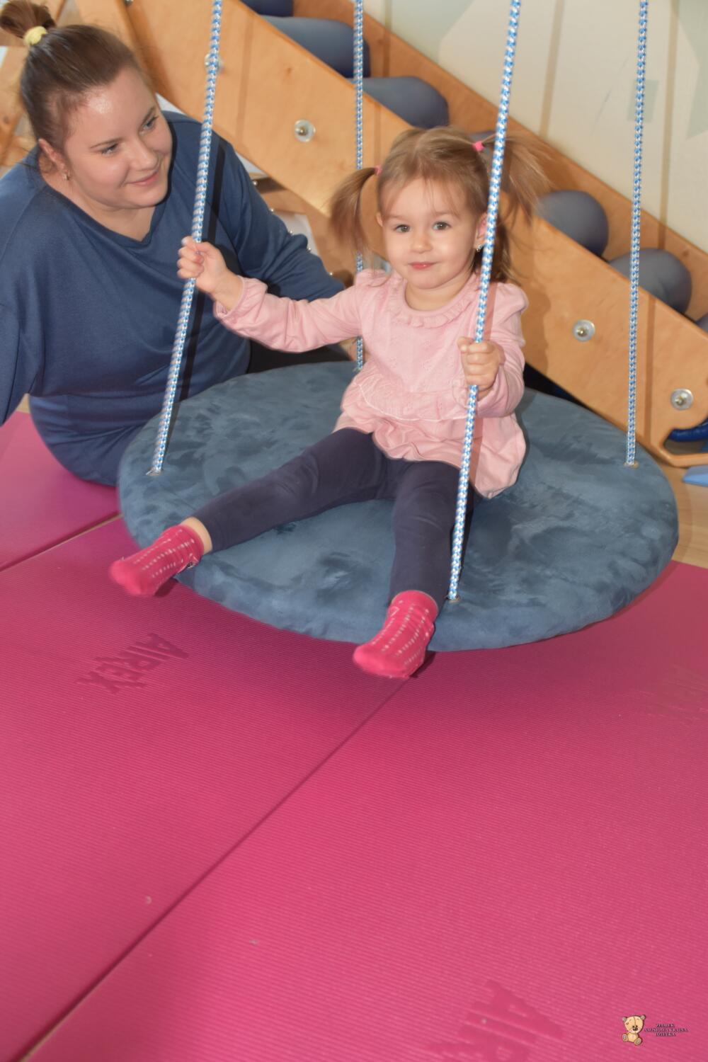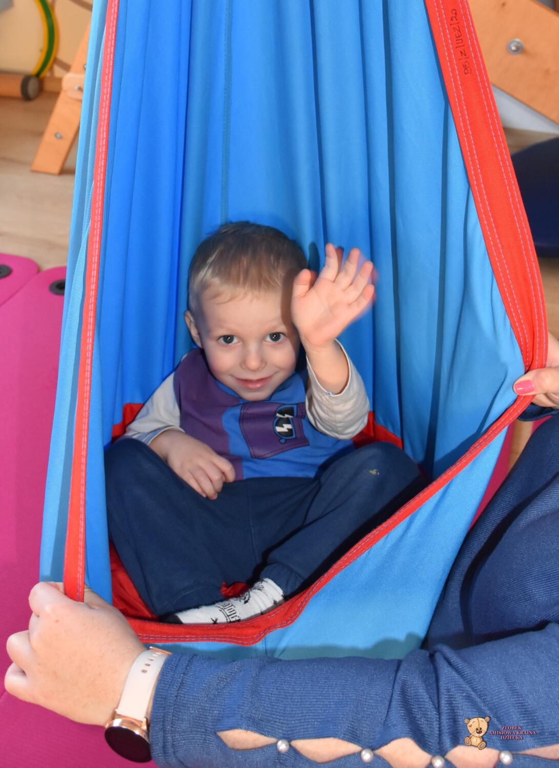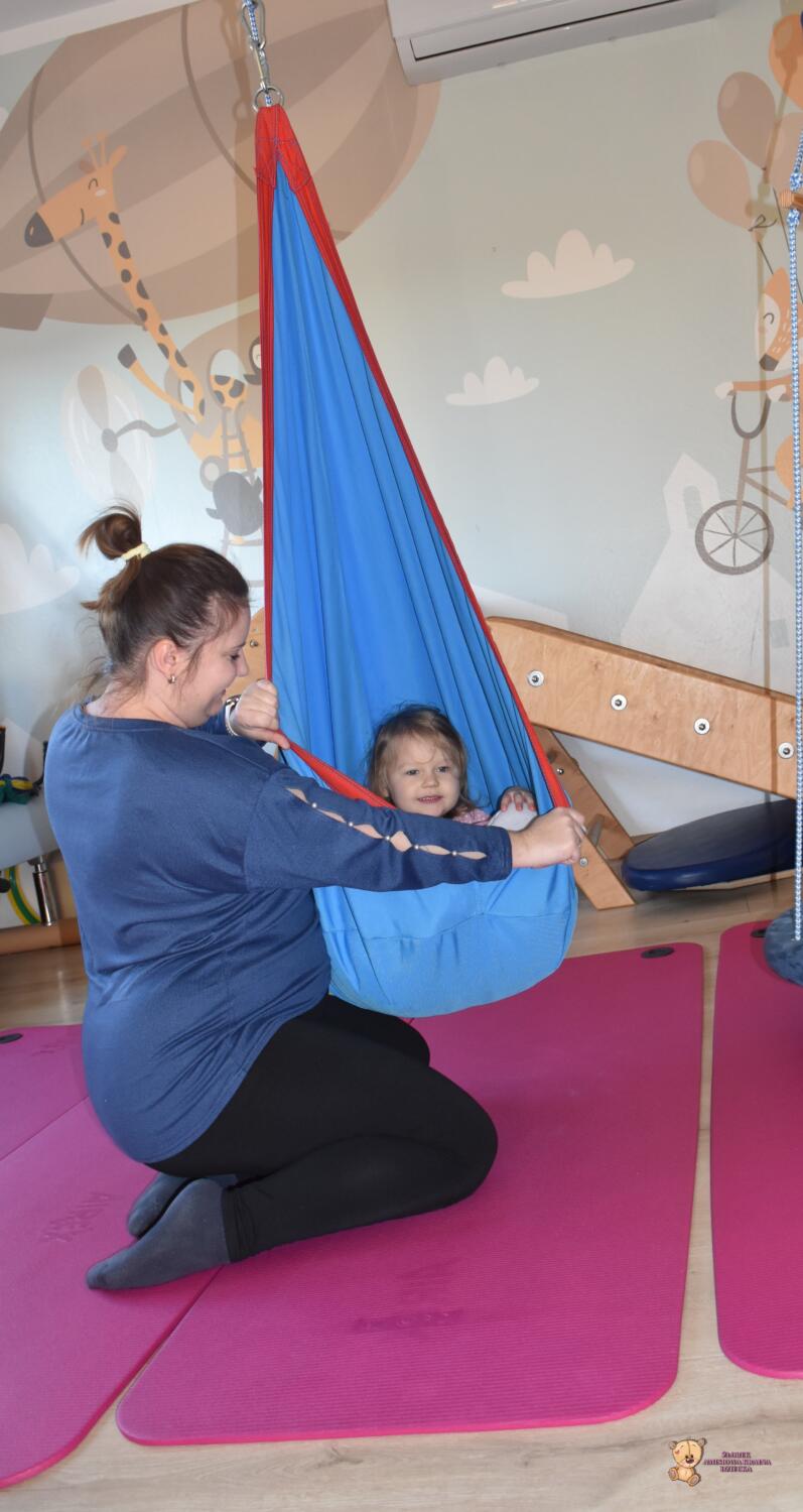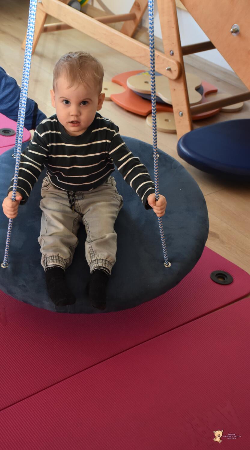 Dziś na zajęciach Integracji Sensorycznej sporo wrażeń przedsionkowych, dotykowych i proprioceptywnych. Amisiaki skorzystały w dwóch huśtawek. Na okrągłej platformie, w ruchu lokalizowały przedmioty w sali. W hamaku można było się schować, wcisnąć ciałko, udawaliśmy loty w kosmos. Na koniec ścieżka sensorycza i rzut do celu. Trzeba było utrzymać równowagę, gdy chodziliśmy po dyskach. Brawo dla Amisiaków!