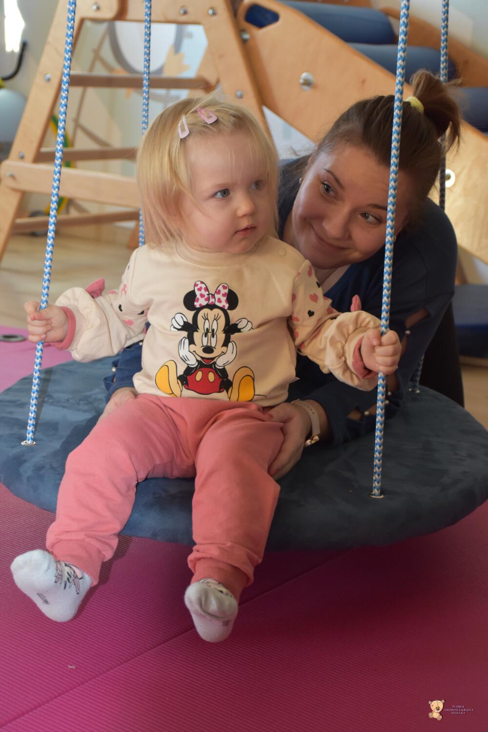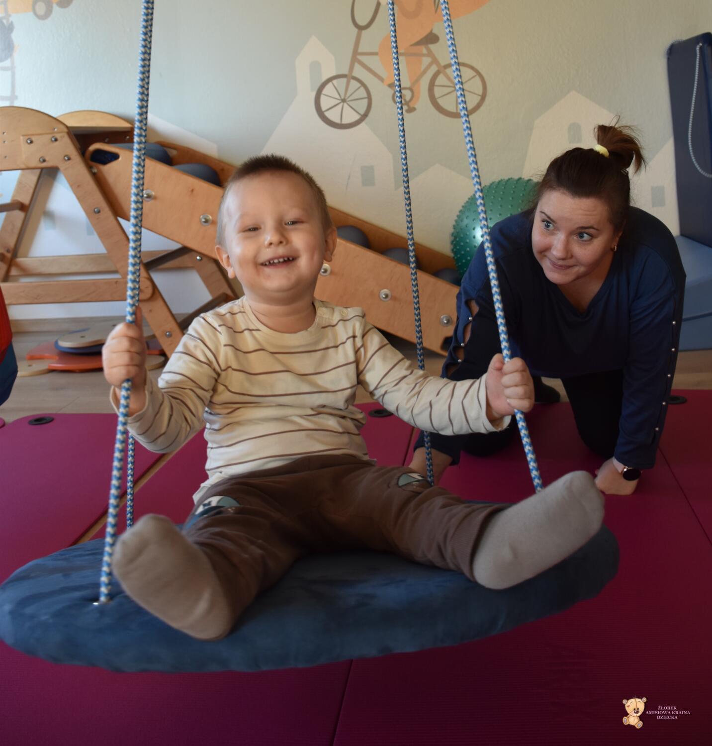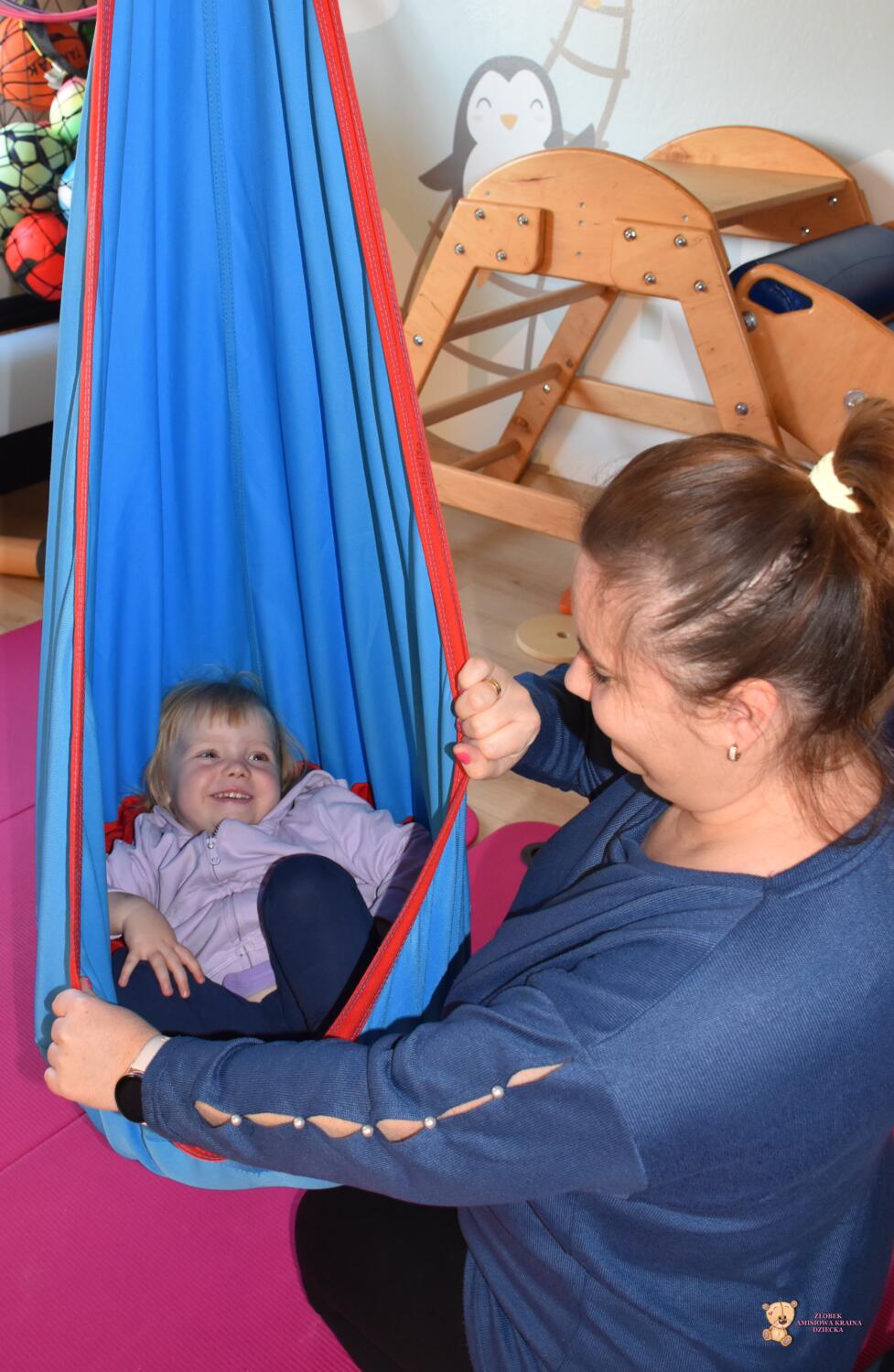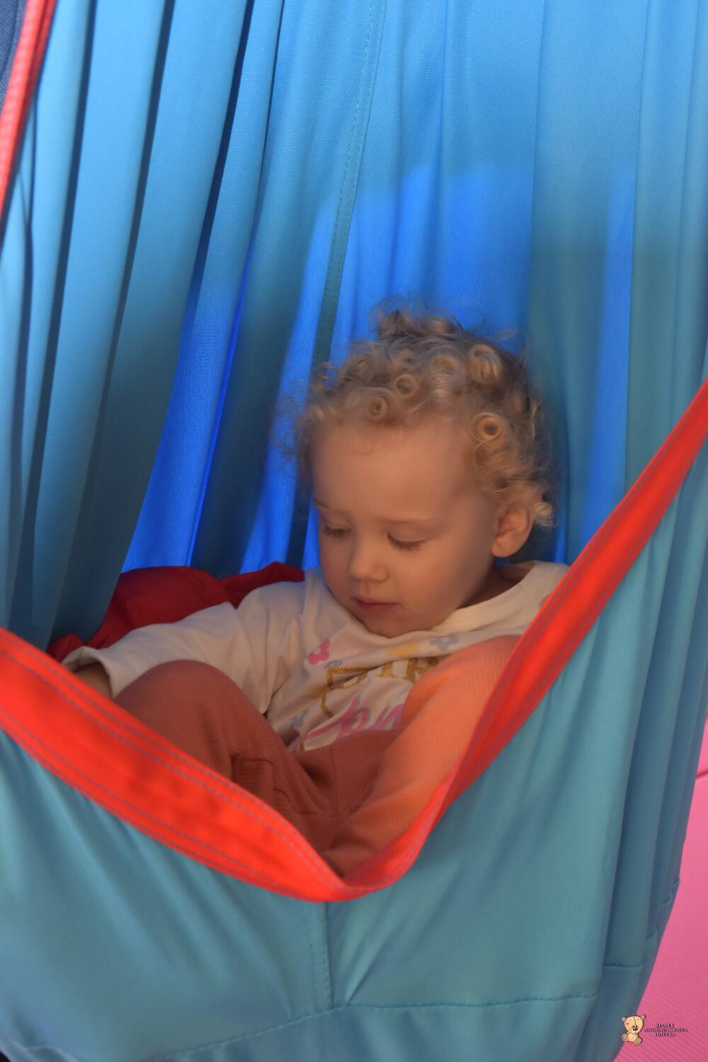 Dziś na zajęciach Integracji Sensorycznej sporo wrażeń przedsionkowych, dotykowych i proprioceptywnych. Amisiaki skorzystały w dwóch huśtawek. Na okrągłej platformie, w ruchu lokalizowały przedmioty w sali. W hamaku można było się schować, wcisnąć ciałko, udawaliśmy loty w kosmos. Na koniec ścieżka sensorycza i rzut do celu. Trzeba było utrzymać równowagę, gdy chodziliśmy po dyskach. Brawo dla Amisiaków!