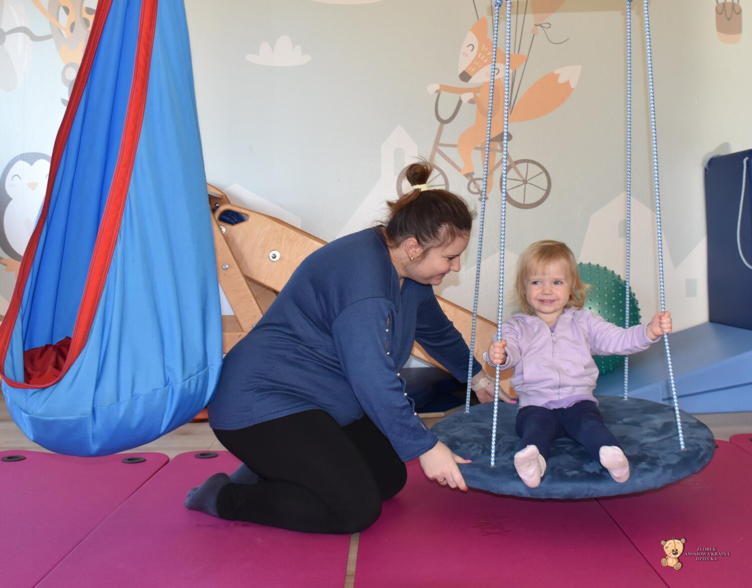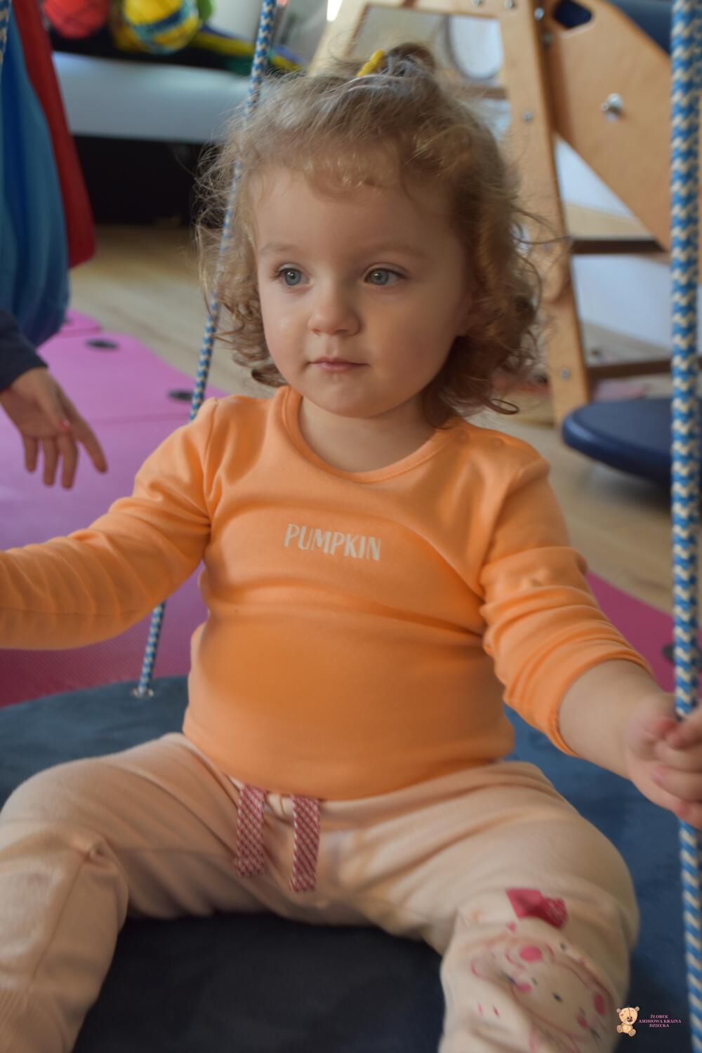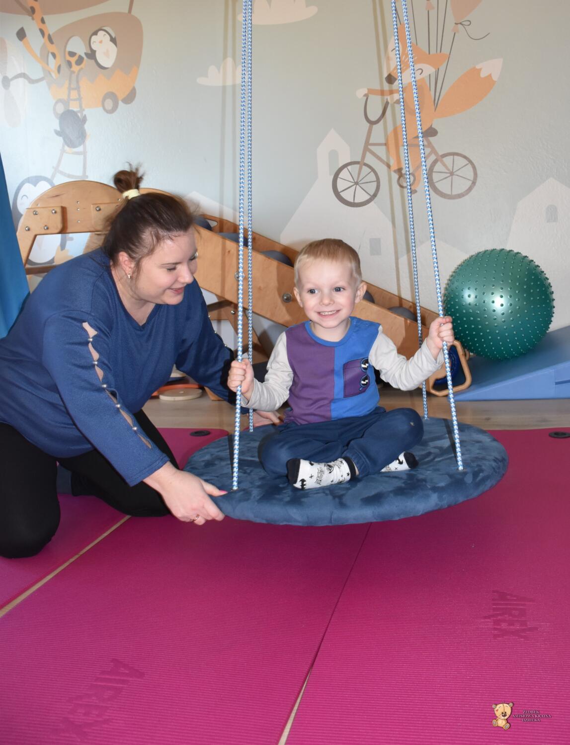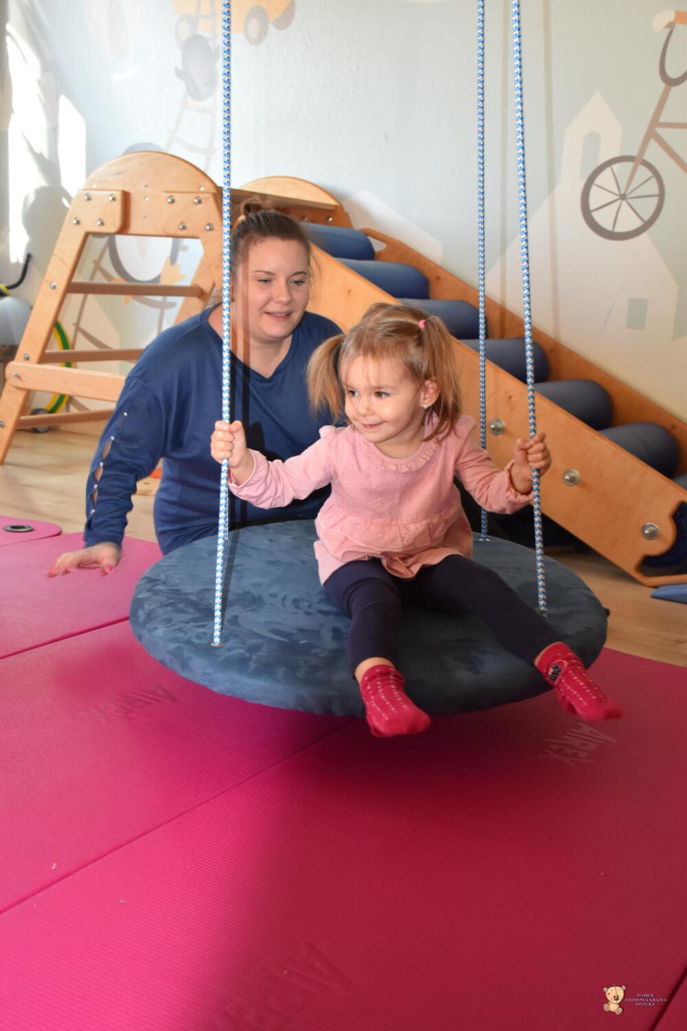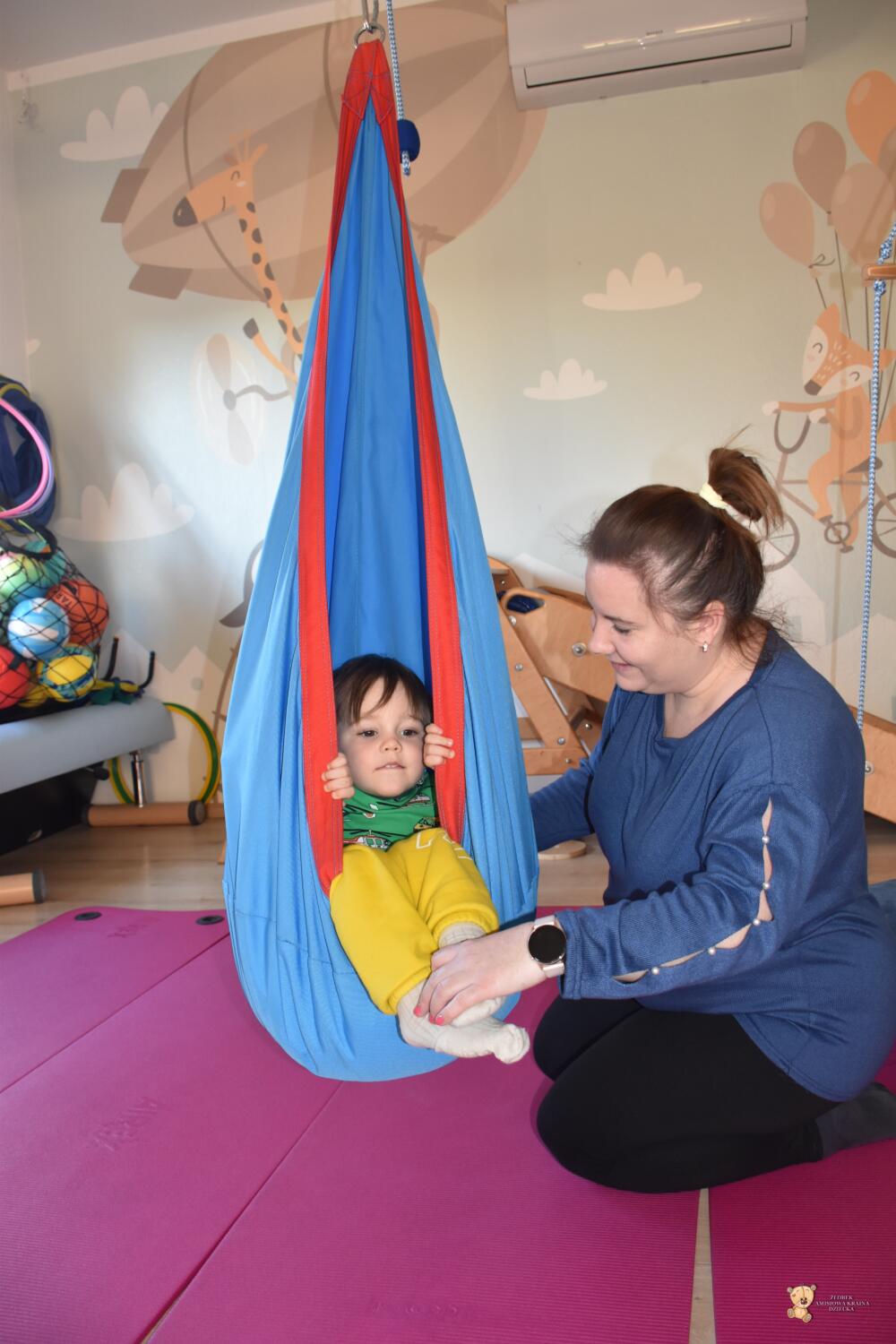 Dziś na zajęciach Integracji Sensorycznej sporo wrażeń przedsionkowych, dotykowych i proprioceptywnych. Amisiaki skorzystały w dwóch huśtawek. Na okrągłej platformie, w ruchu lokalizowały przedmioty w sali. W hamaku można było się schować, wcisnąć ciałko, udawaliśmy loty w kosmos. Na koniec ścieżka sensorycza i rzut do celu. Trzeba było utrzymać równowagę, gdy chodziliśmy po dyskach. Brawo dla Amisiaków!