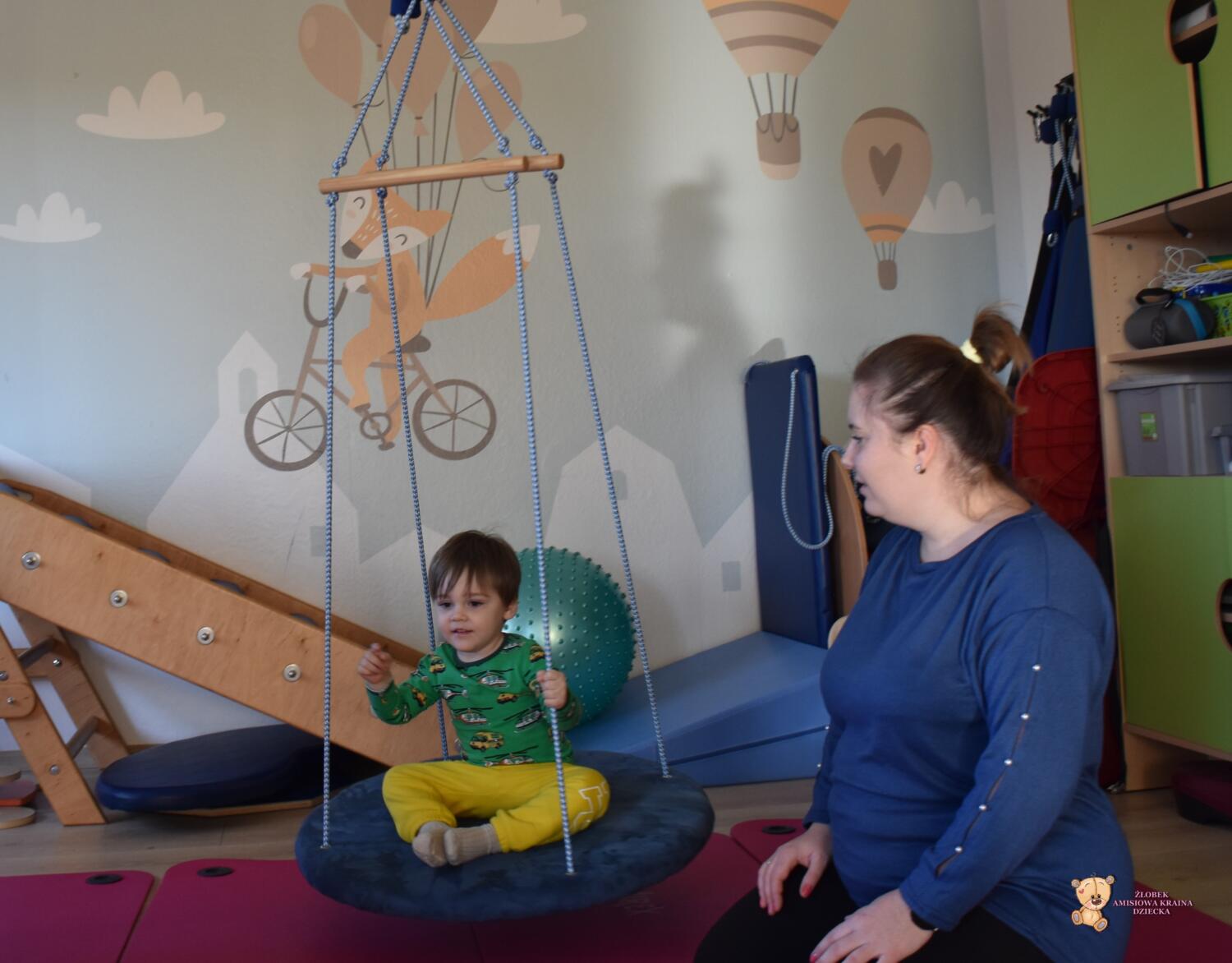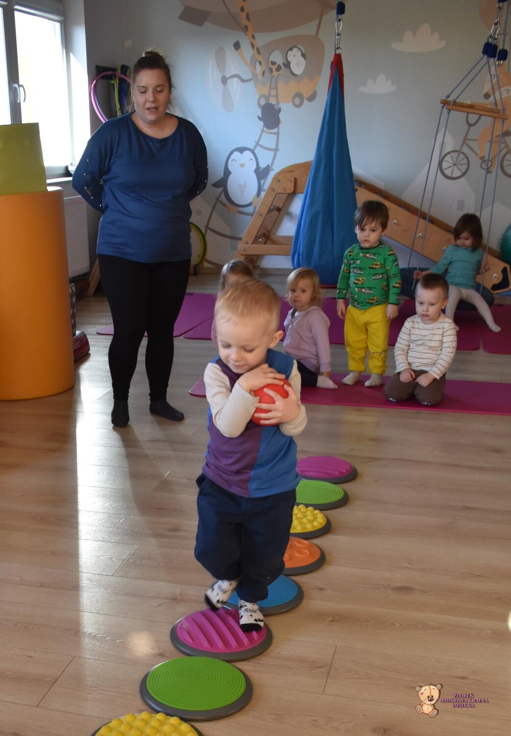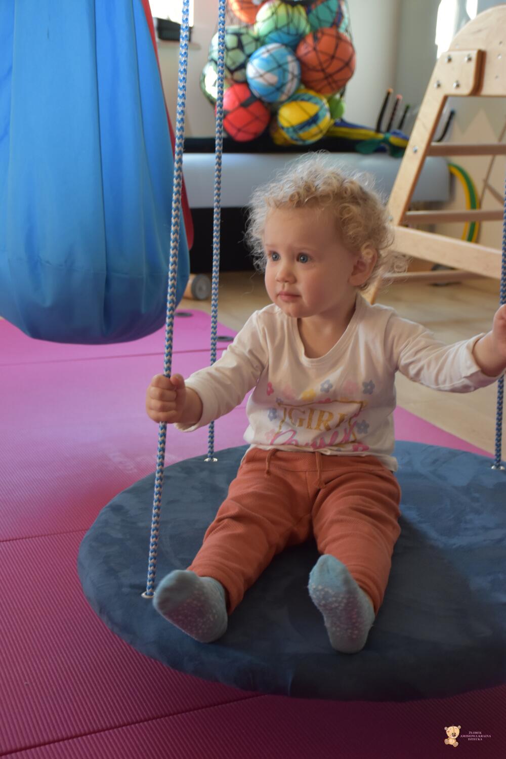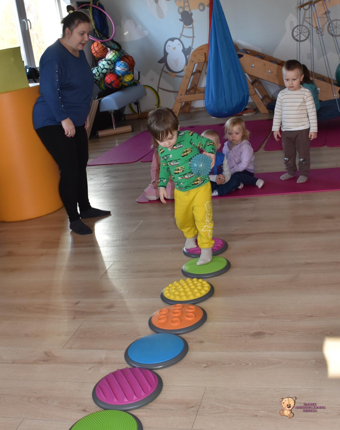 Dziś na zajęciach Integracji Sensorycznej sporo wrażeń przedsionkowych, dotykowych i proprioceptywnych. Amisiaki skorzystały w dwóch huśtawek. Na okrągłej platformie, w ruchu lokalizowały przedmioty w sali. W hamaku można było się schować, wcisnąć ciałko, udawaliśmy loty w kosmos. Na koniec ścieżka sensorycza i rzut do celu. Trzeba było utrzymać równowagę, gdy chodziliśmy po dyskach. Brawo dla Amisiaków!