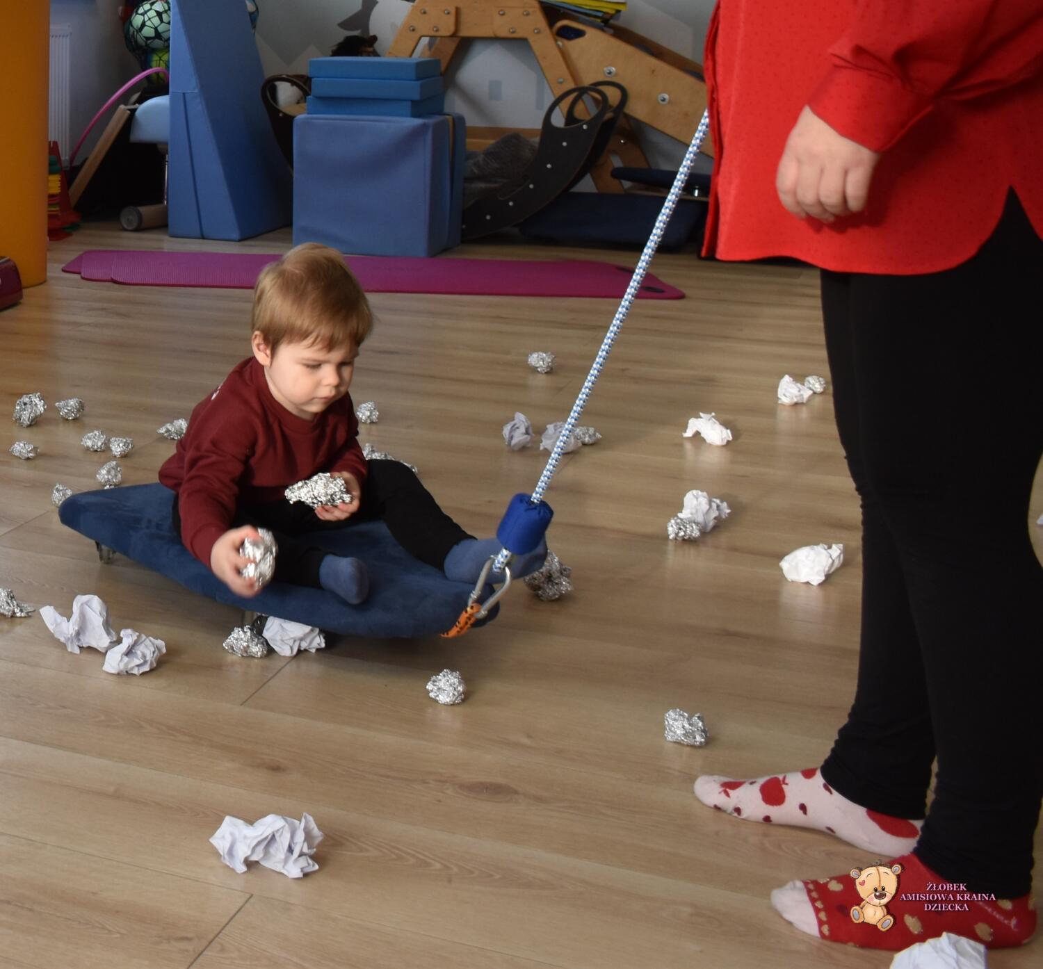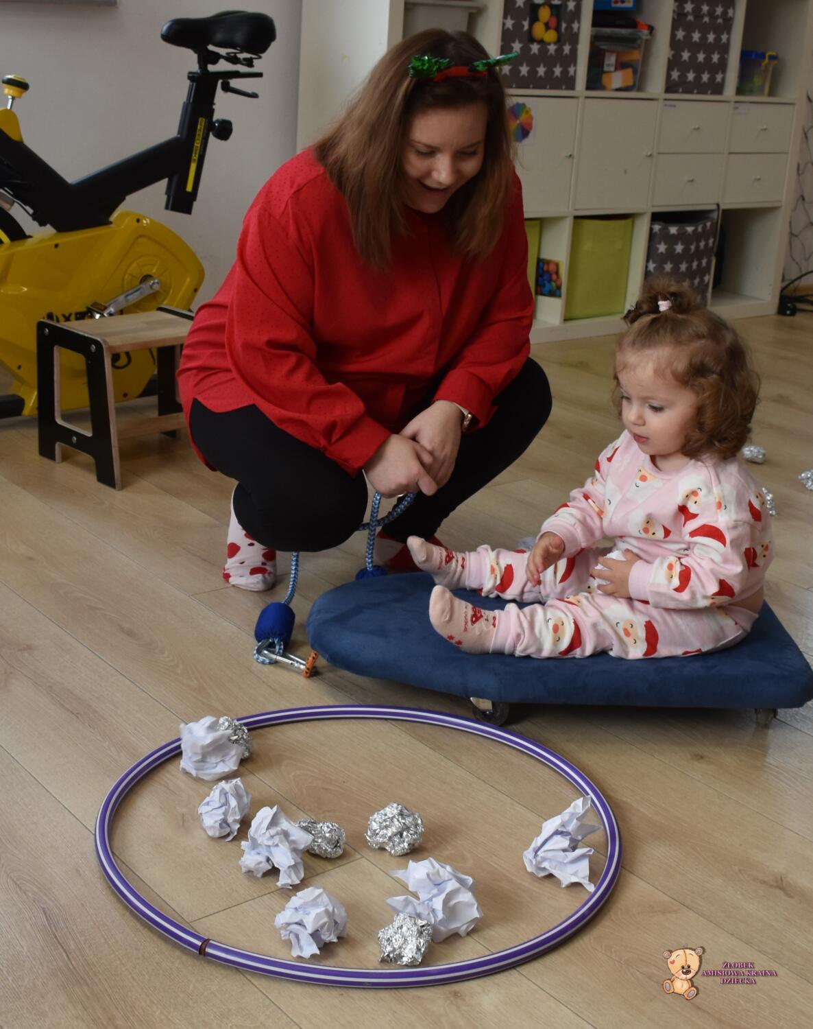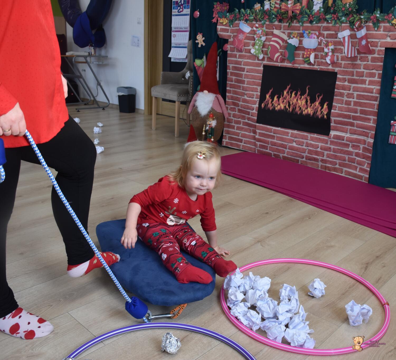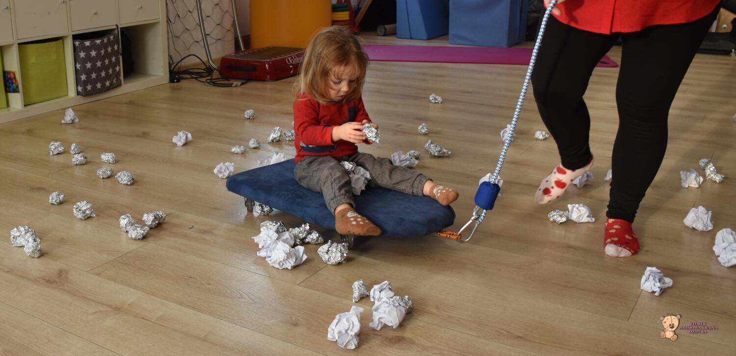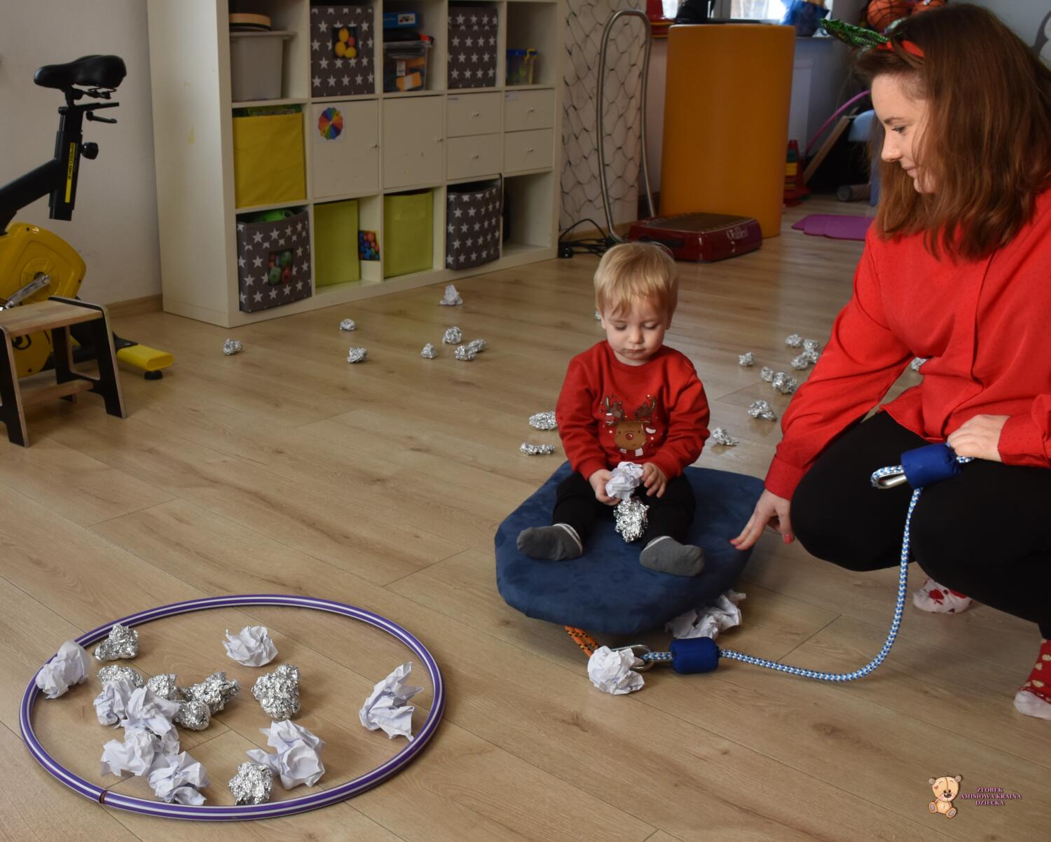 Dziś na zajęciach Integracji Sensorycznej Amisiaki poczuły zimowy klimat. Wspólnie ćwiczyliśmy rączki. Mocno ściskając papier i folię aluminiową robiliśmy kule śnieżne. Następnie jadąc na deskorolce zbieraliśmy jak najwięcej kul i wrzucaliśmy je w wyznaczone miejsce. Stymulowaliśmy układ przedsionkowy, koordynację wzrokowo ruchową oraz precyzję w działaniu. Amisiaki miały ogromną frajdę. Wspaniale!