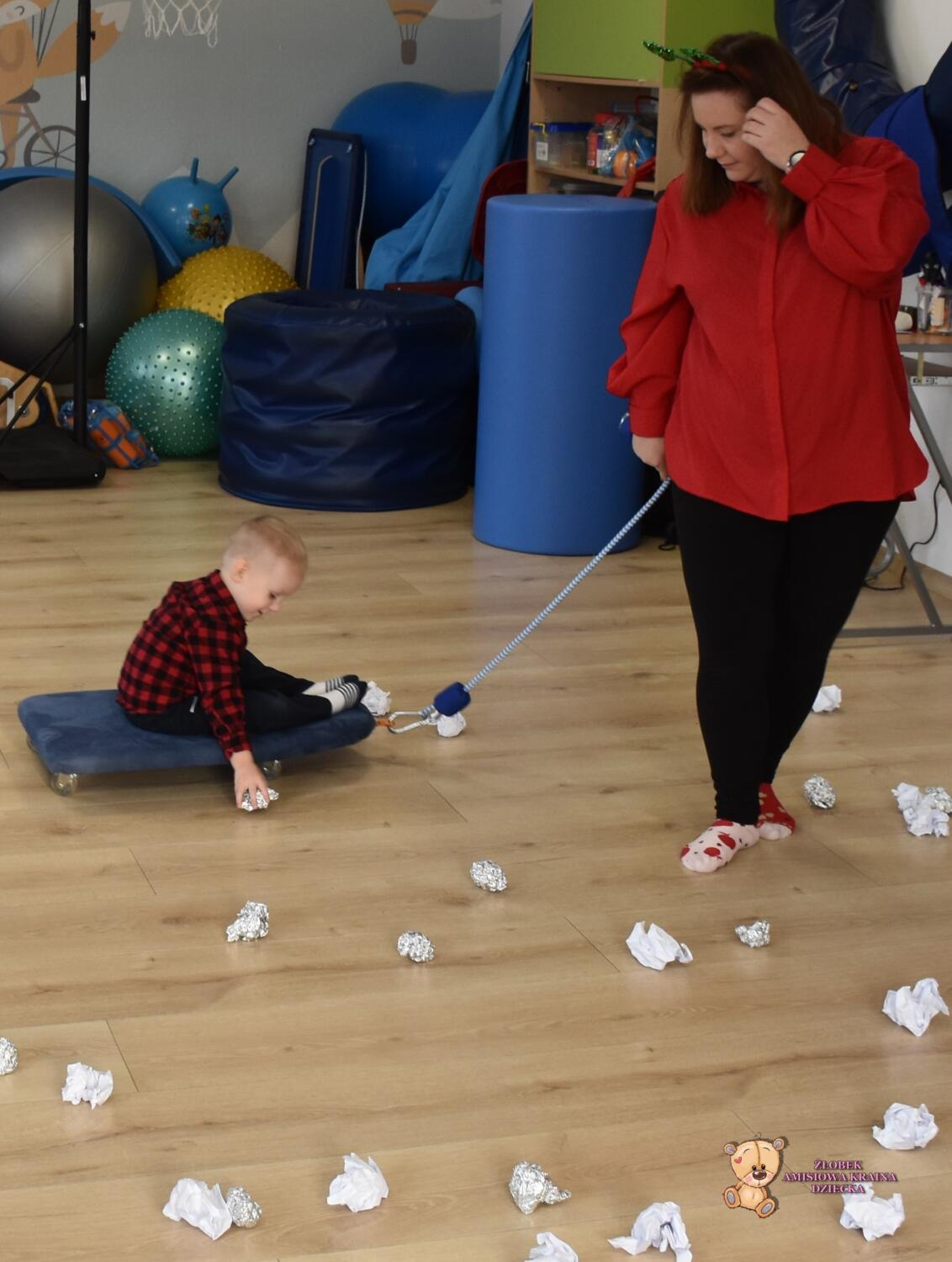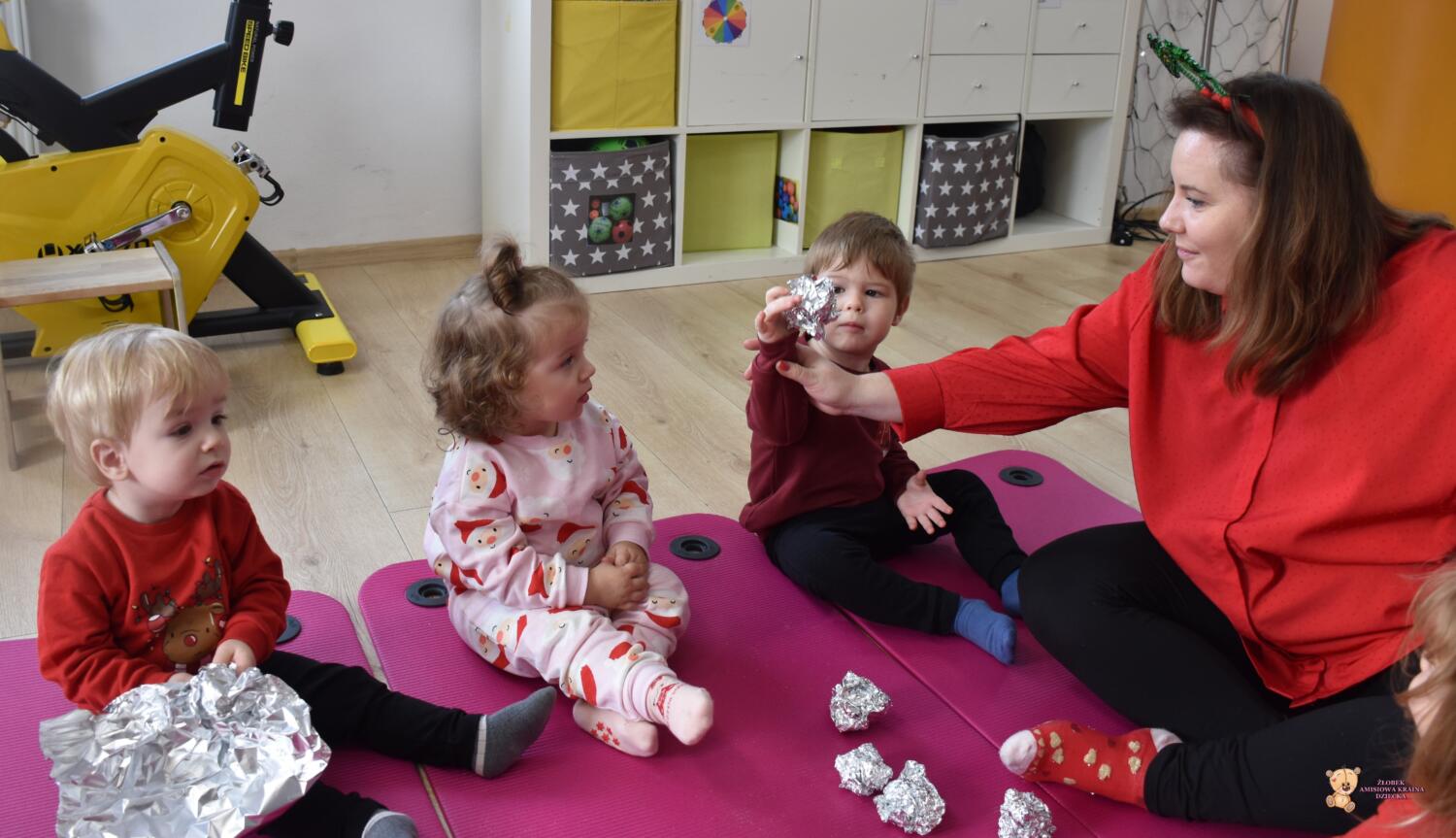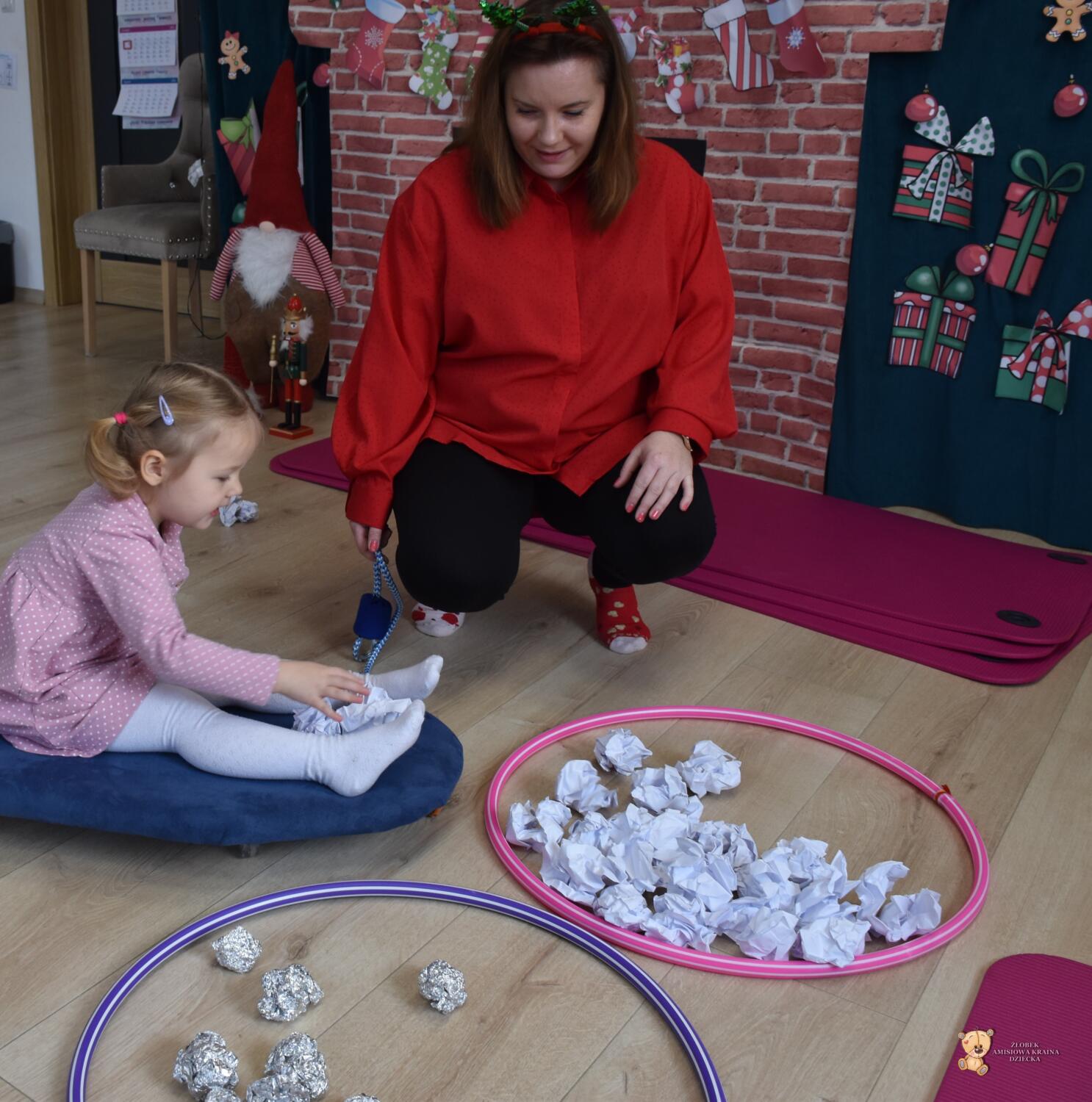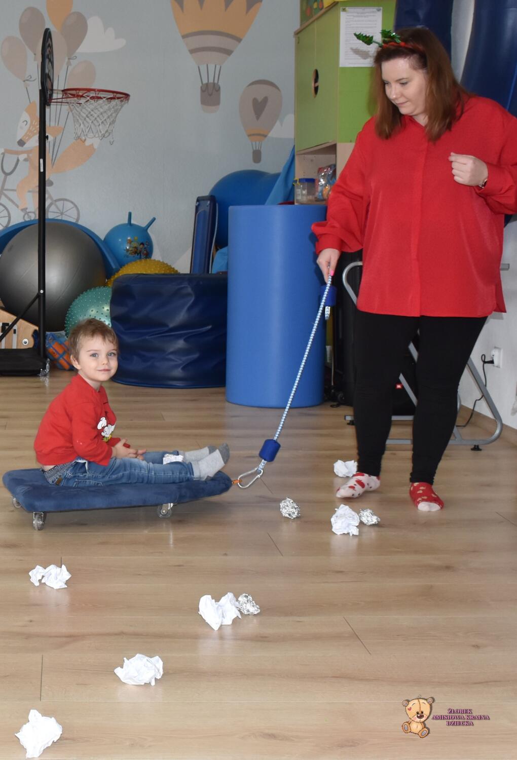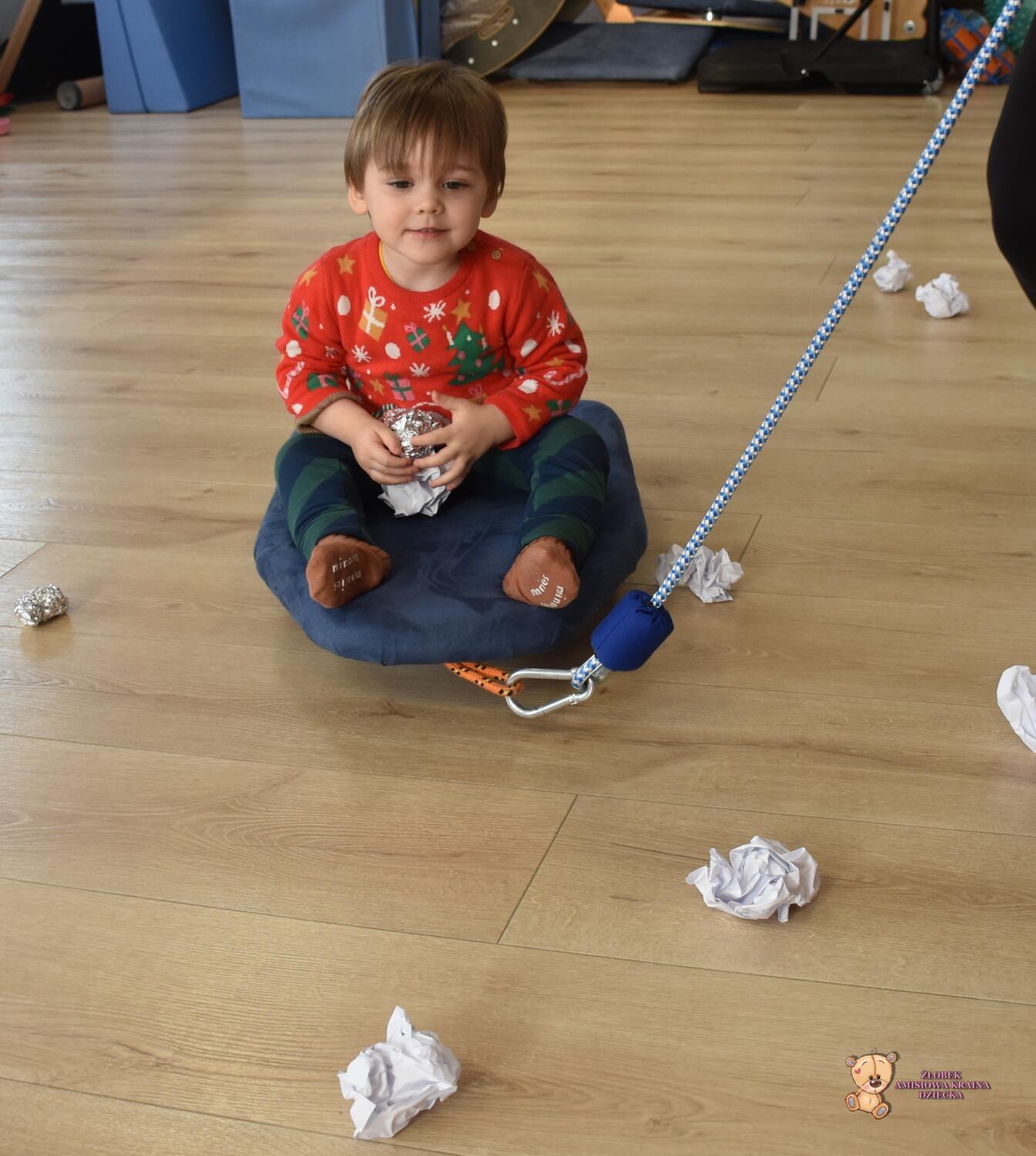Dziś na zajęciach Integracji Sensorycznej Amisiaki poczuły zimowy klimat. Wspólnie ćwiczyliśmy rączki. Mocno ściskając papier i folię aluminiową robiliśmy kule śnieżne. Następnie jadąc na deskorolce zbieraliśmy jak najwięcej kul i wrzucaliśmy je w wyznaczone miejsce. Stymulowaliśmy układ przedsionkowy, koordynację wzrokowo ruchową oraz precyzję w działaniu. Amisiaki miały ogromną frajdę. Wspaniale!
