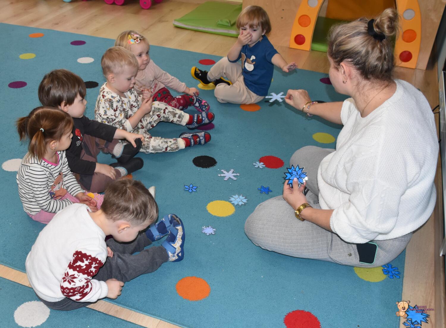 a następnie ciocia pokazała nam różne kształty płatków śniegu. Na koniec ćwiczyliśmy spostrzegawczość i odszukiwaliśmy takie same płatki śniegu