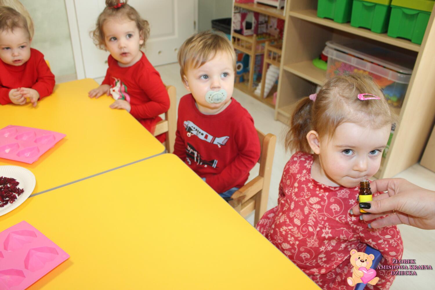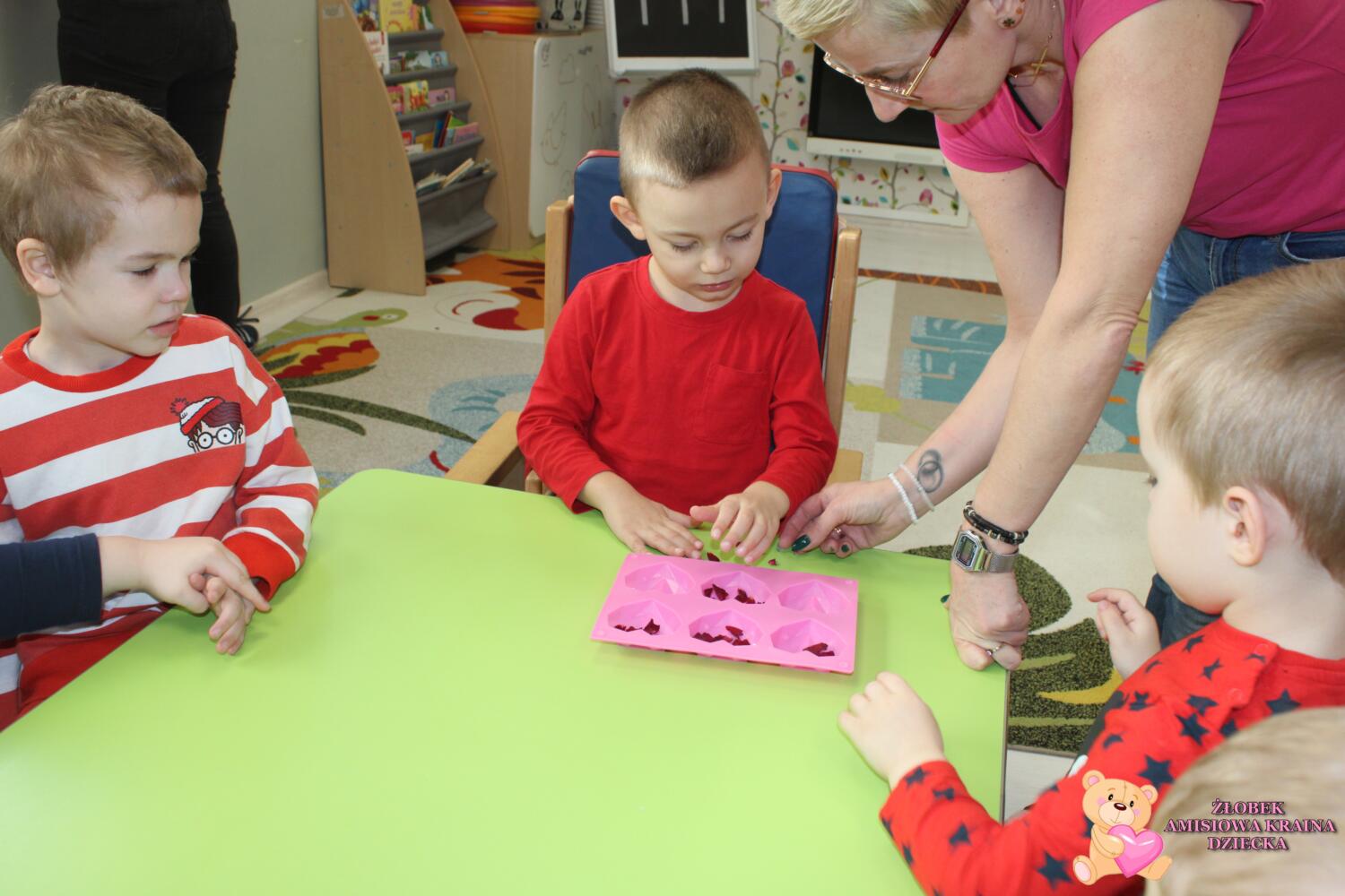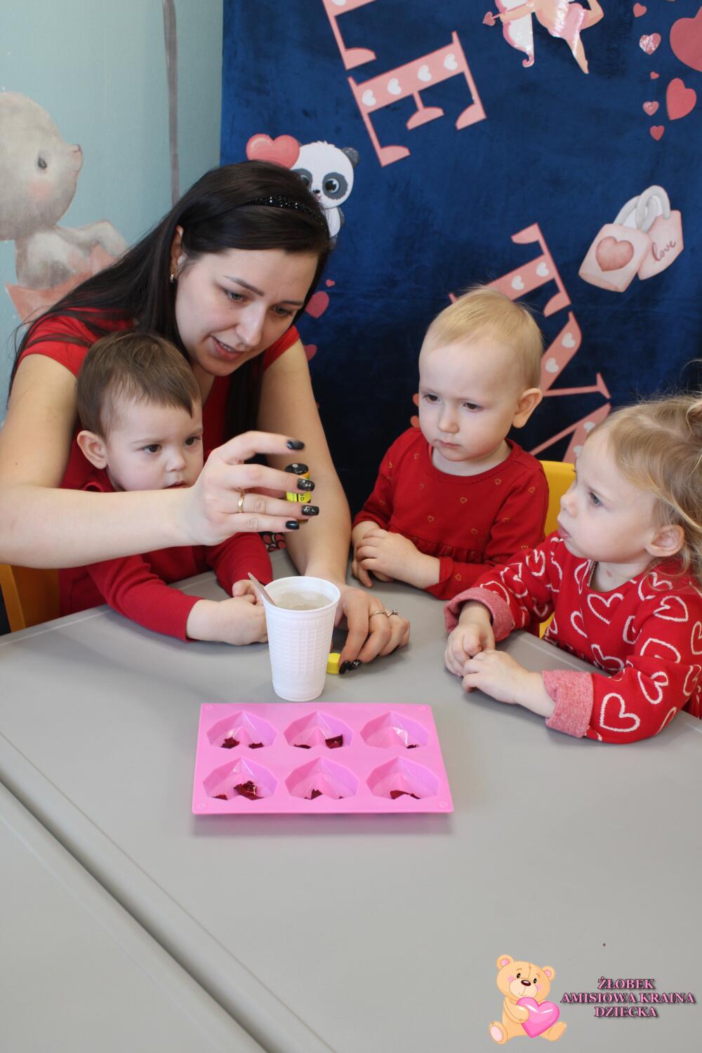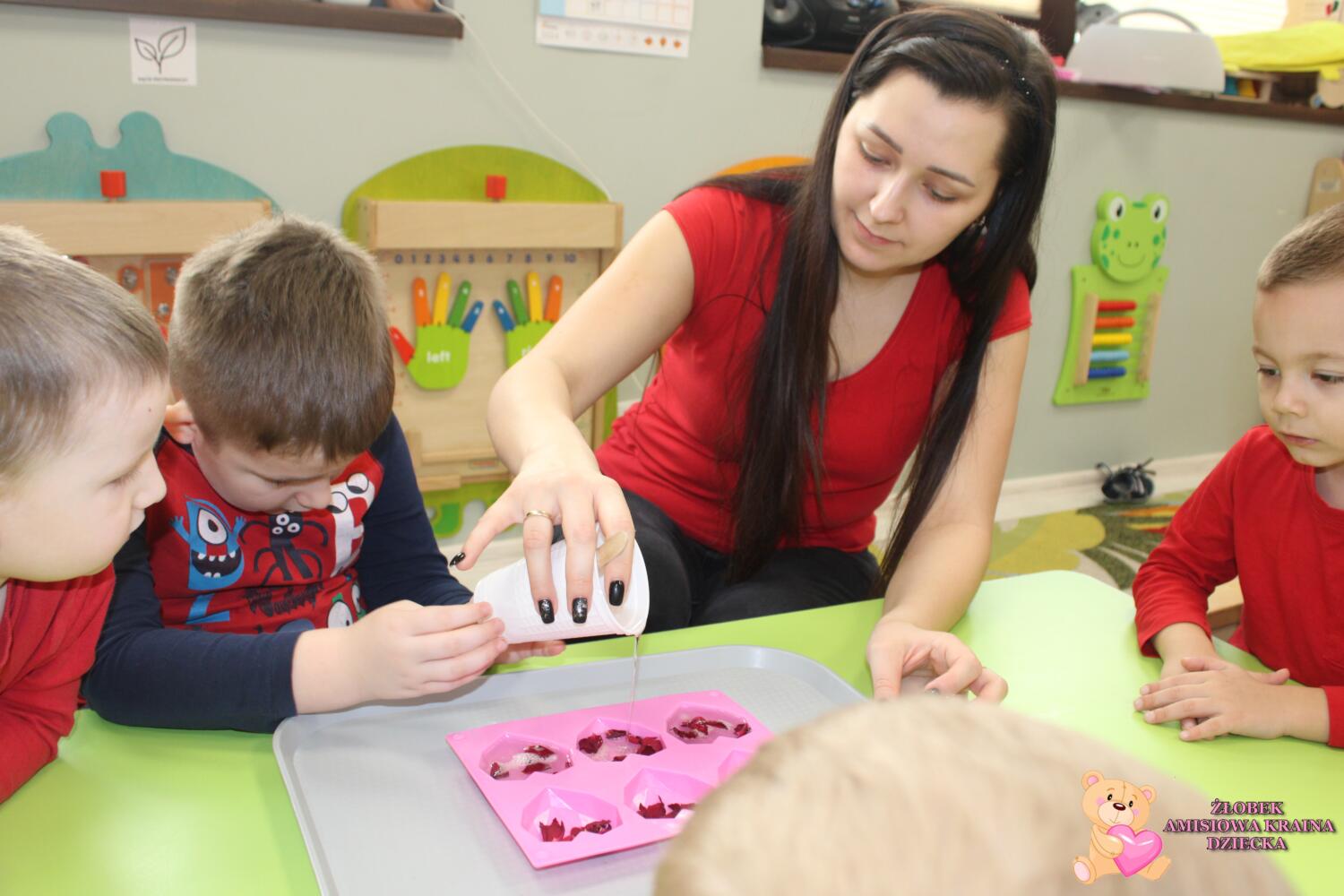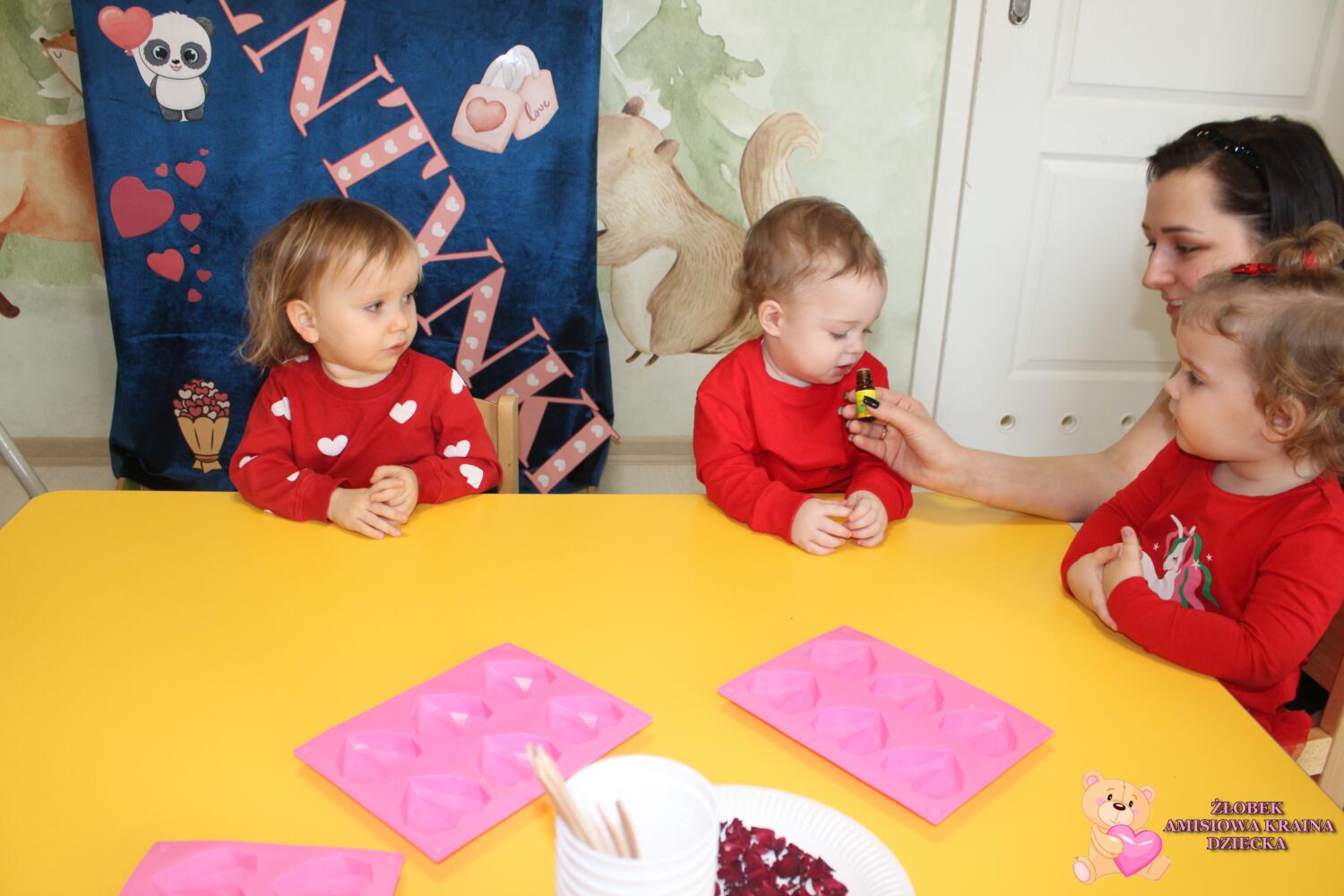Dzisiaj w AMIsiowej Krainie Dziecka obchodziliśmy Walentynki. Dzieci posłuchały opowieści o świętym Walentym, a następnie zabraliśmy się za robienie mydełek glicerynowych w kształcie serduszek. Wykorzystaliśmy do tego suszone płatki róży oraz aromat różany. Dzieci zmysłami węchu oraz dotyku mogły sprawdzić wszystkie składniki. Z pomocą cioci każdy wykonał dla siebie mydełko, które zabierze do domu.