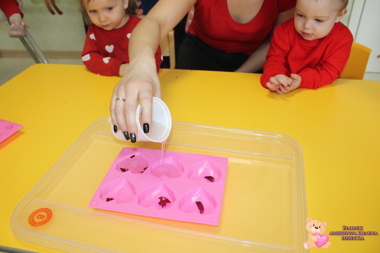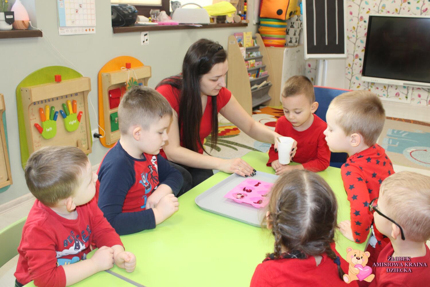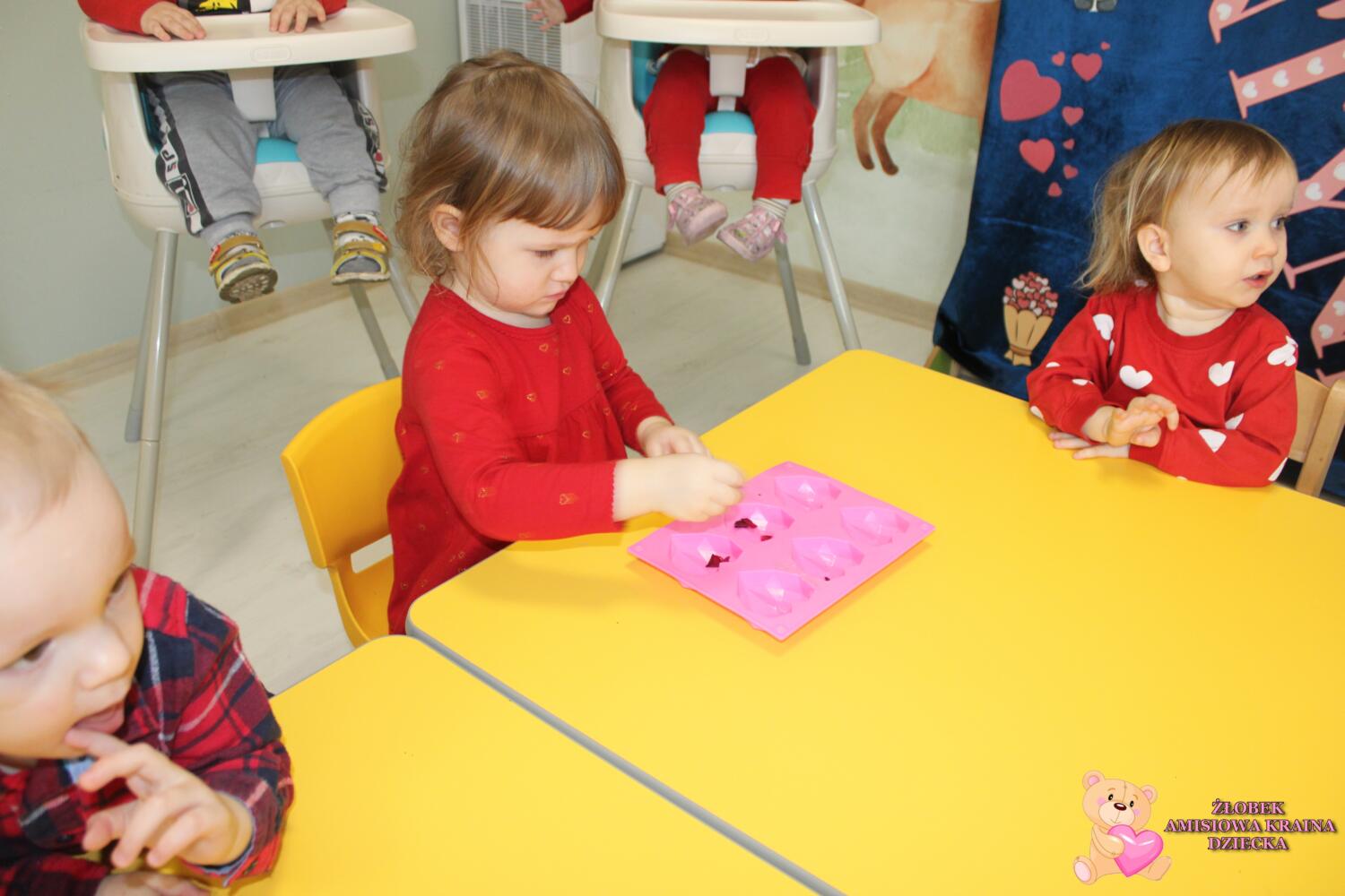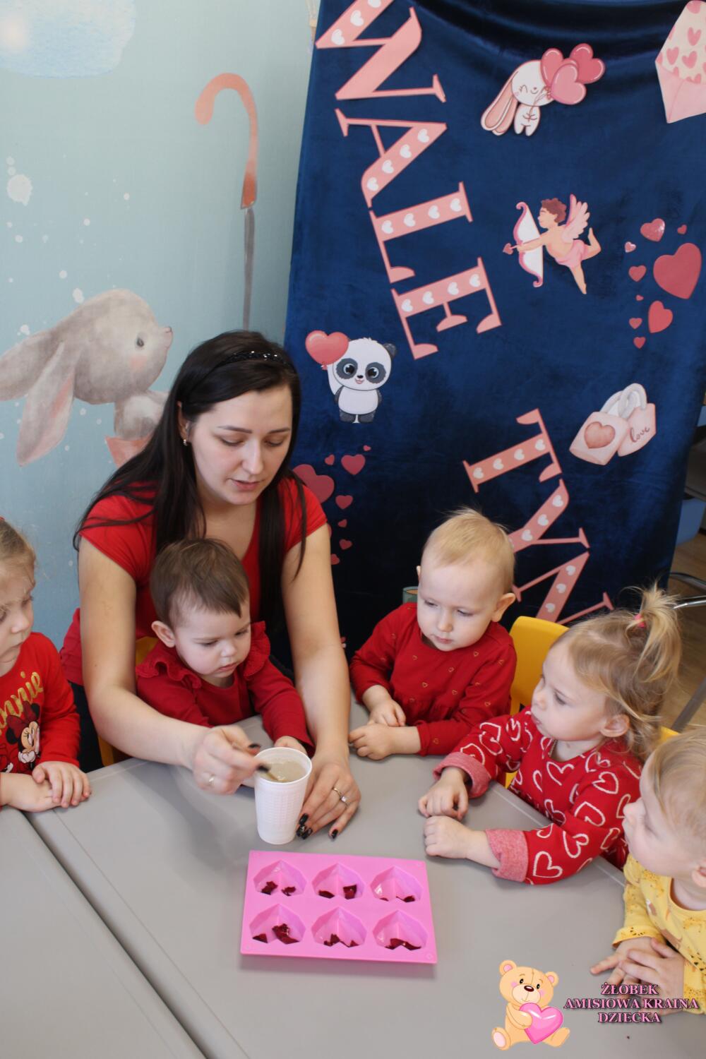 Dzisiaj w AMIsiowej Krainie Dziecka obchodziliśmy Walentynki. Dzieci posłuchały opowieści o świętym Walentym, a następnie zabraliśmy się za robienie mydełek glicerynowych w kształcie serduszek. Wykorzystaliśmy do tego suszone płatki róży oraz aromat różany. Dzieci zmysłami węchu oraz dotyku mogły sprawdzić wszystkie składniki. Z pomocą cioci każdy wykonał dla siebie mydełko, które zabierze do domu.