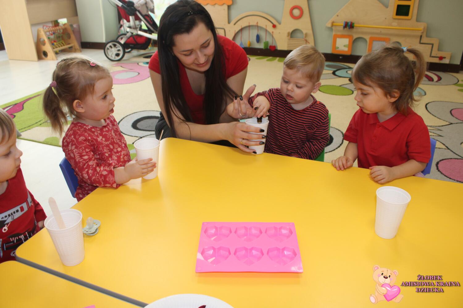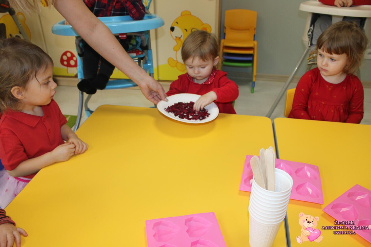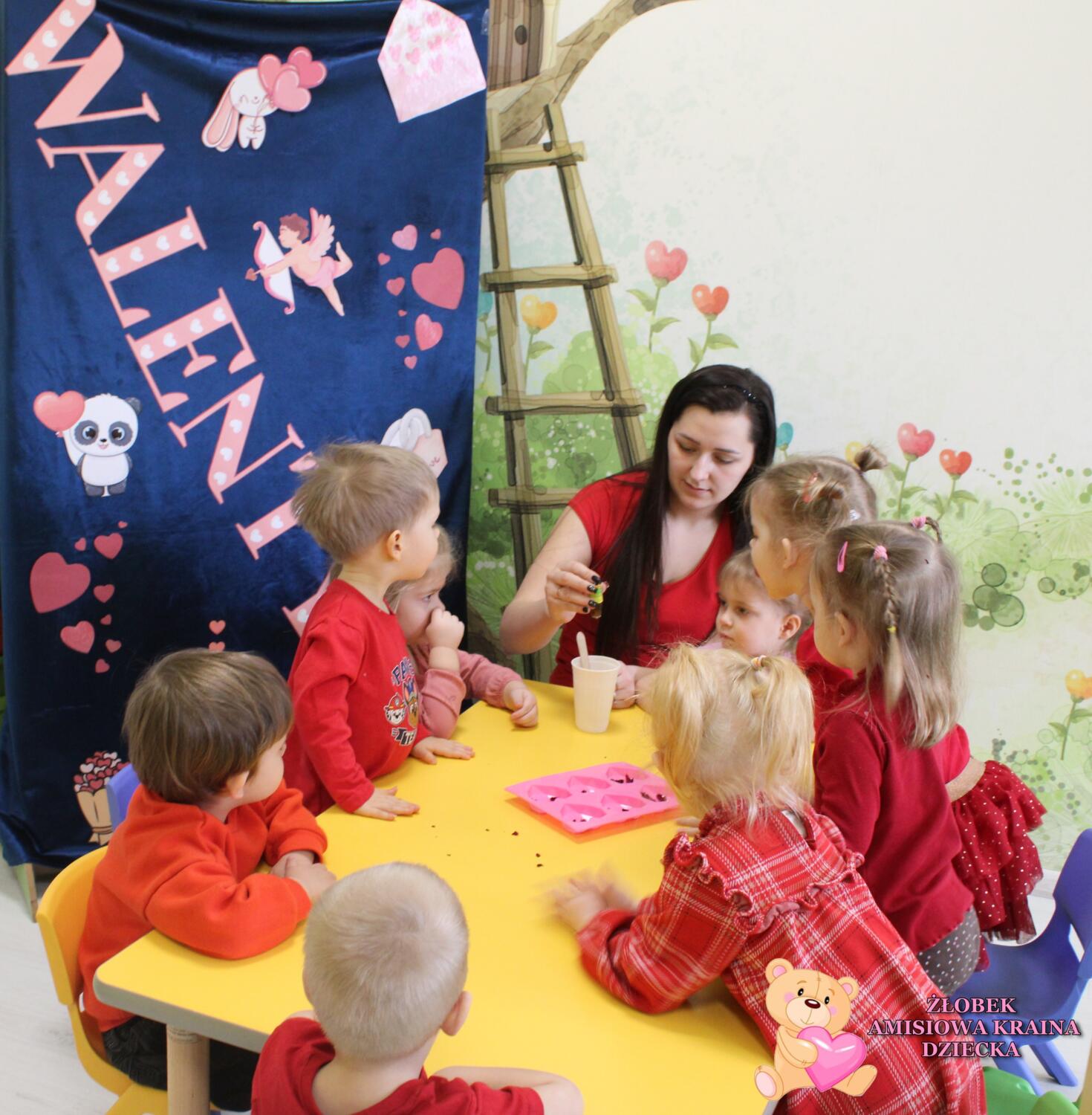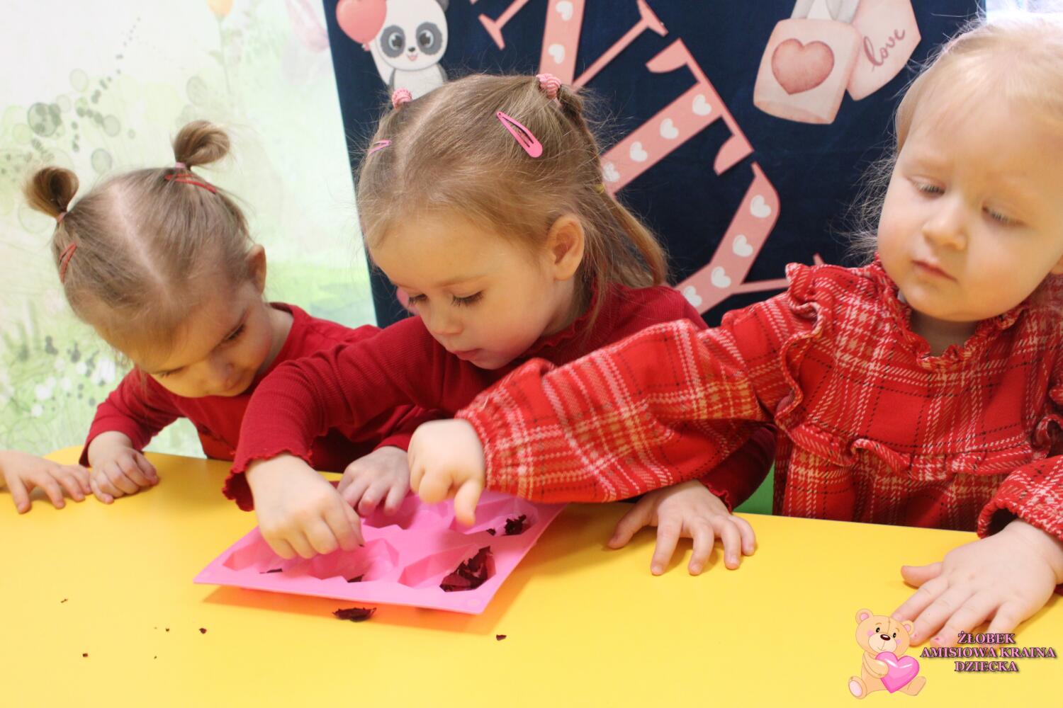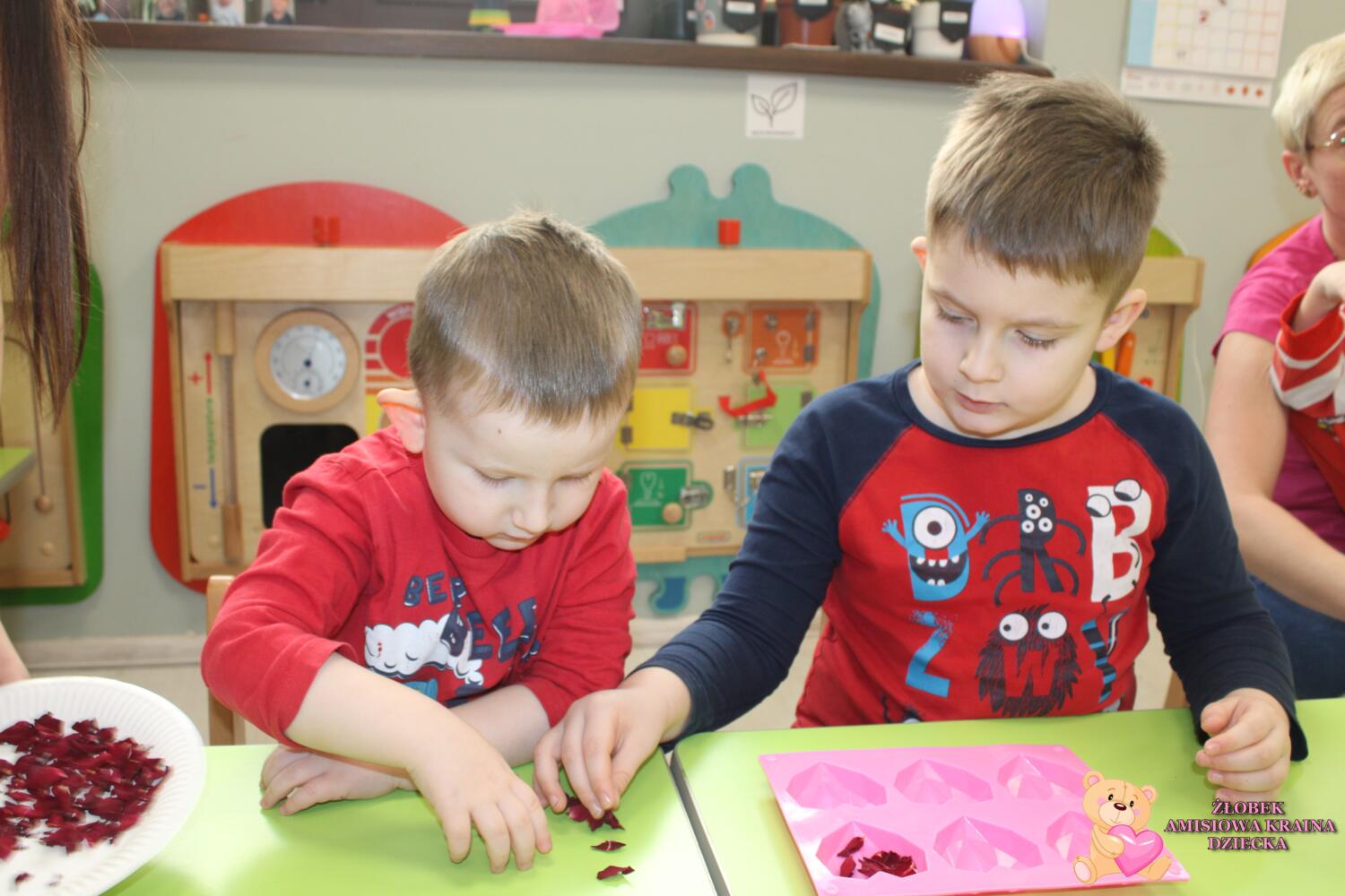 Dzisiaj w AMIsiowej Krainie Dziecka obchodziliśmy Walentynki. Dzieci posłuchały opowieści o świętym Walentym, a następnie zabraliśmy się za robienie mydełek glicerynowych w kształcie serduszek. Wykorzystaliśmy do tego suszone płatki róży oraz aromat różany. Dzieci zmysłami węchu oraz dotyku mogły sprawdzić wszystkie składniki. Z pomocą cioci każdy wykonał dla siebie mydełko, które zabierze do domu.