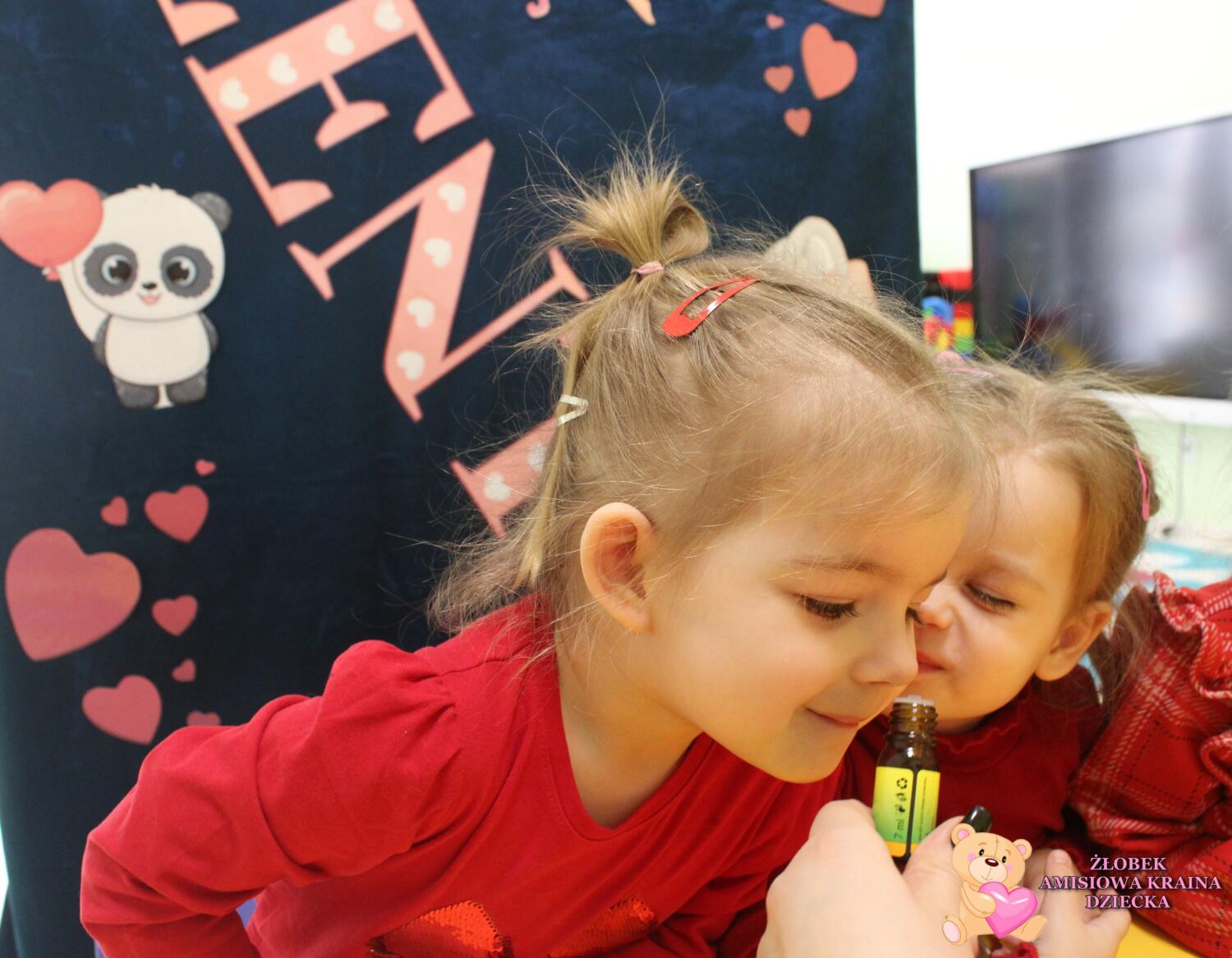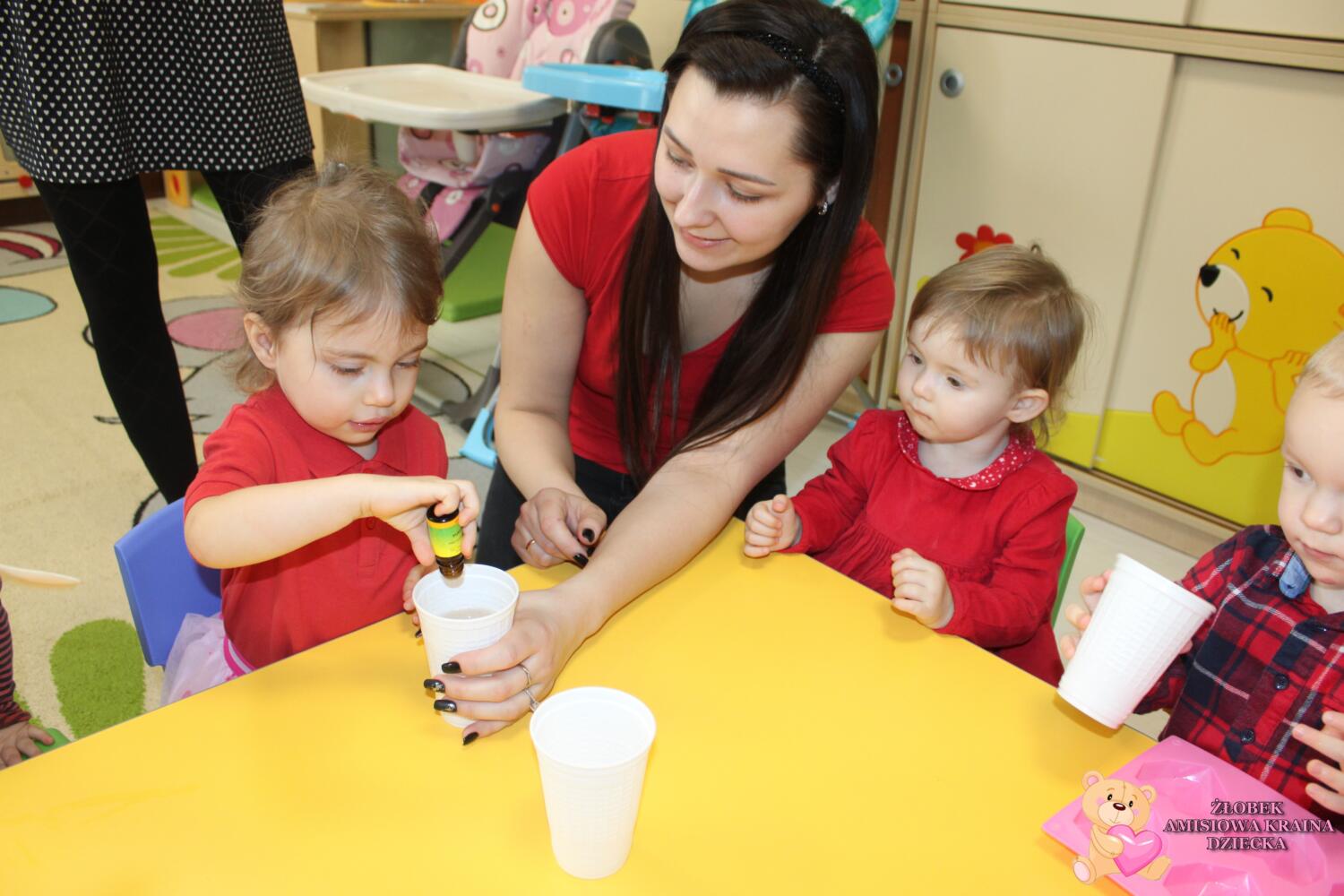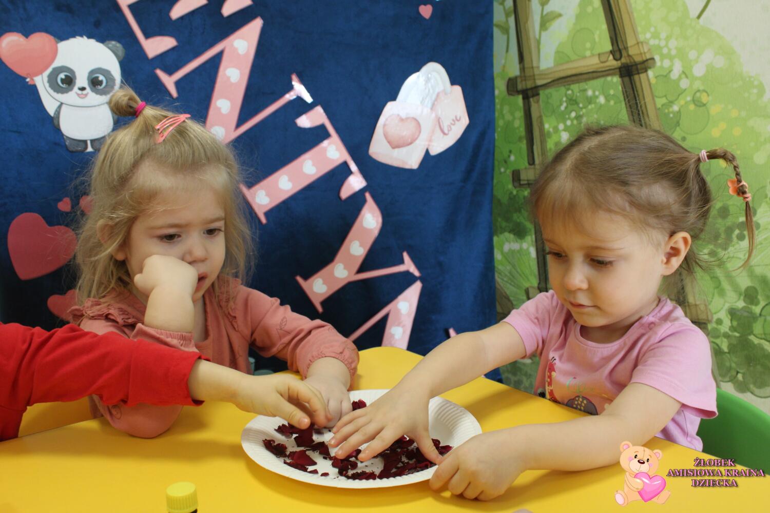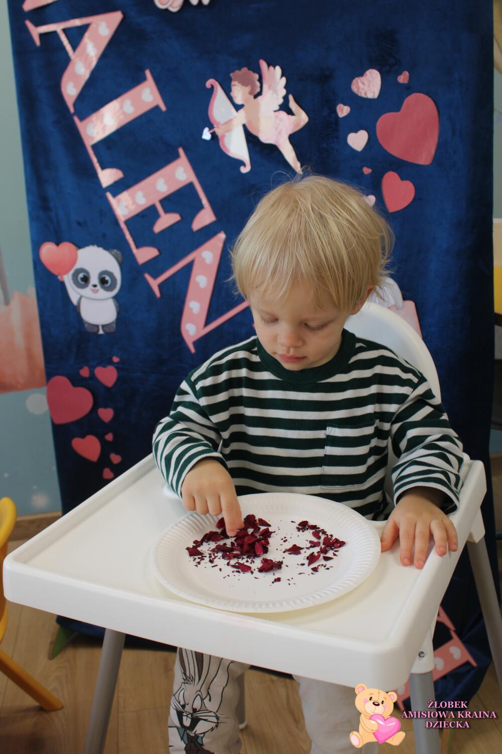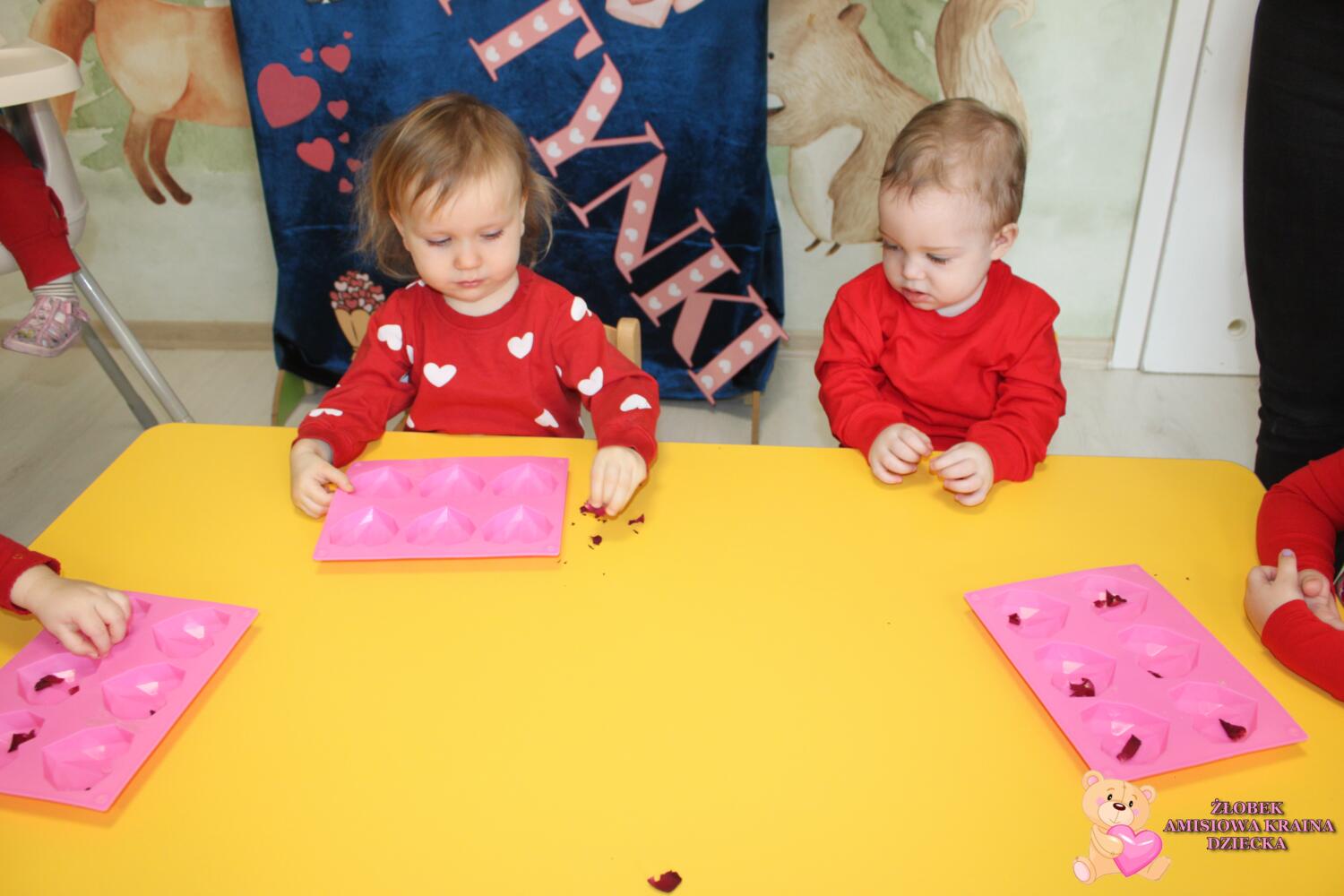 Dzisiaj w AMIsiowej Krainie Dziecka obchodziliśmy Walentynki. Dzieci posłuchały opowieści o świętym Walentym, a następnie zabraliśmy się za robienie mydełek glicerynowych w kształcie serduszek. Wykorzystaliśmy do tego suszone płatki róży oraz aromat różany. Dzieci zmysłami węchu oraz dotyku mogły sprawdzić wszystkie składniki. Z pomocą cioci każdy wykonał dla siebie mydełko, które zabierze do domu.