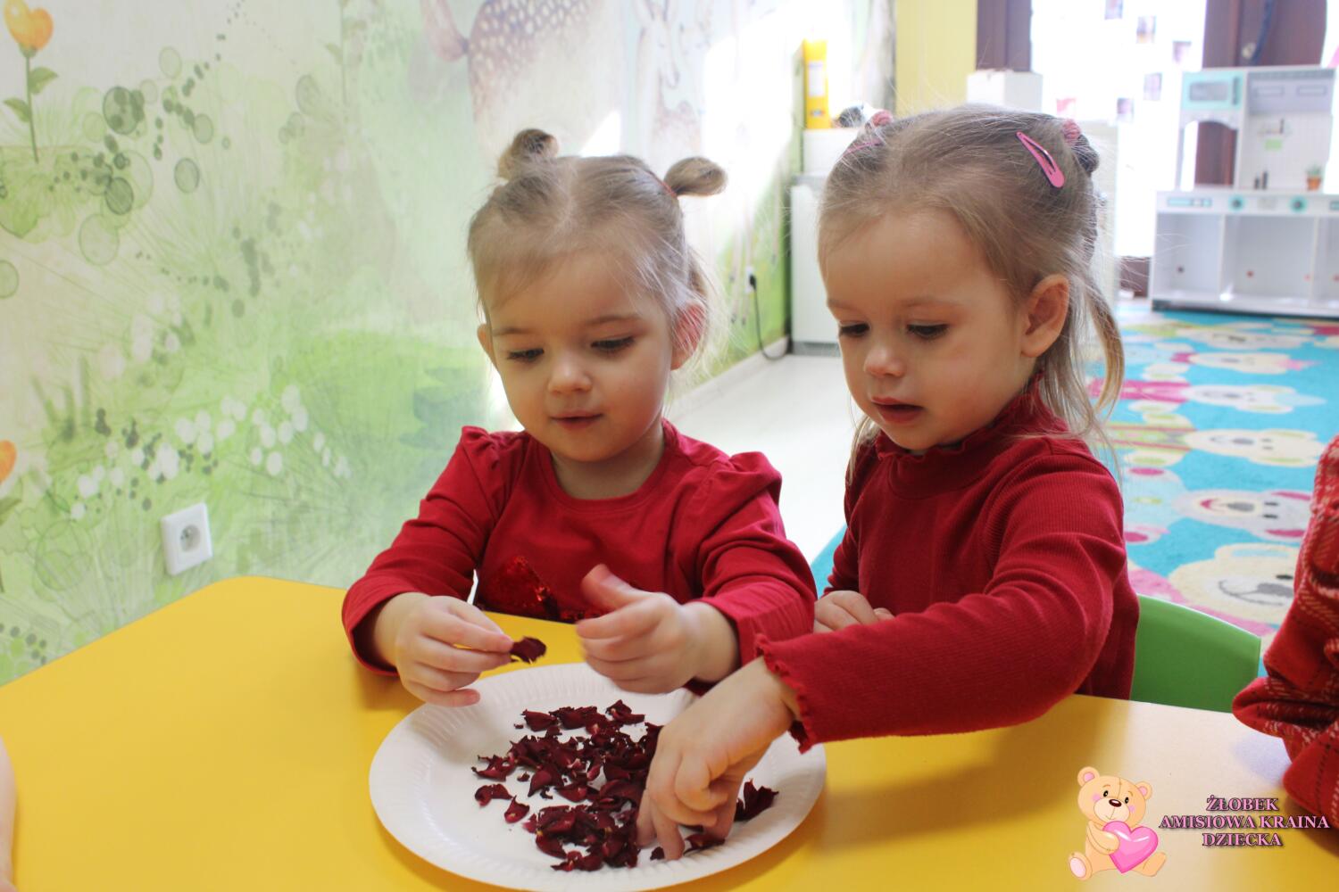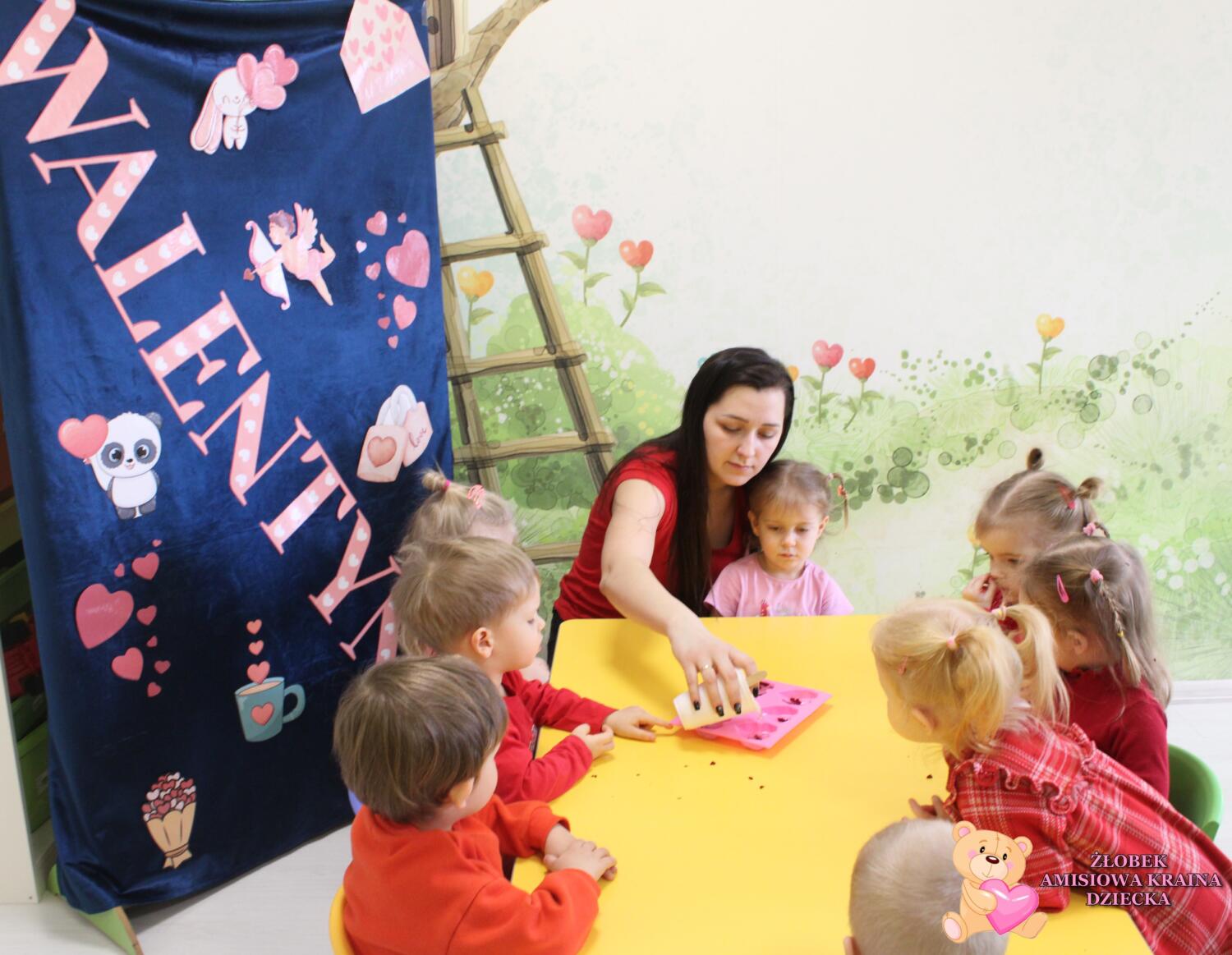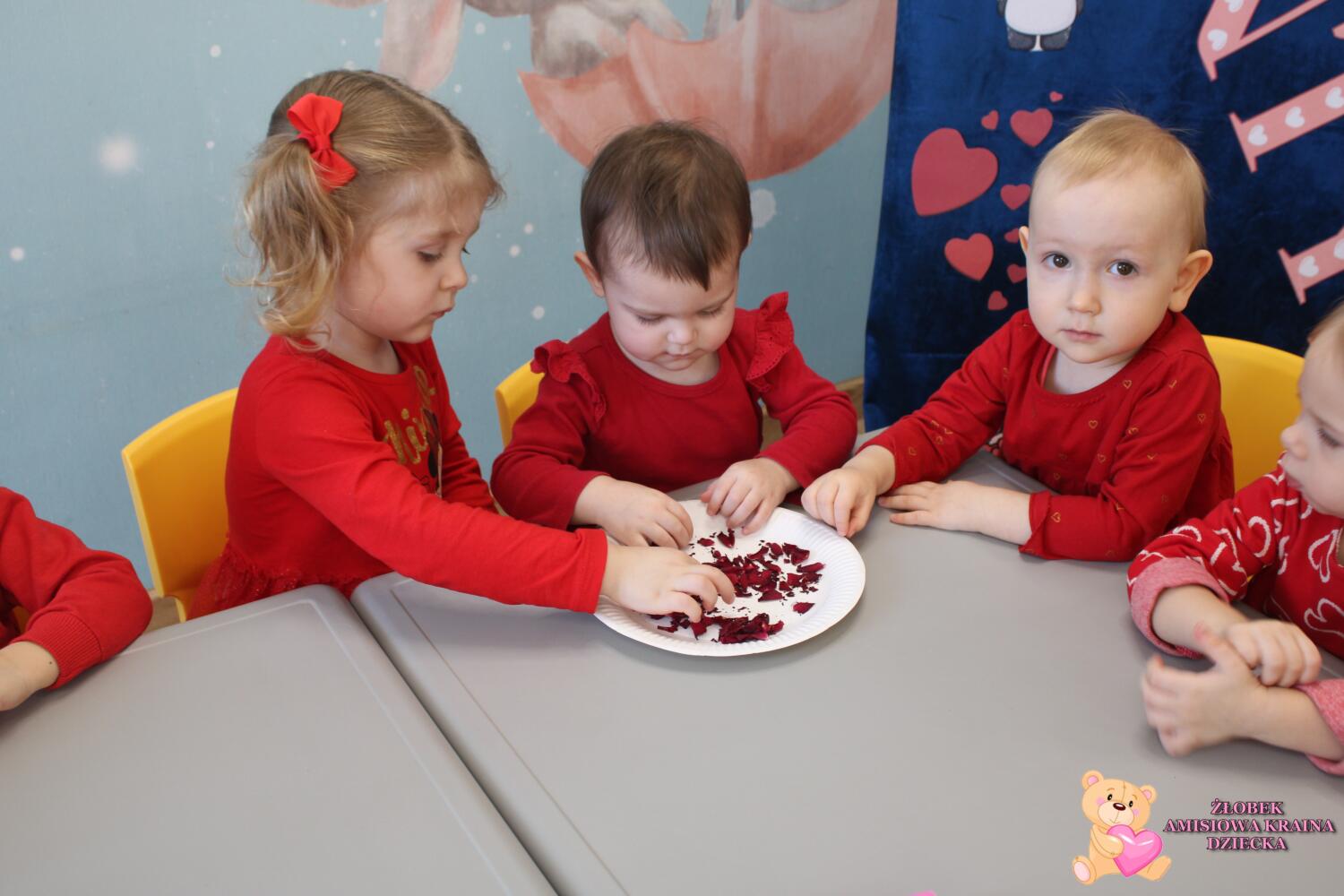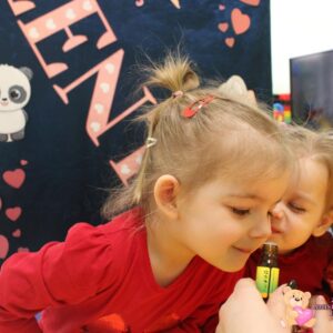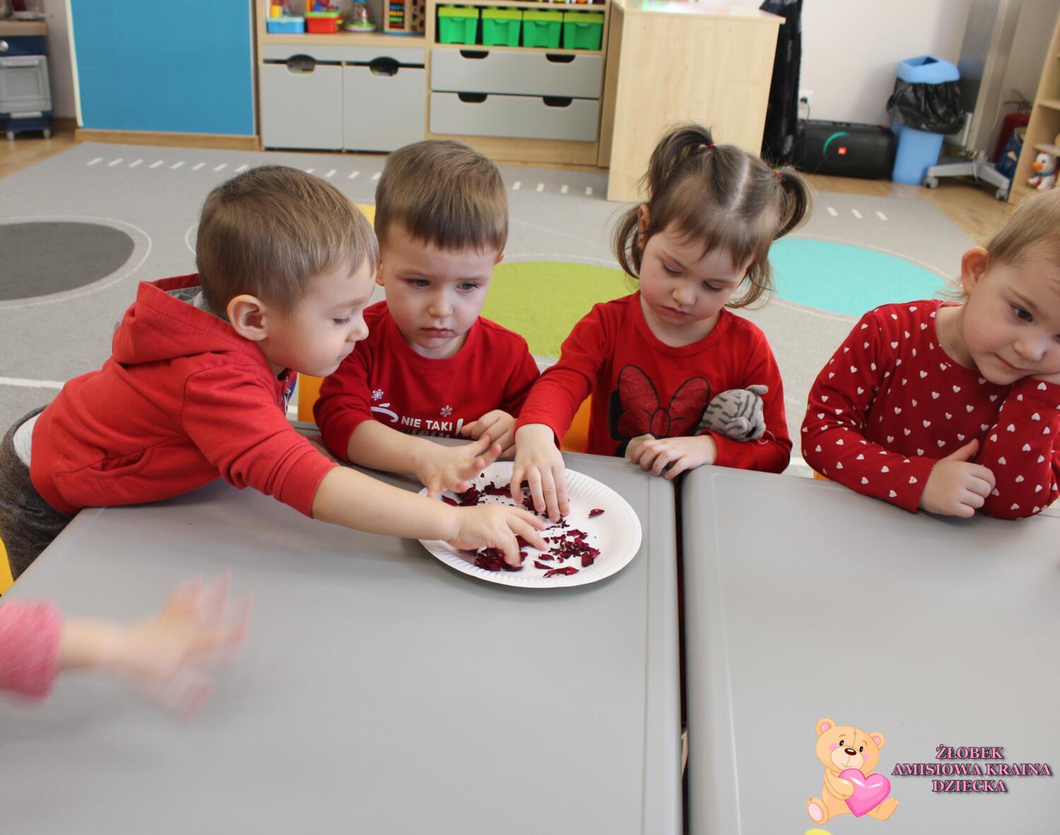 Dzisiaj w AMIsiowej Krainie Dziecka obchodziliśmy Walentynki. Dzieci posłuchały opowieści o świętym Walentym, a następnie zabraliśmy się za robienie mydełek glicerynowych w kształcie serduszek. Wykorzystaliśmy do tego suszone płatki róży oraz aromat różany. Dzieci zmysłami węchu oraz dotyku mogły sprawdzić wszystkie składniki. Z pomocą cioci każdy wykonał dla siebie mydełko, które zabierze do domu.