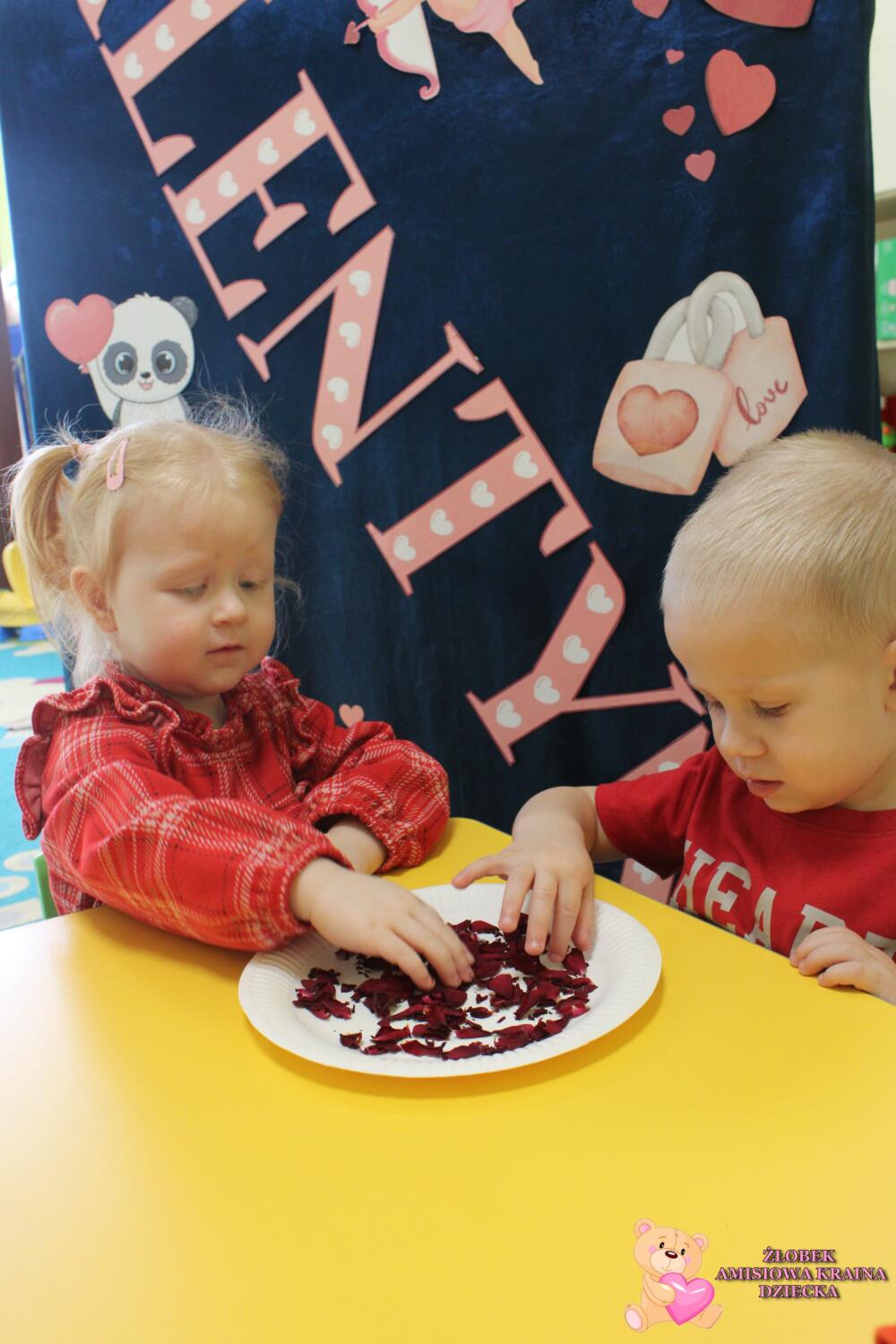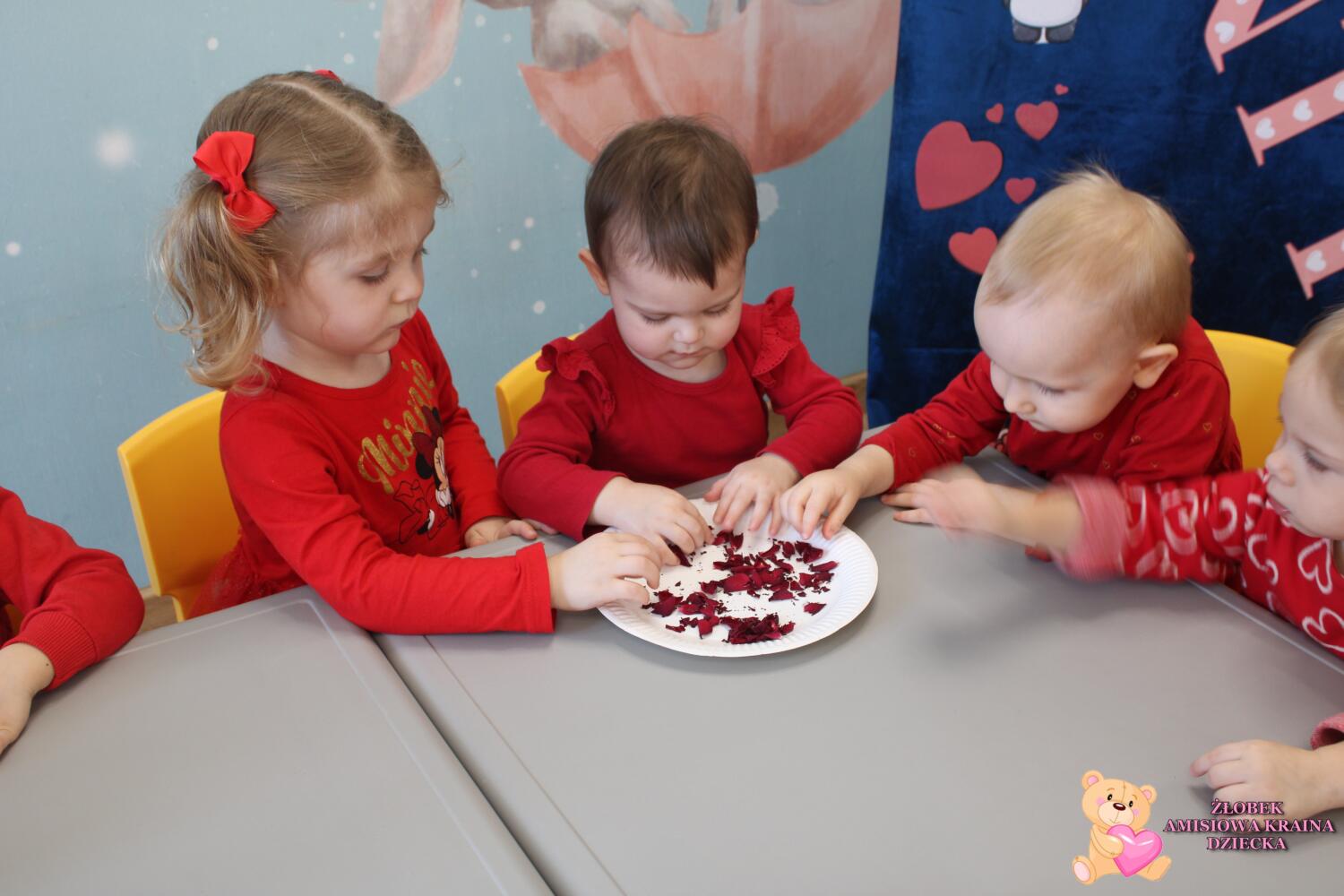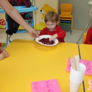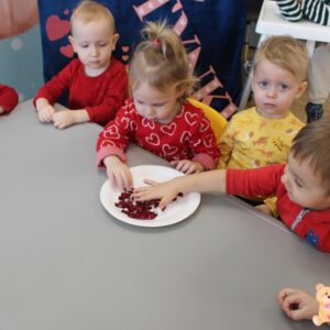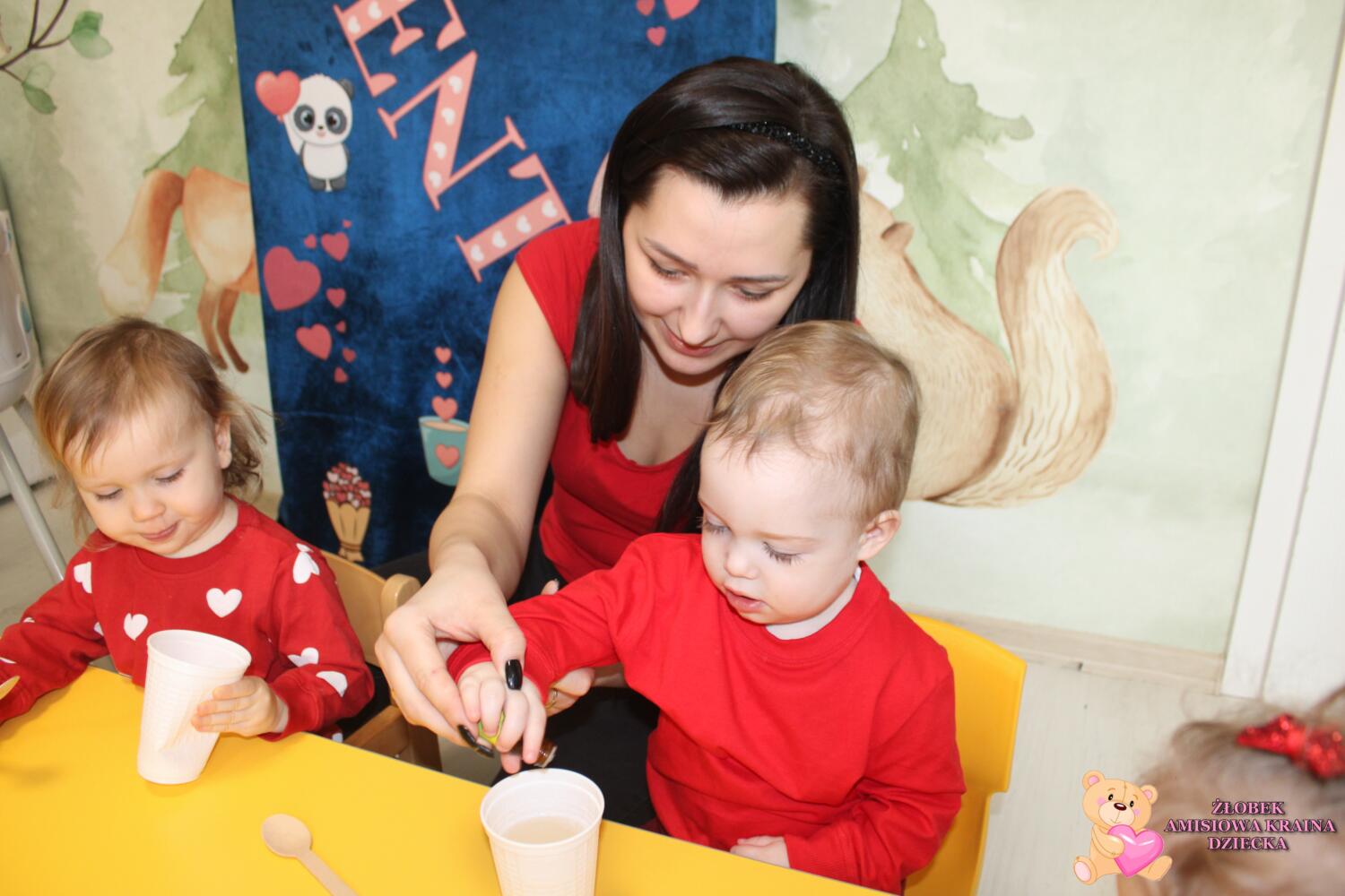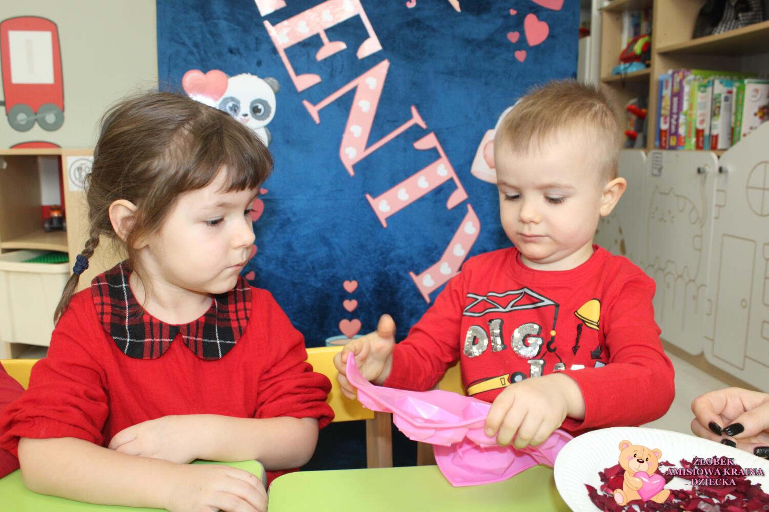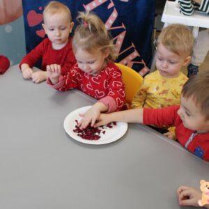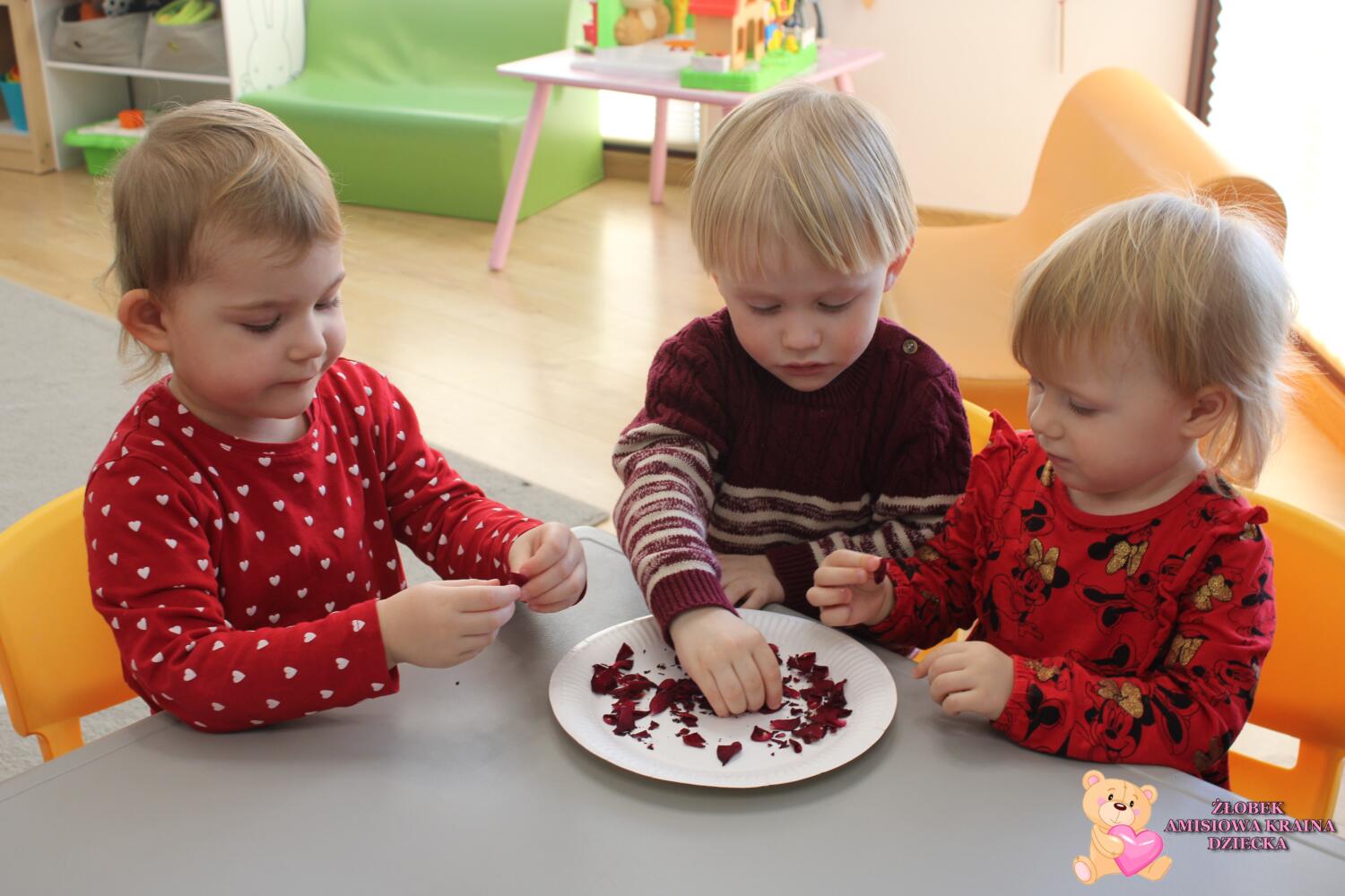 Dzisiaj w AMIsiowej Krainie Dziecka obchodziliśmy Walentynki. Dzieci posłuchały opowieści o świętym Walentym, a następnie zabraliśmy się za robienie mydełek glicerynowych w kształcie serduszek. Wykorzystaliśmy do tego suszone płatki róży oraz aromat różany. Dzieci zmysłami węchu oraz dotyku mogły sprawdzić wszystkie składniki. Z pomocą cioci każdy wykonał dla siebie mydełko, które zabierze do domu.