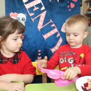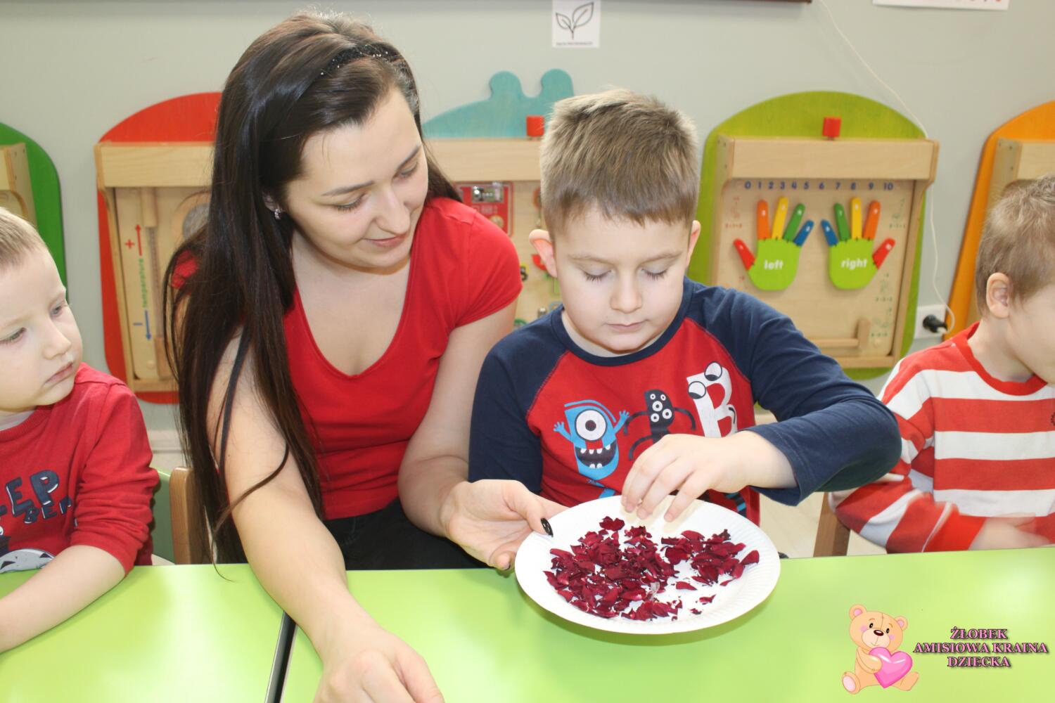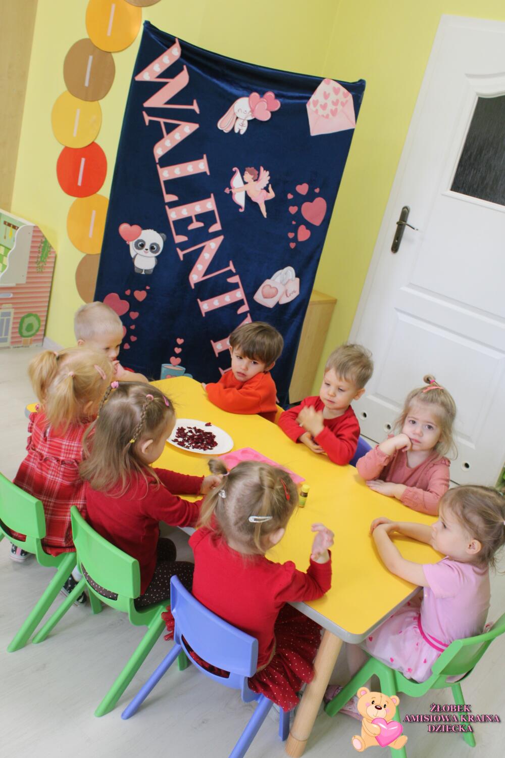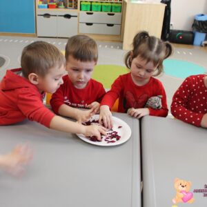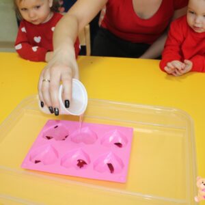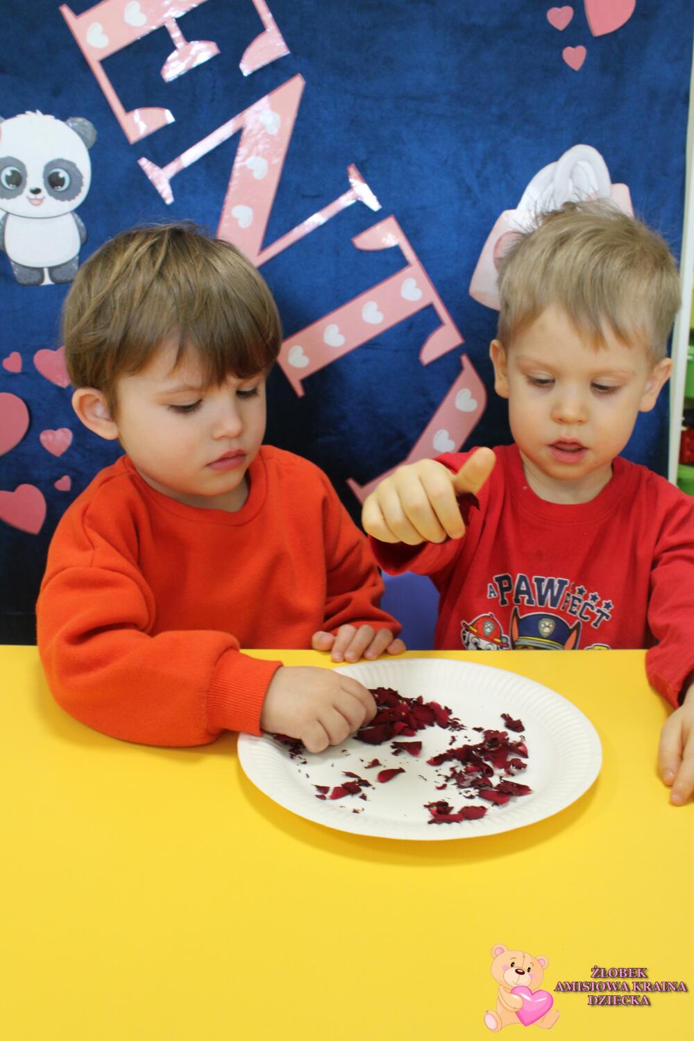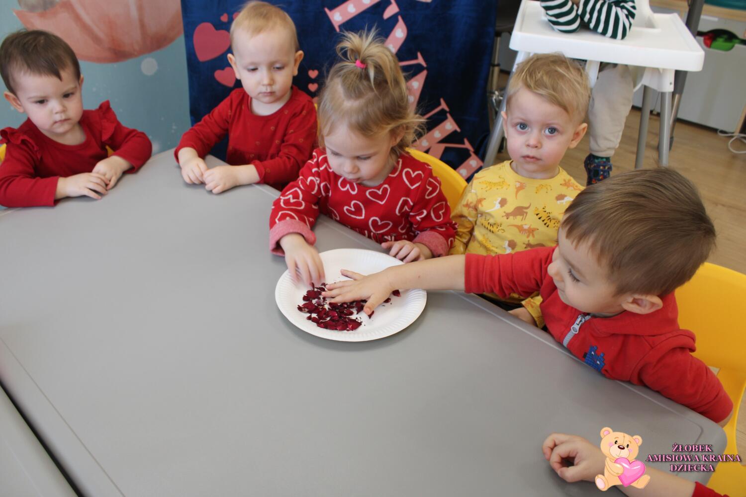 Dzisiaj w AMIsiowej Krainie Dziecka obchodziliśmy Walentynki. Dzieci posłuchały opowieści o świętym Walentym, a następnie zabraliśmy się za robienie mydełek glicerynowych w kształcie serduszek. Wykorzystaliśmy do tego suszone płatki róży oraz aromat różany. Dzieci zmysłami węchu oraz dotyku mogły sprawdzić wszystkie składniki. Z pomocą cioci każdy wykonał dla siebie mydełko, które zabierze do domu.