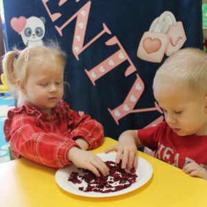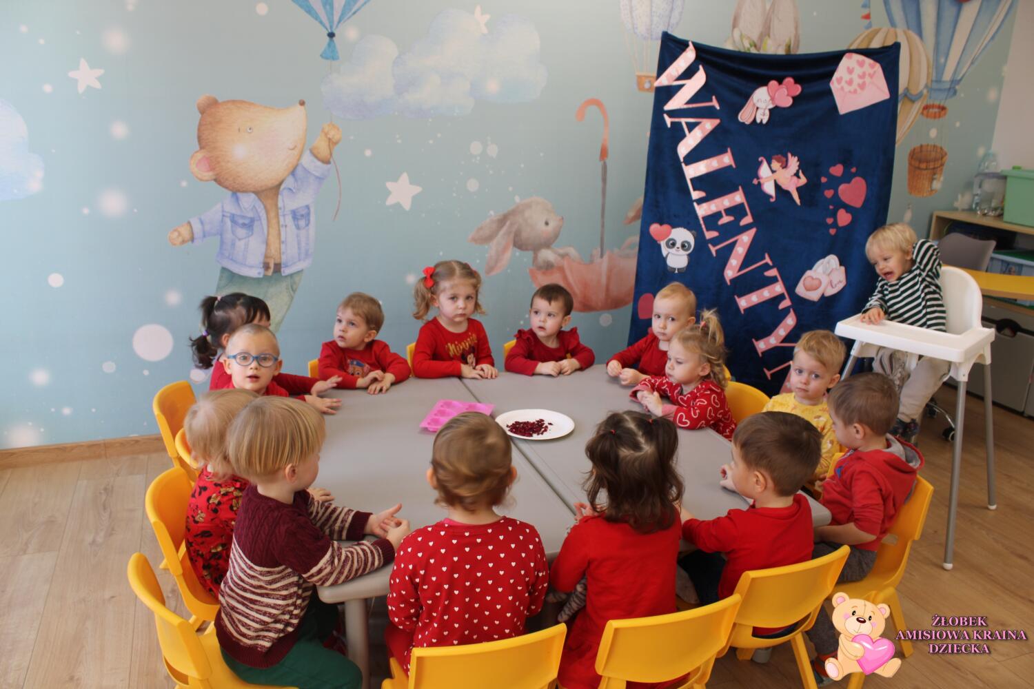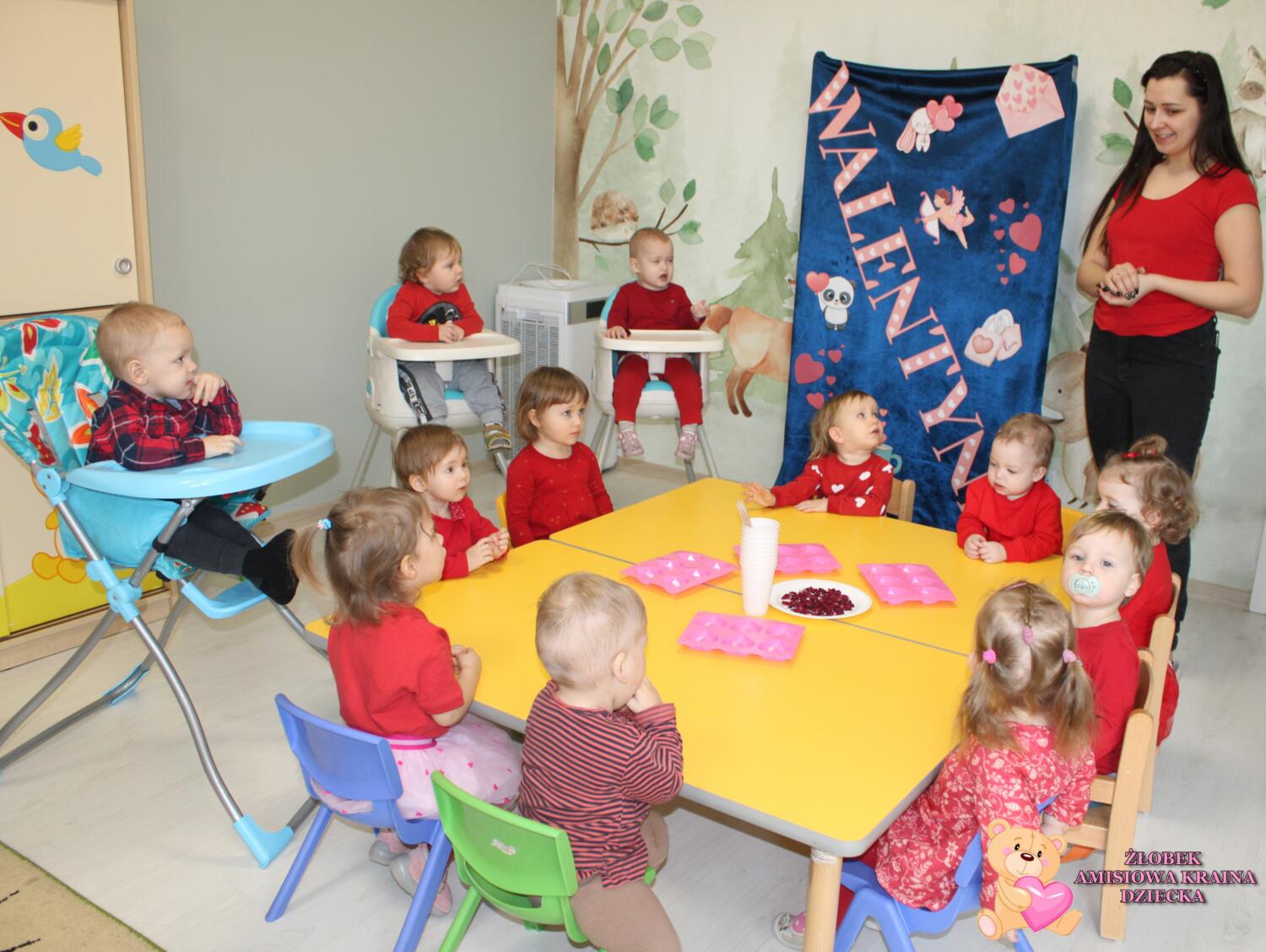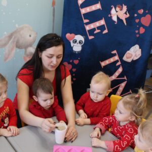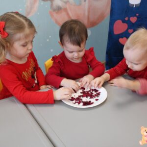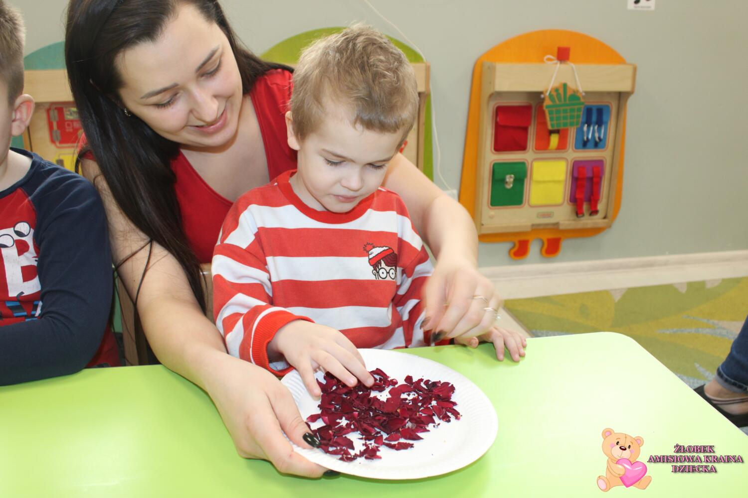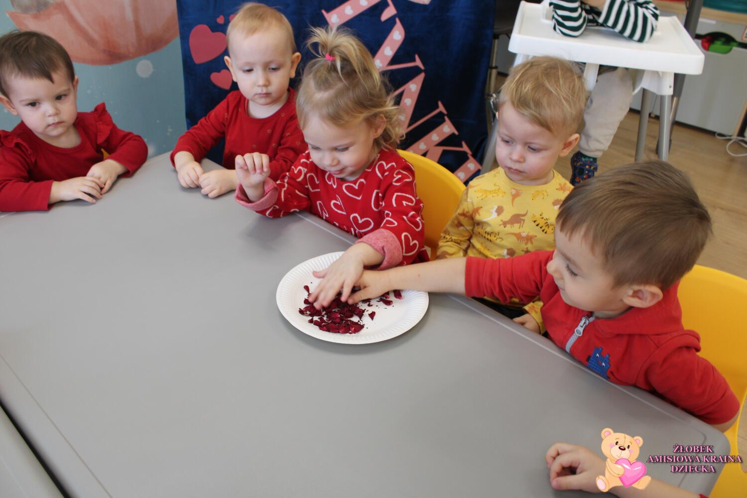 Dzisiaj w AMIsiowej Krainie Dziecka obchodziliśmy Walentynki. Dzieci posłuchały opowieści o świętym Walentym, a następnie zabraliśmy się za robienie mydełek glicerynowych w kształcie serduszek. Wykorzystaliśmy do tego suszone płatki róży oraz aromat różany. Dzieci zmysłami węchu oraz dotyku mogły sprawdzić wszystkie składniki. Z pomocą cioci każdy wykonał dla siebie mydełko, które zabierze do domu.