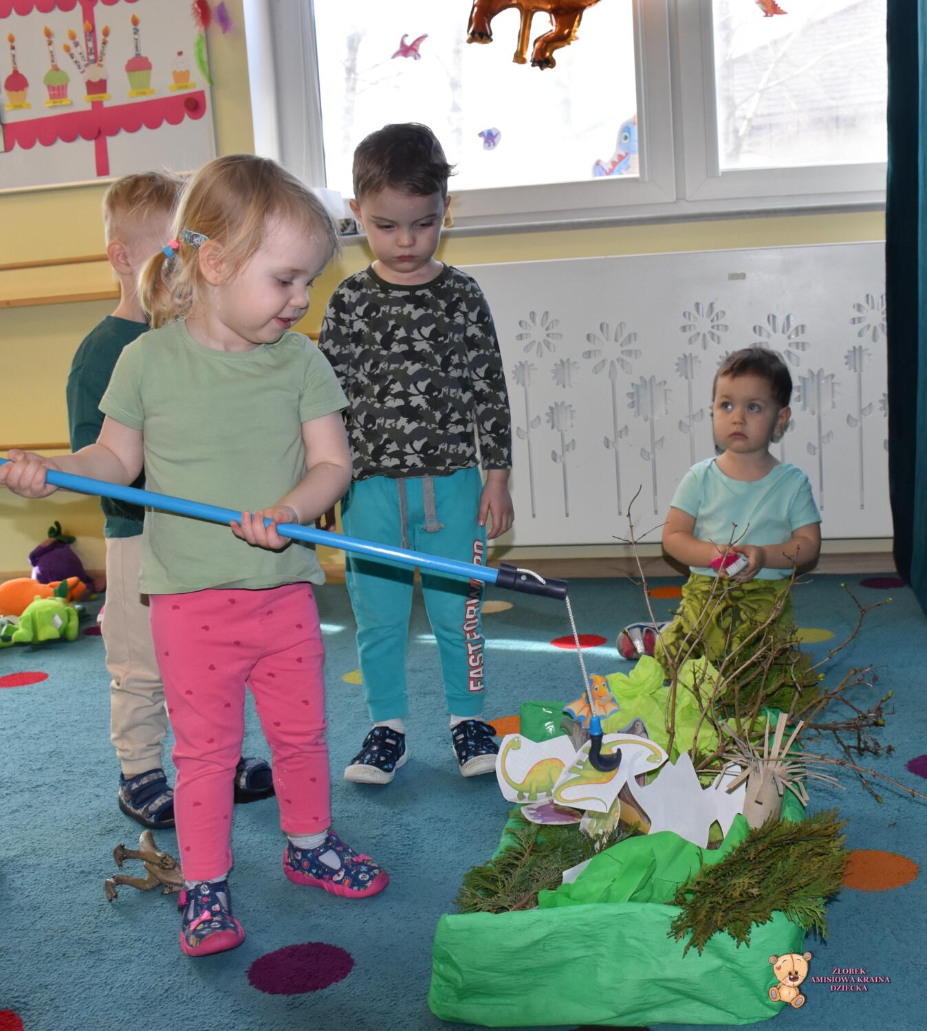 W naszym żłobku zamieszkały dinozaury a przestrzeń stała się dżunglą z różnymi bodźcami sensorycznymi. Dzieci słuchały odgłosów dżungli, w powietrzu rozchodził się zapach lasu