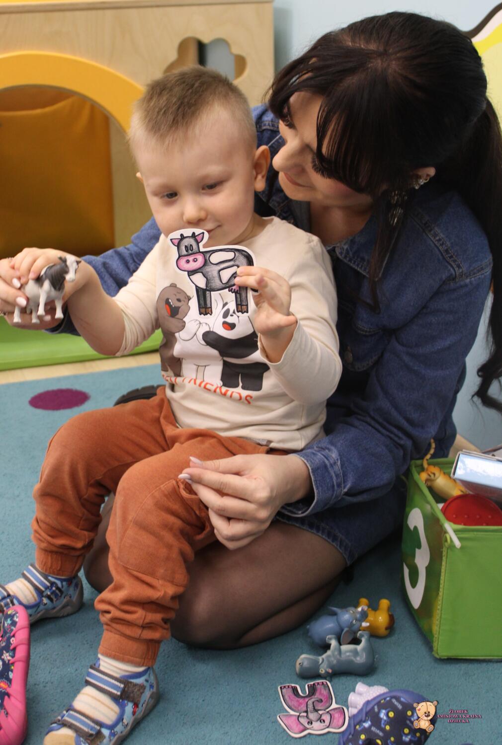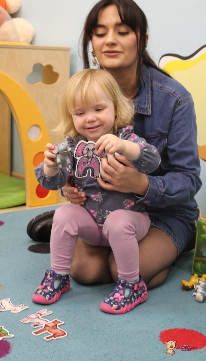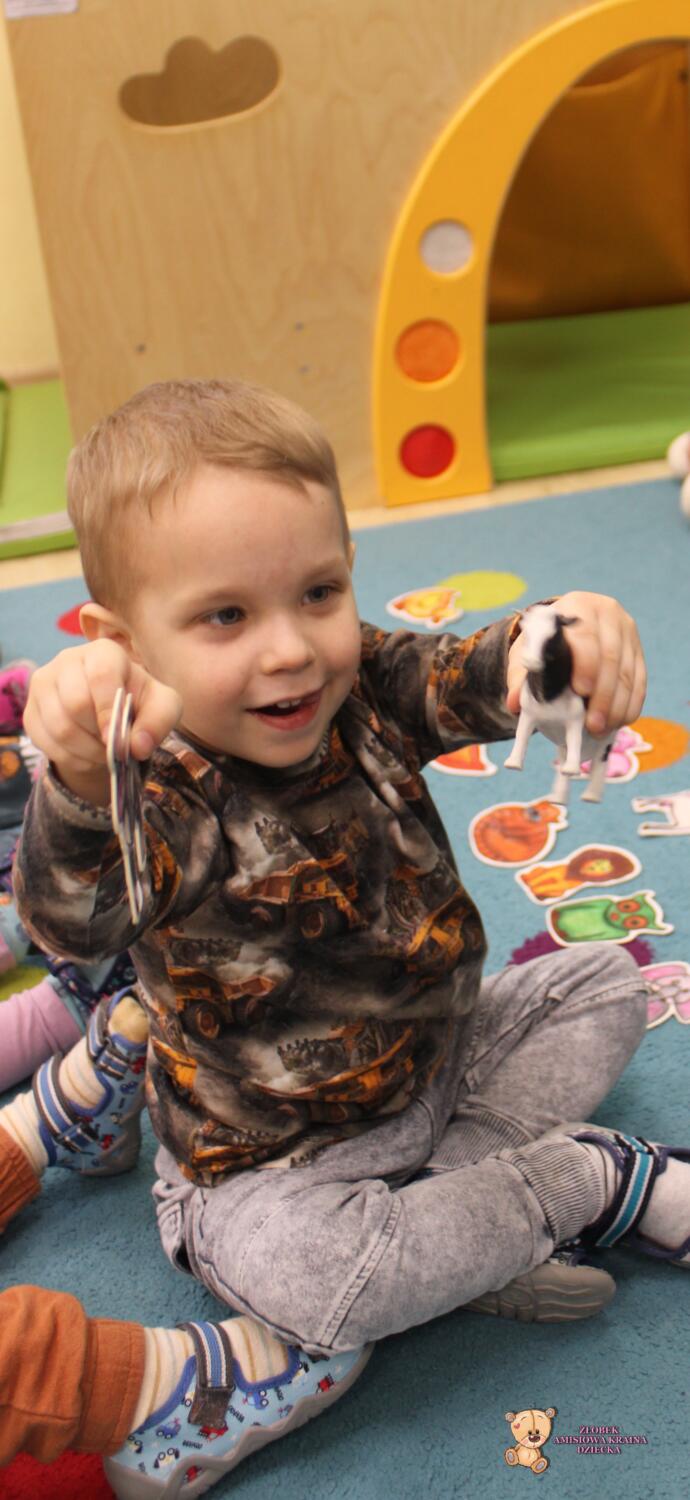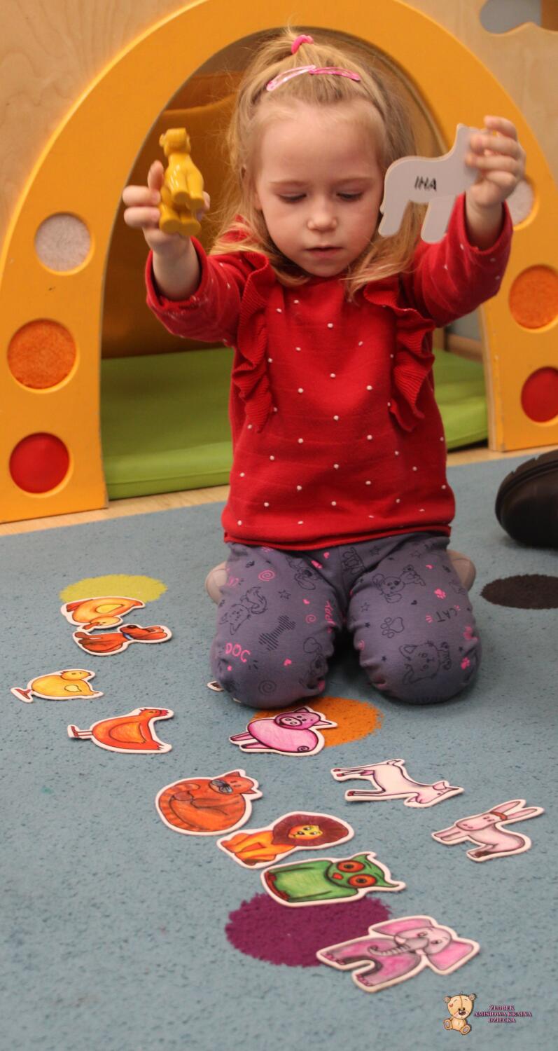 Dziś zwierzaki – moje pierwsze słowa. Uczyliśmy się polecenia pokaż taki sam . Dzieci wybierały zwierzęta które miały przedstawione na kartonikach próbując je nazywać
