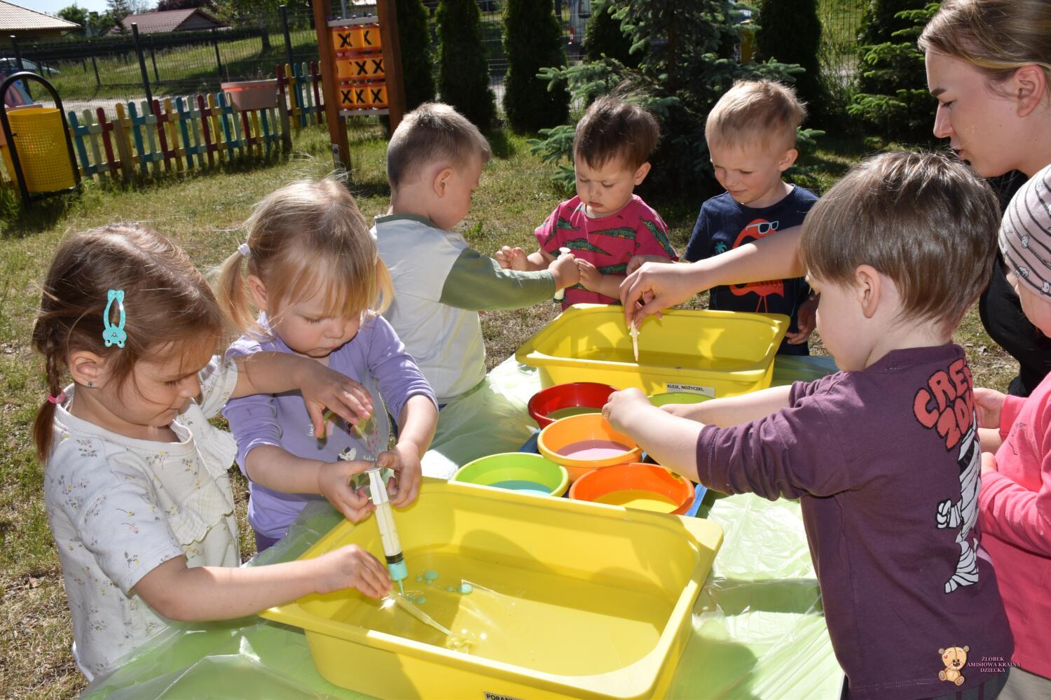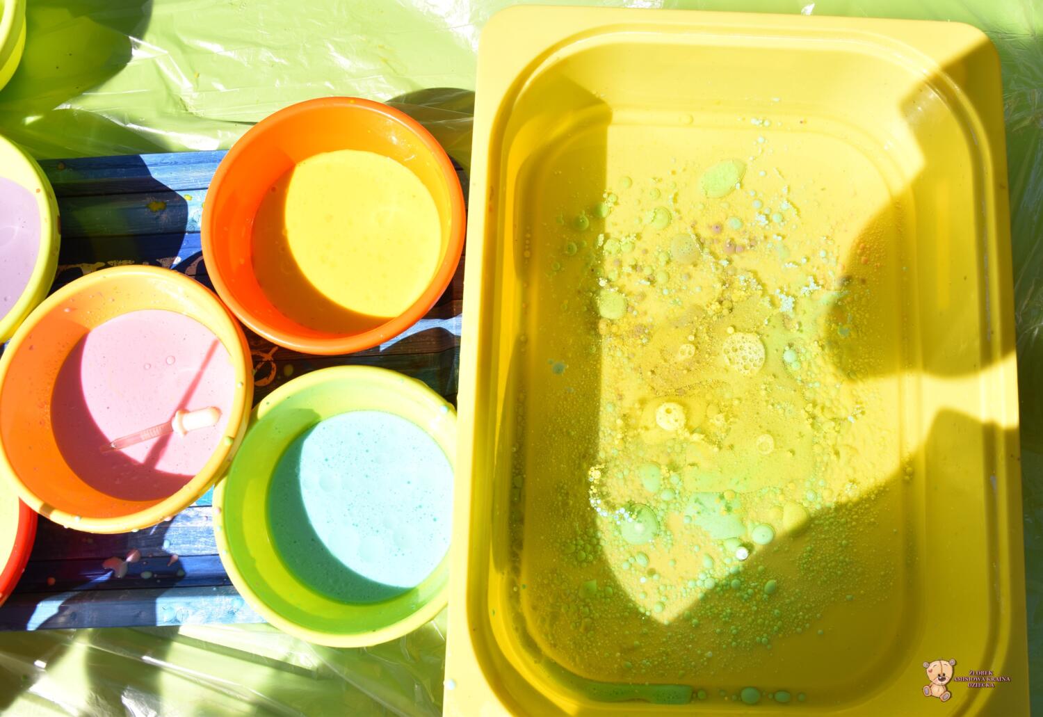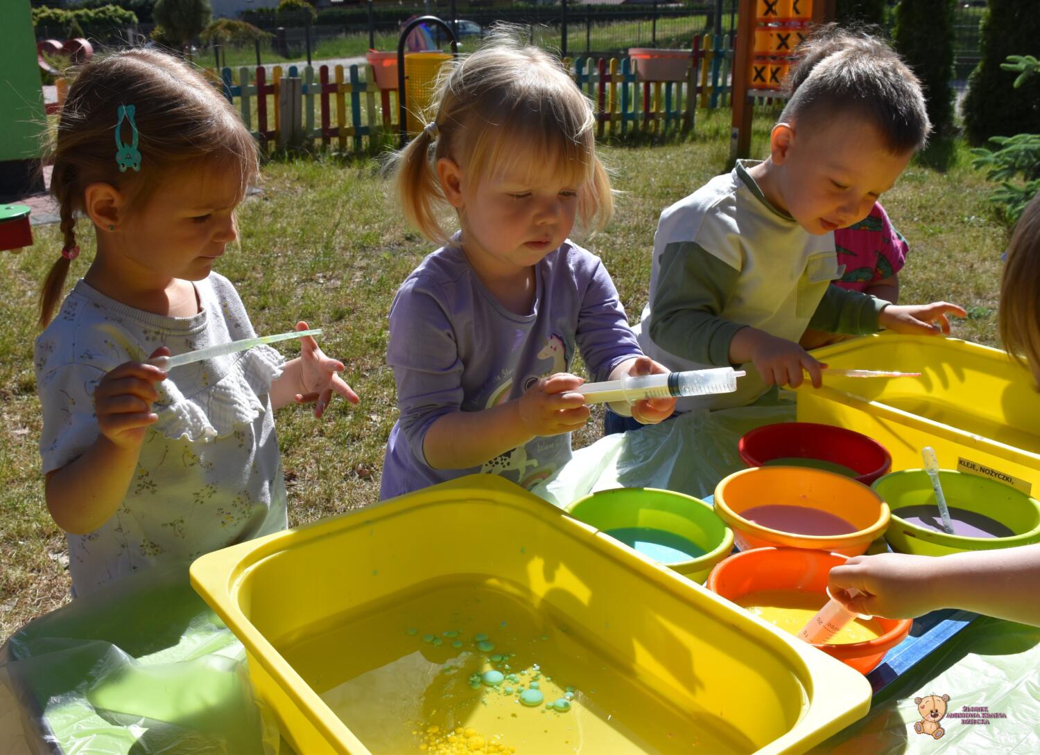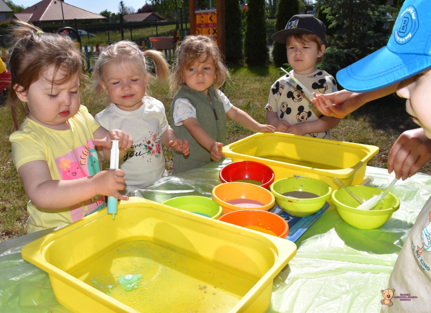Z racji ładnej pogody dzisiejsze zajęcia odbyły się na świeżym powietrzu🦋☀️Ciocia przygotowała w dużych pojemnikach olej rzepakowy, a w małych miseczkach mleko z dodatkiem barwnika🌈Ćwiczyliśmy chwyt pęsetowy- za pomocą pipet. Do dyspozycji mieliśmy również strzykawki, którymi po napełnieniu kolorowym mlekiem tworzyliśmy piękne, kolorowe wzory i kształty🫧🎨To były świetne zajęcia❣️