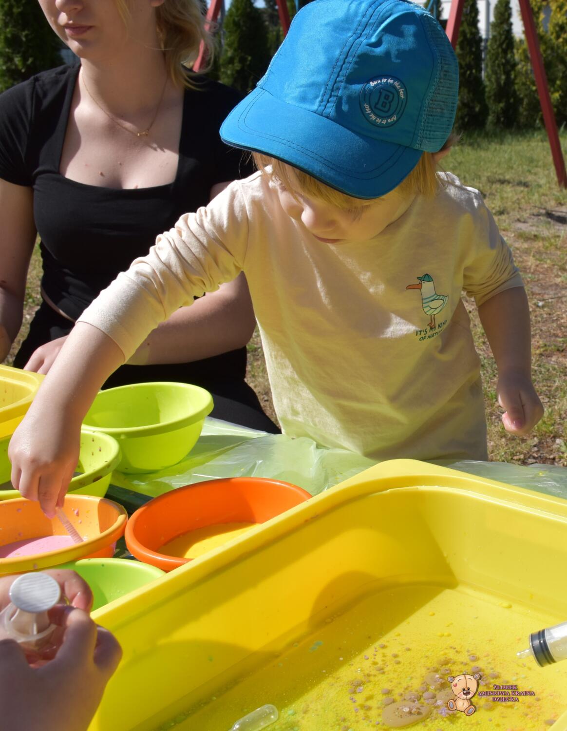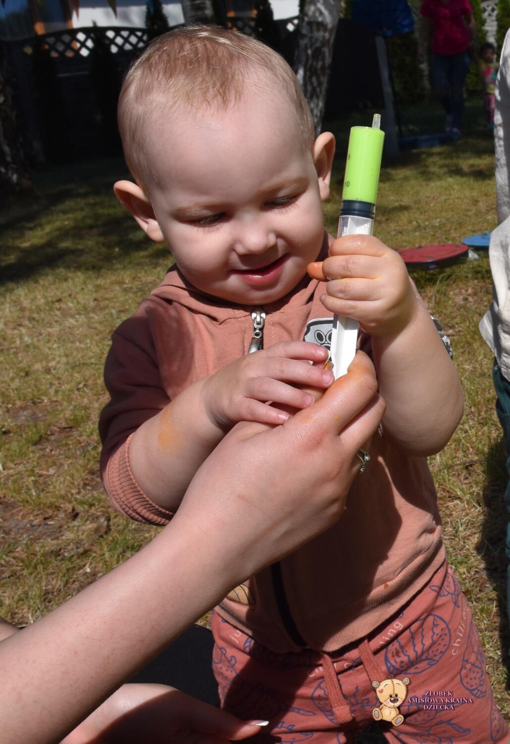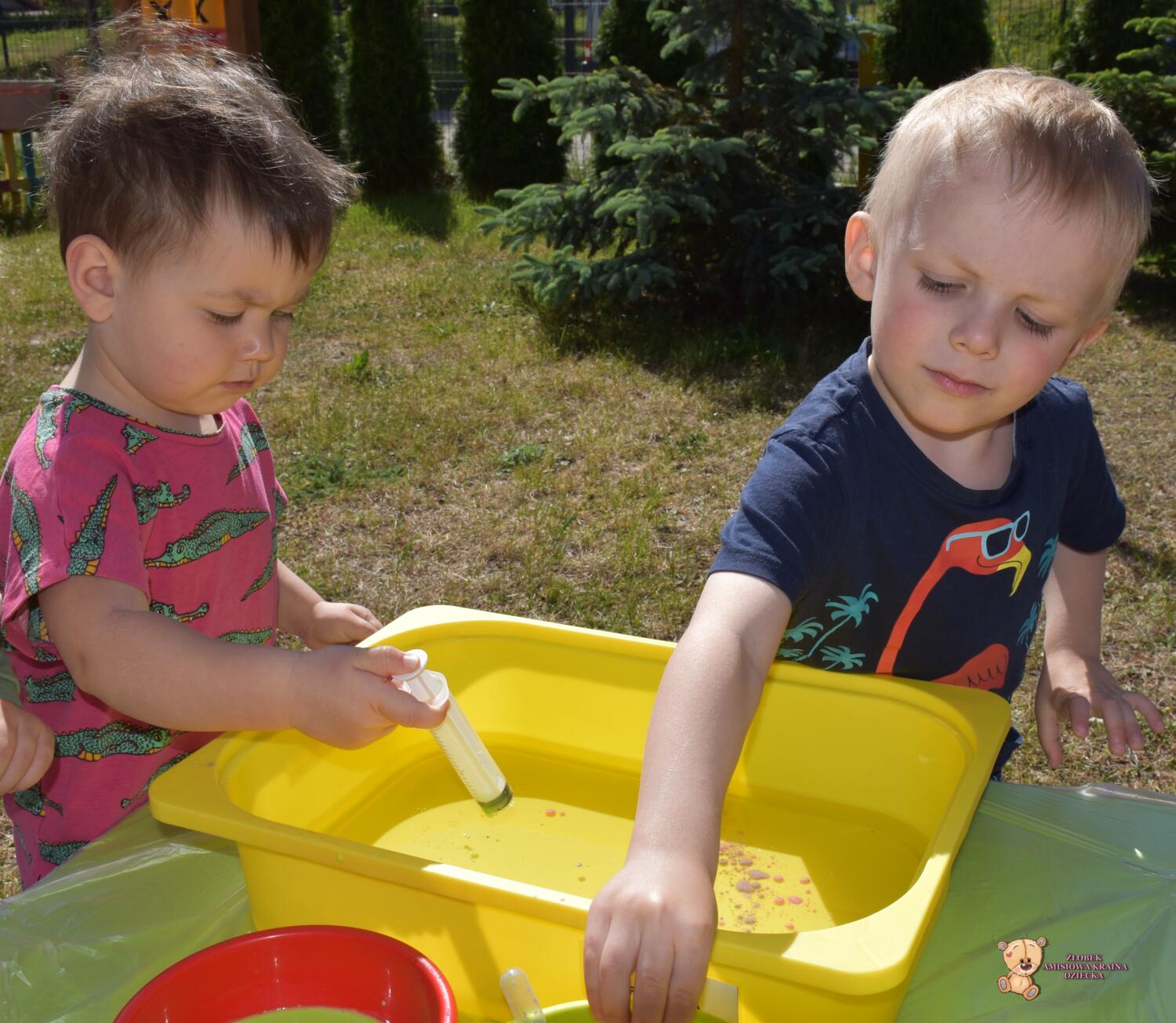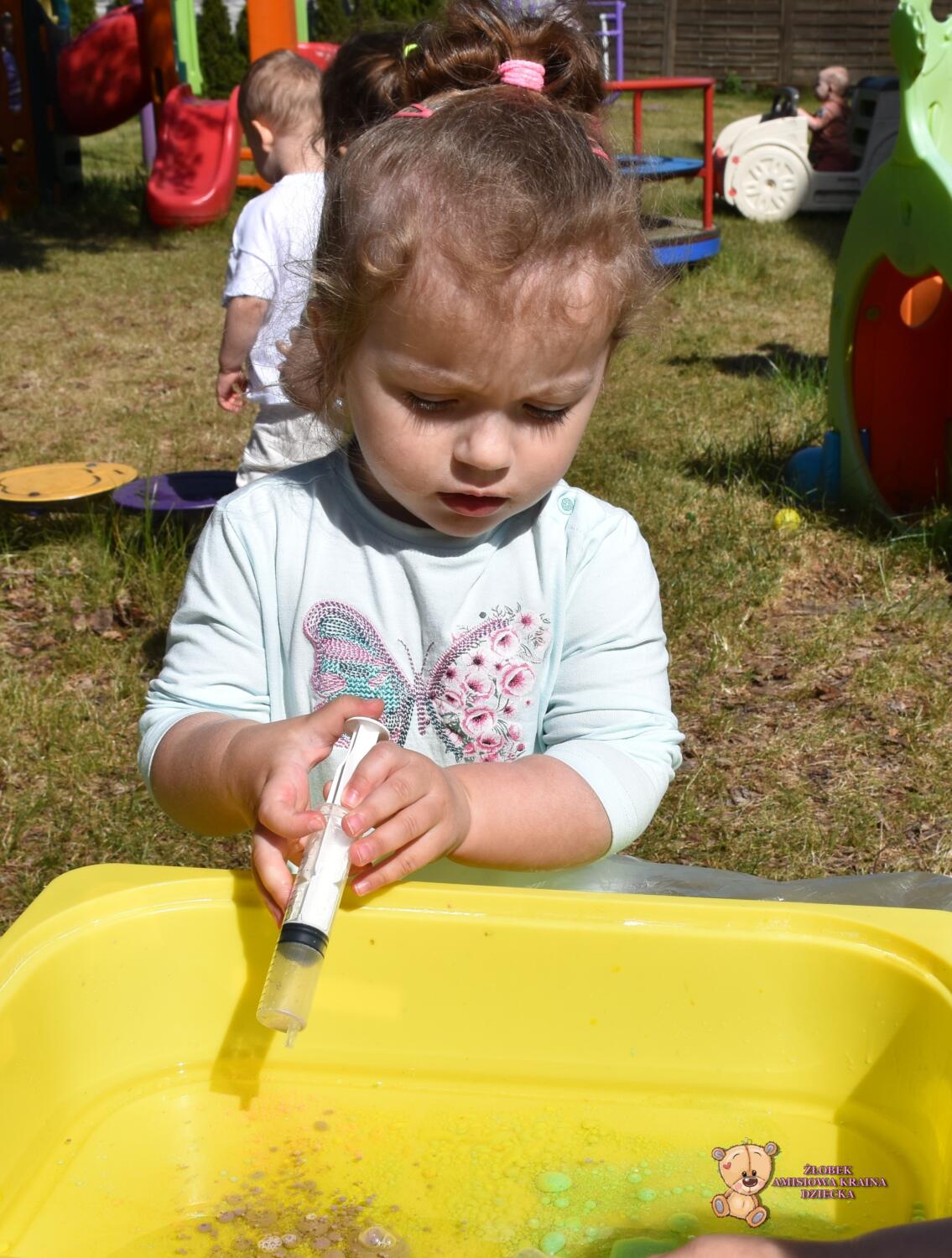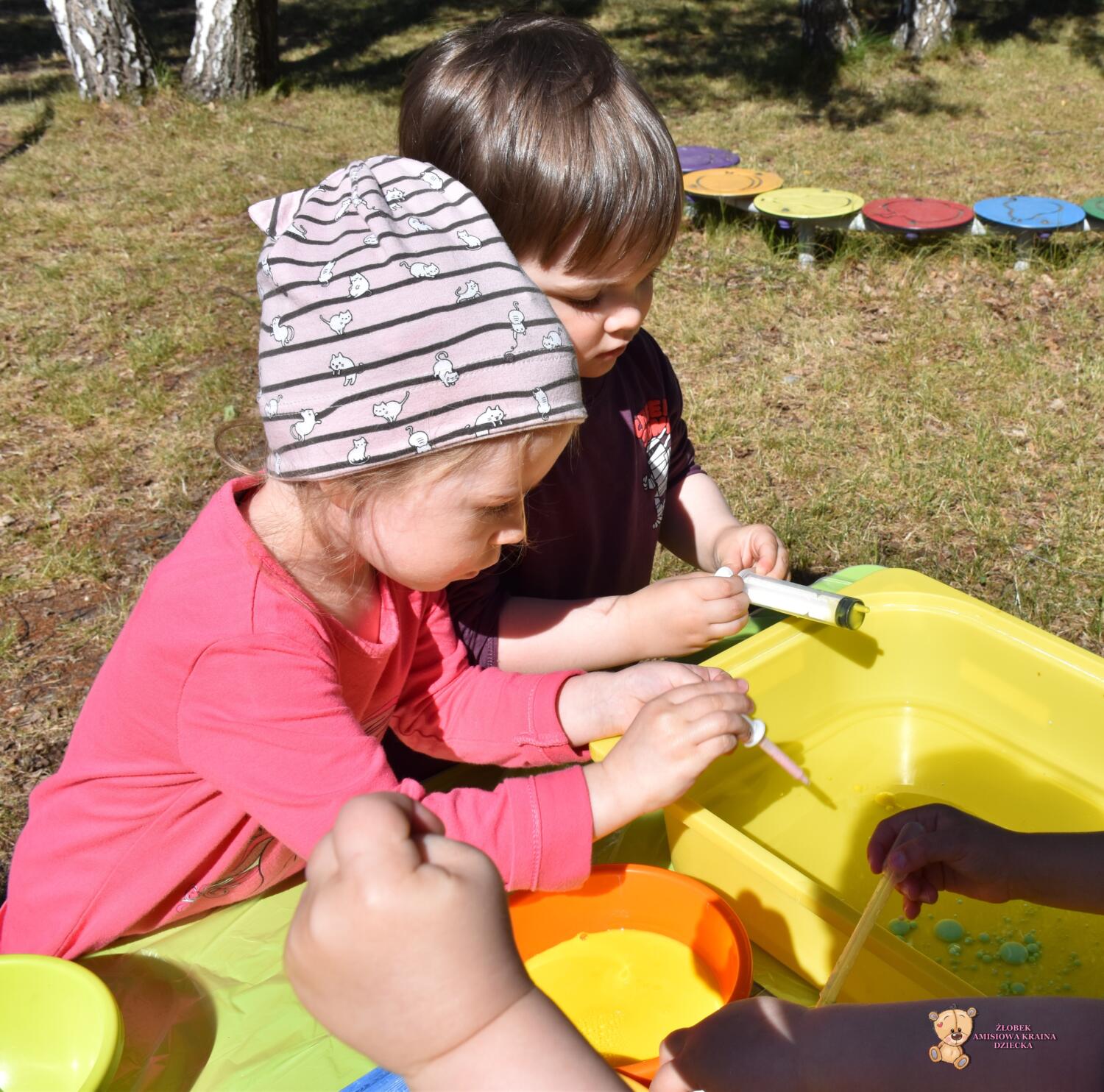Z racji ładnej pogody dzisiejsze zajęcia odbyły się na świeżym powietrzu🦋☀️Ciocia przygotowała w dużych pojemnikach olej rzepakowy, a w małych miseczkach mleko z dodatkiem barwnika🌈Ćwiczyliśmy chwyt pęsetowy- za pomocą pipet. Do dyspozycji mieliśmy również strzykawki, którymi po napełnieniu kolorowym mlekiem tworzyliśmy piękne, kolorowe wzory i kształty🫧🎨To były świetne zajęcia❣️