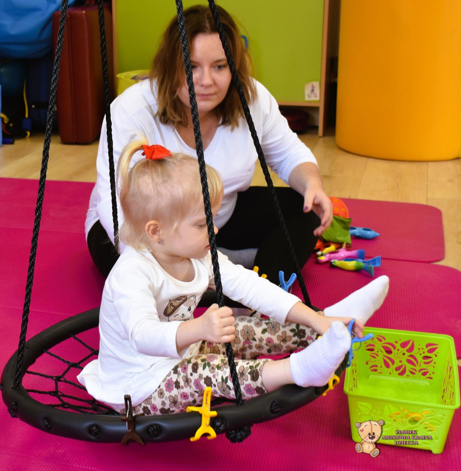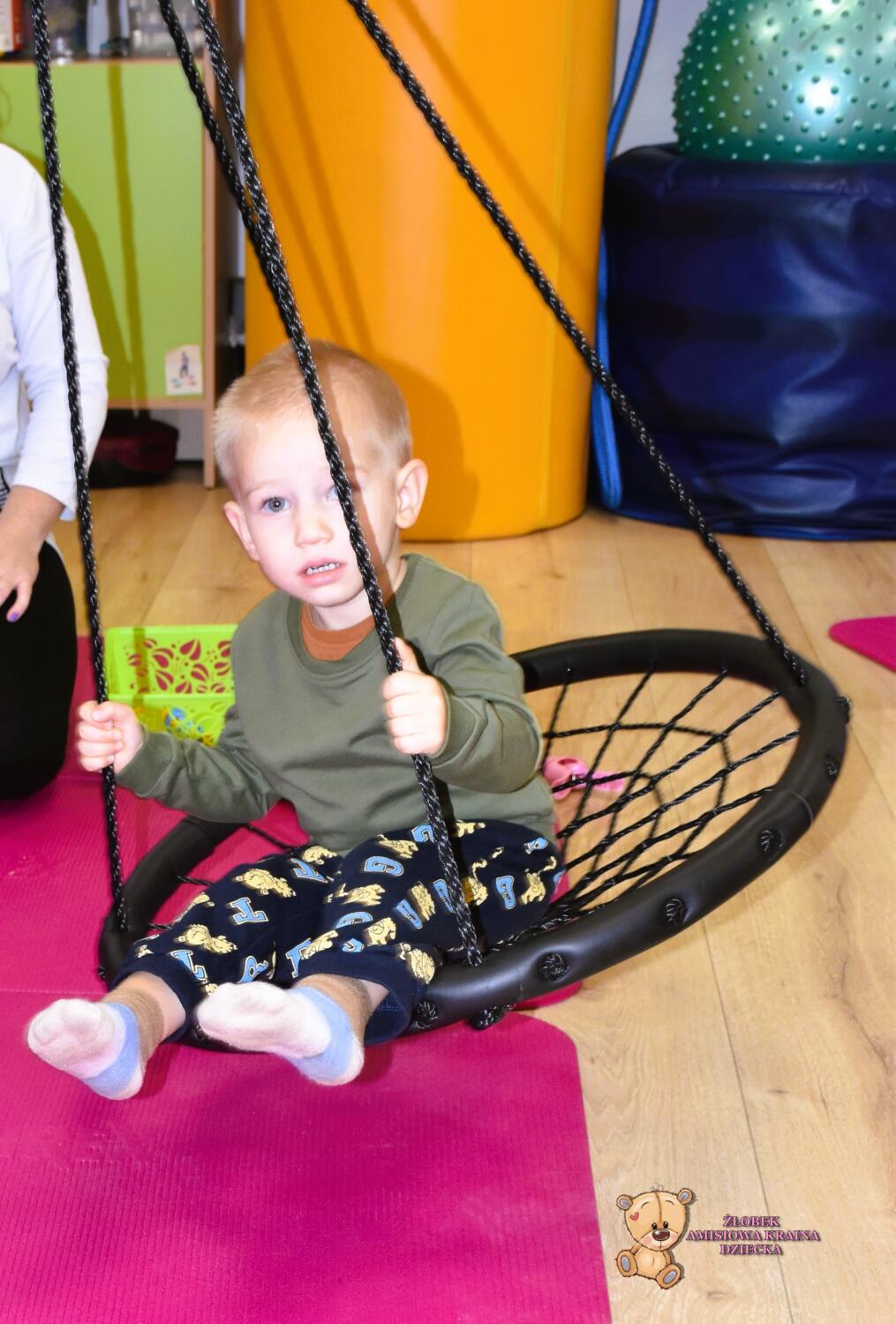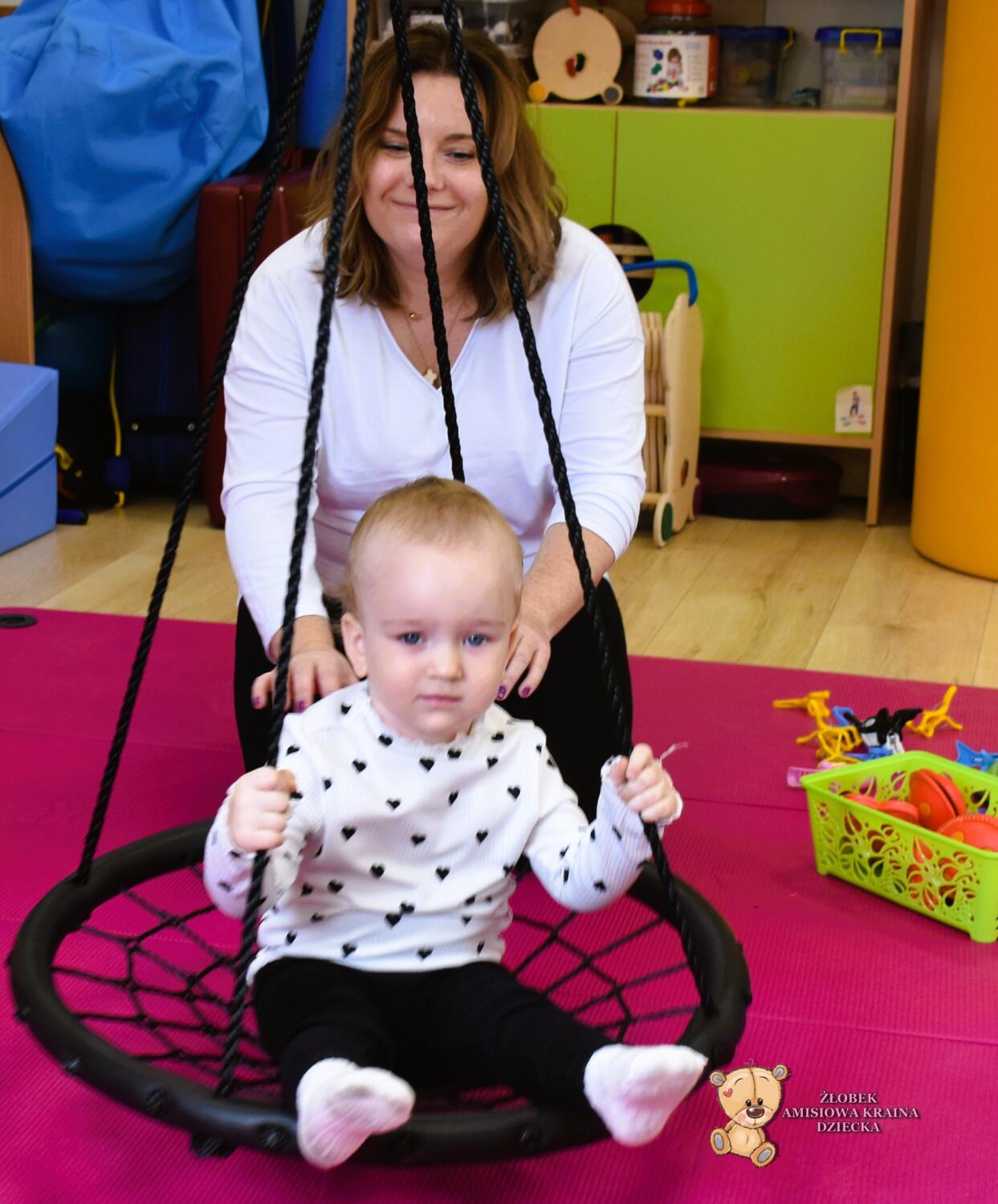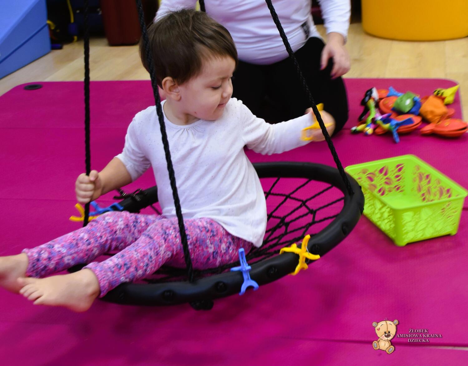 Dziś na zajęciach Integracji Sensorycznej stymulowaliśmy układ przedsionkowy na bocianim gnieździe. Amisiaki uczyły się wejść na huśtawkę, przyjąć prawidłową i komfortową pozycję ciała.Ciocia wprowadzała huśtawkę w ruch a Amisiaki wykonywały proste zadania manipulacyjne,koordynacyjne, precyzyjne. Podczas huśtania trzeba było utrzymać równowagę a na koniec bezpiecznie z niej zejść. Amisiaki lubią zajęcia na sprzętach podwieszanych, mają frajdę i super zabawę. Brawo!