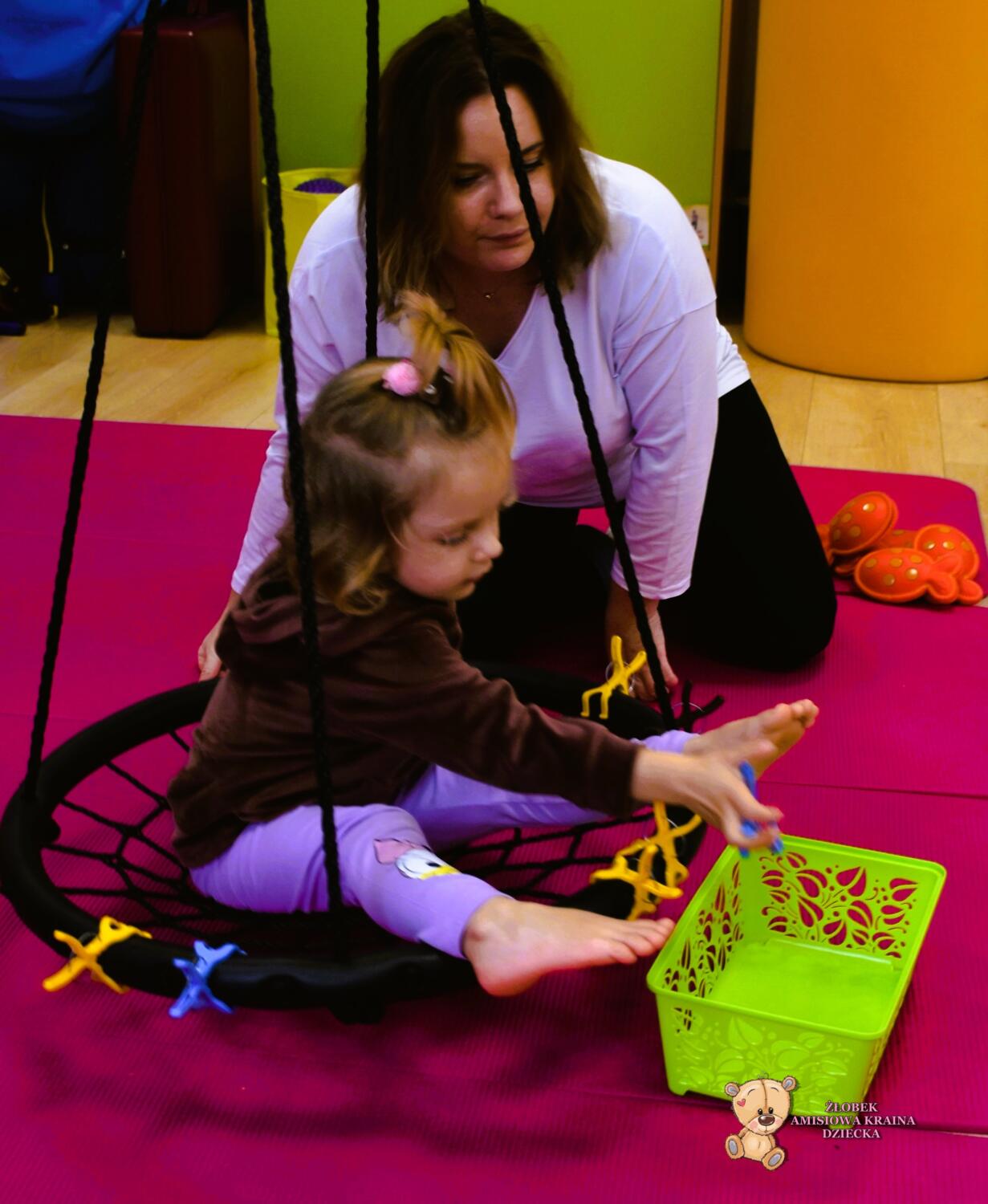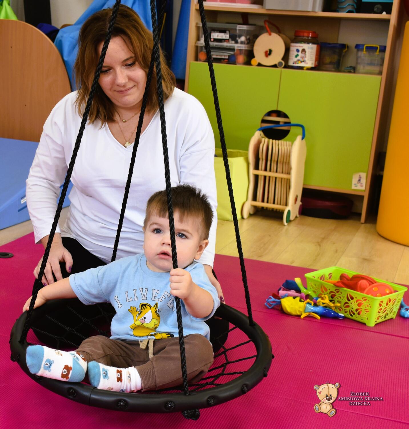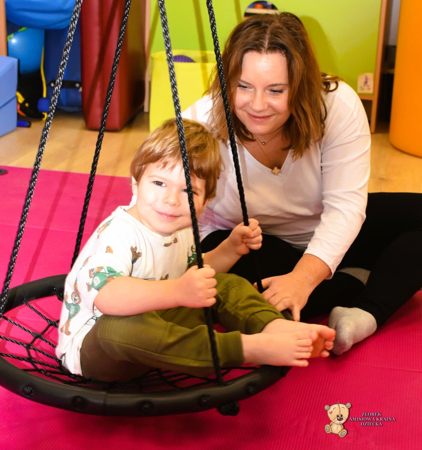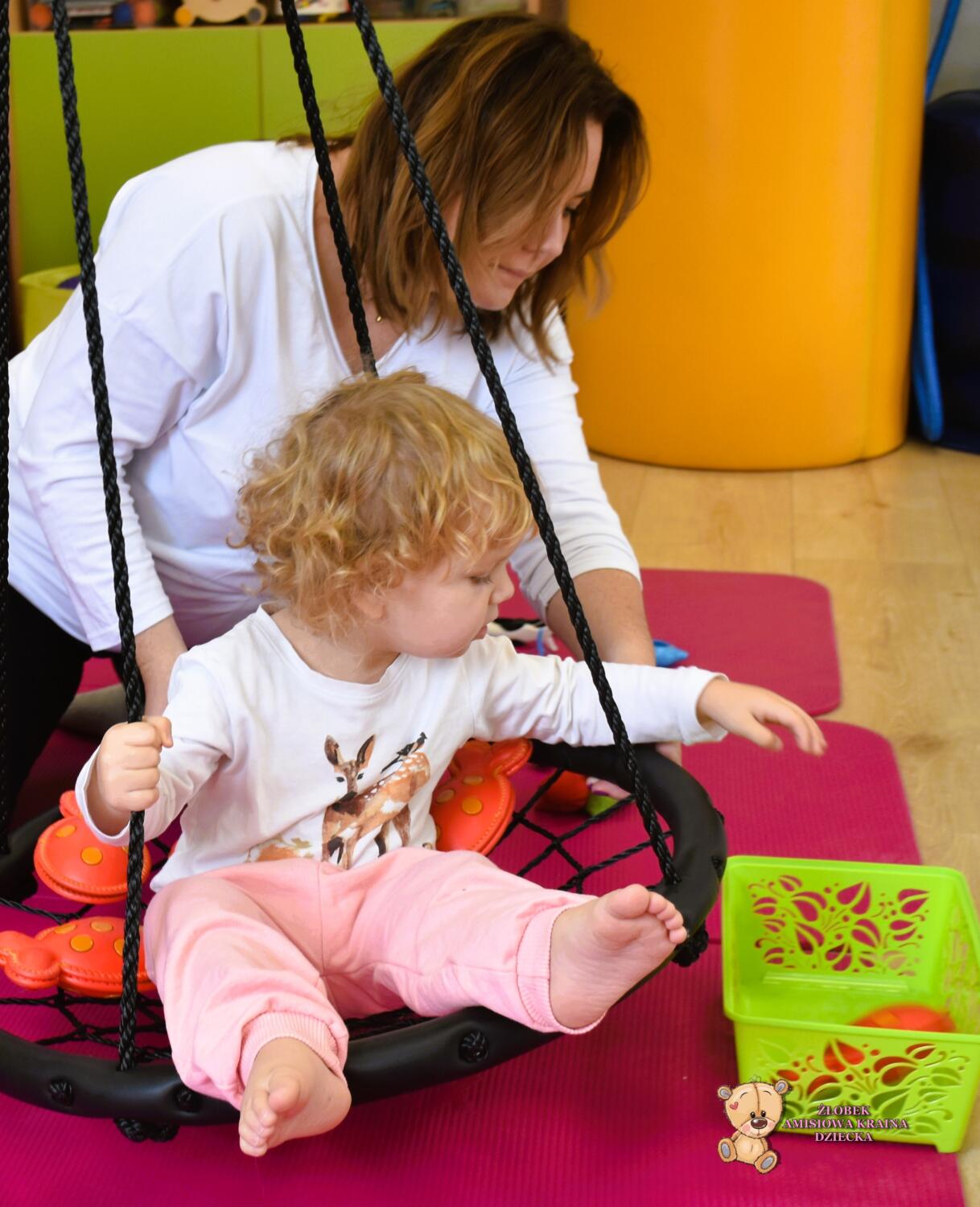 Dziś na zajęciach Integracji Sensorycznej stymulowaliśmy układ przedsionkowy na bocianim gnieździe. Amisiaki uczyły się wejść na huśtawkę, przyjąć prawidłową i komfortową pozycję ciała.Ciocia wprowadzała huśtawkę w ruch a Amisiaki wykonywały proste zadania manipulacyjne,koordynacyjne, precyzyjne. Podczas huśtania trzeba było utrzymać równowagę a na koniec bezpiecznie z niej zejść. Amisiaki lubią zajęcia na sprzętach podwieszanych, mają frajdę i super zabawę. Brawo!